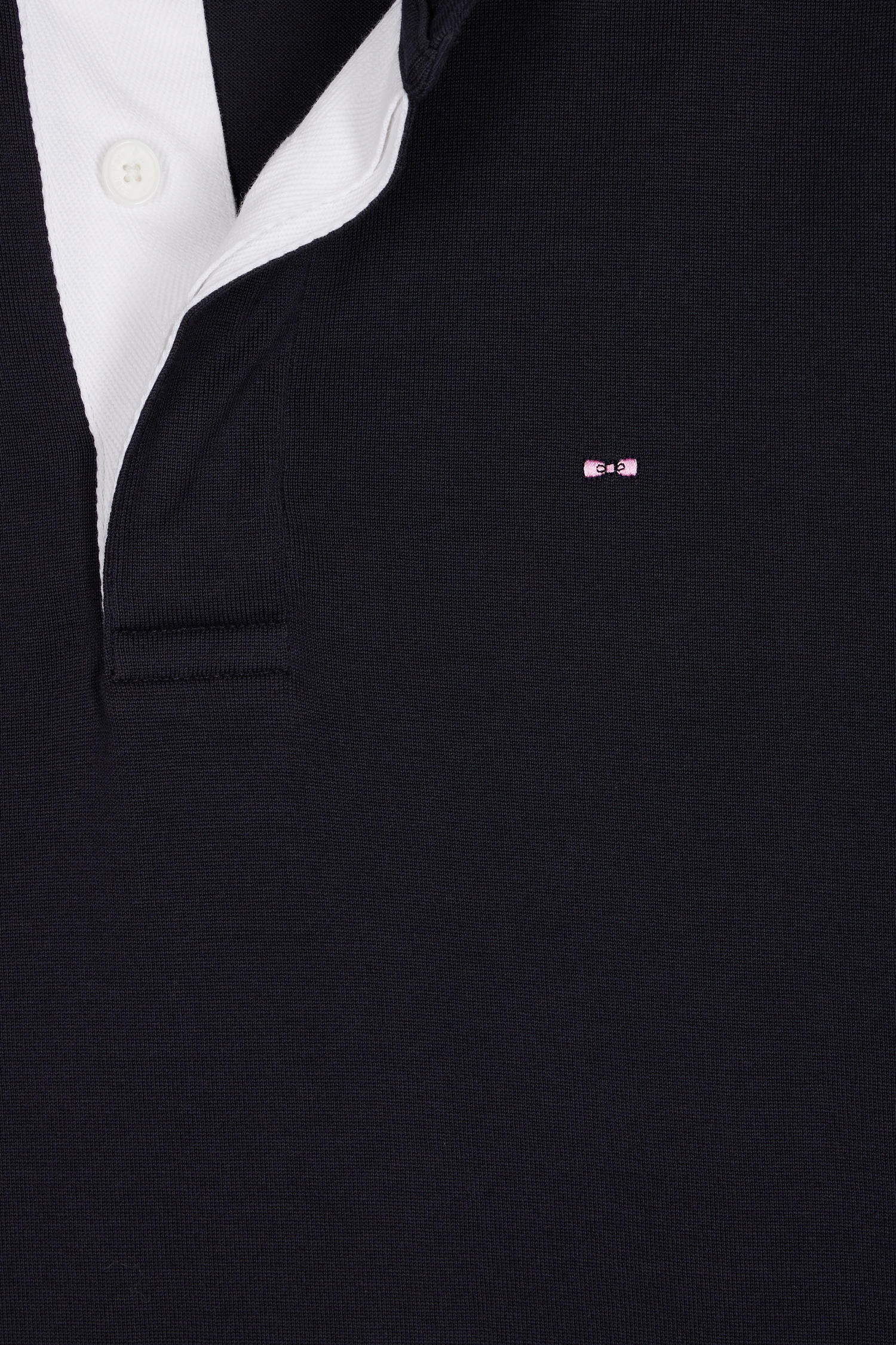 4-thread-count Pima cotton jersey and a straight cut finished with flat-knit ribbing give this long-sleeved jersey a long-lasting fit. The white-lined button placket and navy collar provide an elegant contrast, enhanced by a fine stripe under-collar. A comfortable, timeless sport-chic model designed for the modern man.