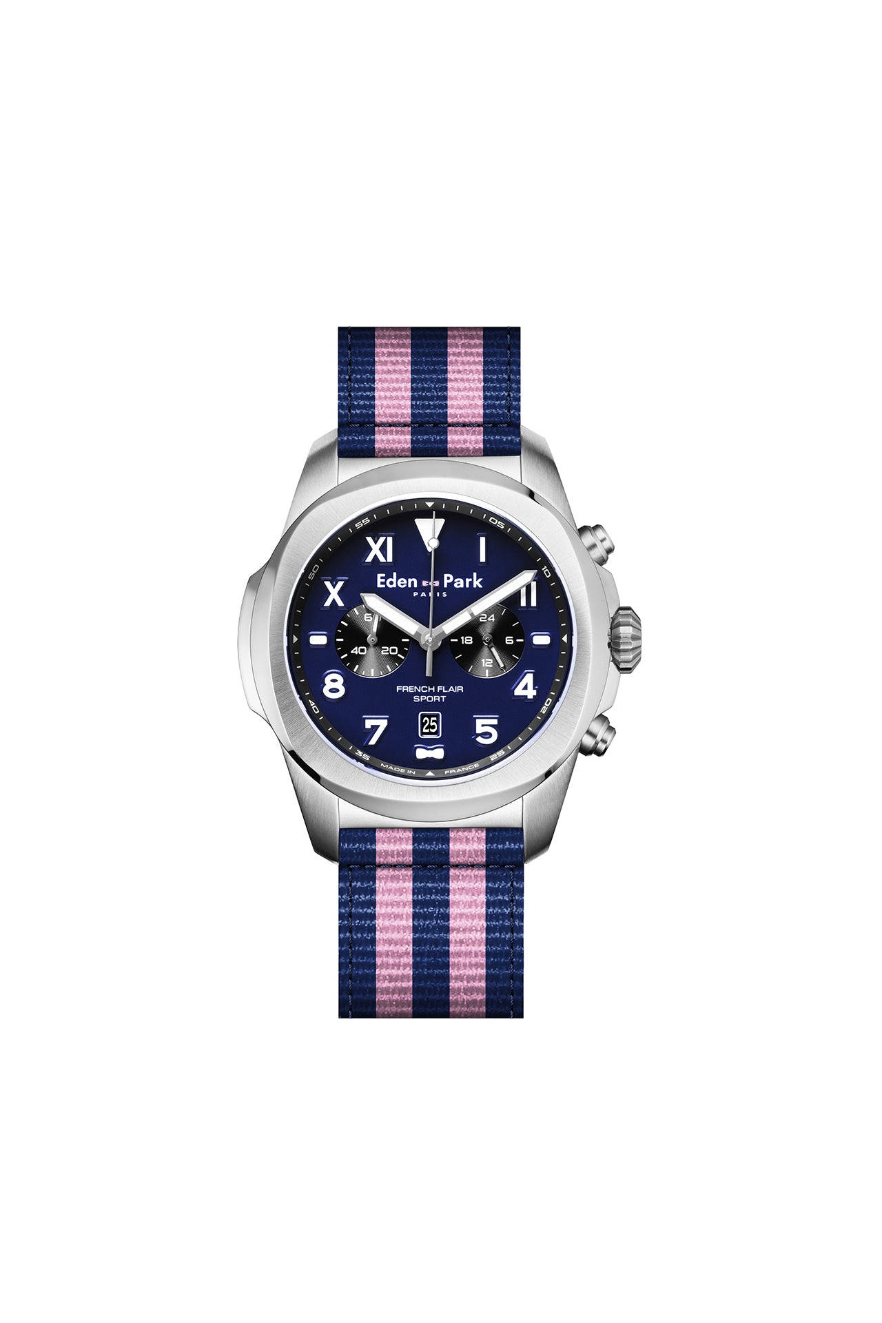 Conçue par la Maison Herbelin, horloger de renom, cette montre sportive à quartz se distingue par son cadran bleu profond orné d'index, de chiffres romains et arabes, pour un affichage sophistiqué et original. Le boîtier forme coussin en acier argenté de 43 mm encadre un cadran fond bleu aussi technique que précis, équipé de deux compteurs chronographes et d'une indication de la date sur fonds noirs. Sa couronne large en acier argenté cranté permet une mise à l'heure en un seul geste. Le bracelet NATO rayé bleu et rose, code signature de notre Maison française, ajoute une touche moderne et audacieuse à ce bijou de technicité horlogère idéal pour la belle saison.
