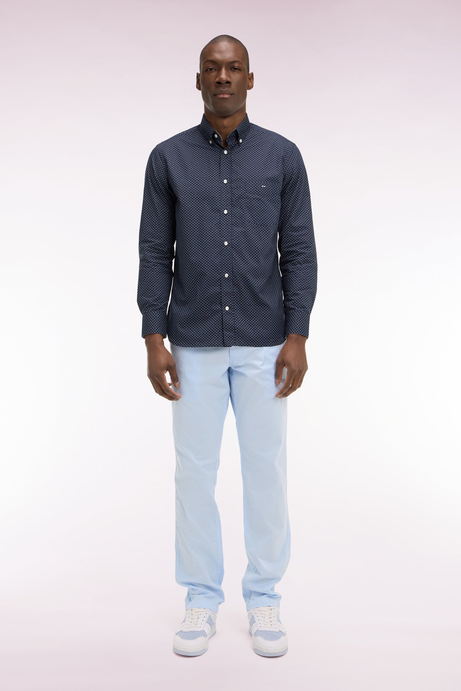 Ce chino pour homme en gabardine de coton stretch allie confort et style. Il comporte des poches latérales italiennes et des poches dos double passepoil, ainsi qu'un ruban ottoman tricolore sur la poche arrière. Disponible en plusieurs coloris intemporels et estivaux, ce pantalon chino est proposé dans une coupe regular droite pour une allure décontractée et plus d'aisance.