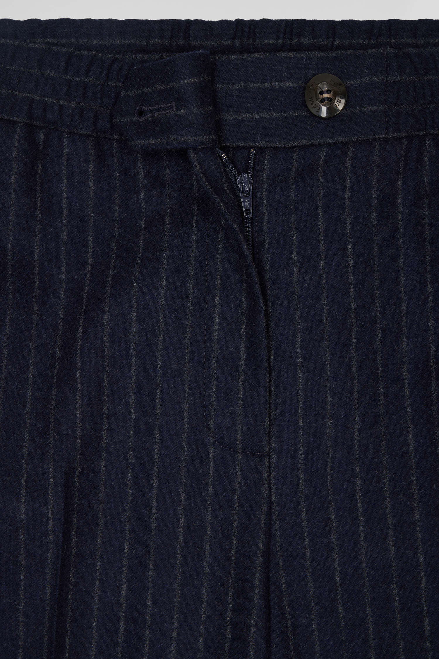 These chalk-striped pants in noble wool are the perfect embodiment of functional elegance. Featuring an elasticated waistband for optimum comfort, they have a long, straight cut that elongates the silhouette. The waistband and horn-effect buttons add a touch of refinement to these feminine pants. The matching blazer jacket is available, allowing these suit pants to be worn as a total look for a sophisticated, modern silhouette inspired by men's tailoring.