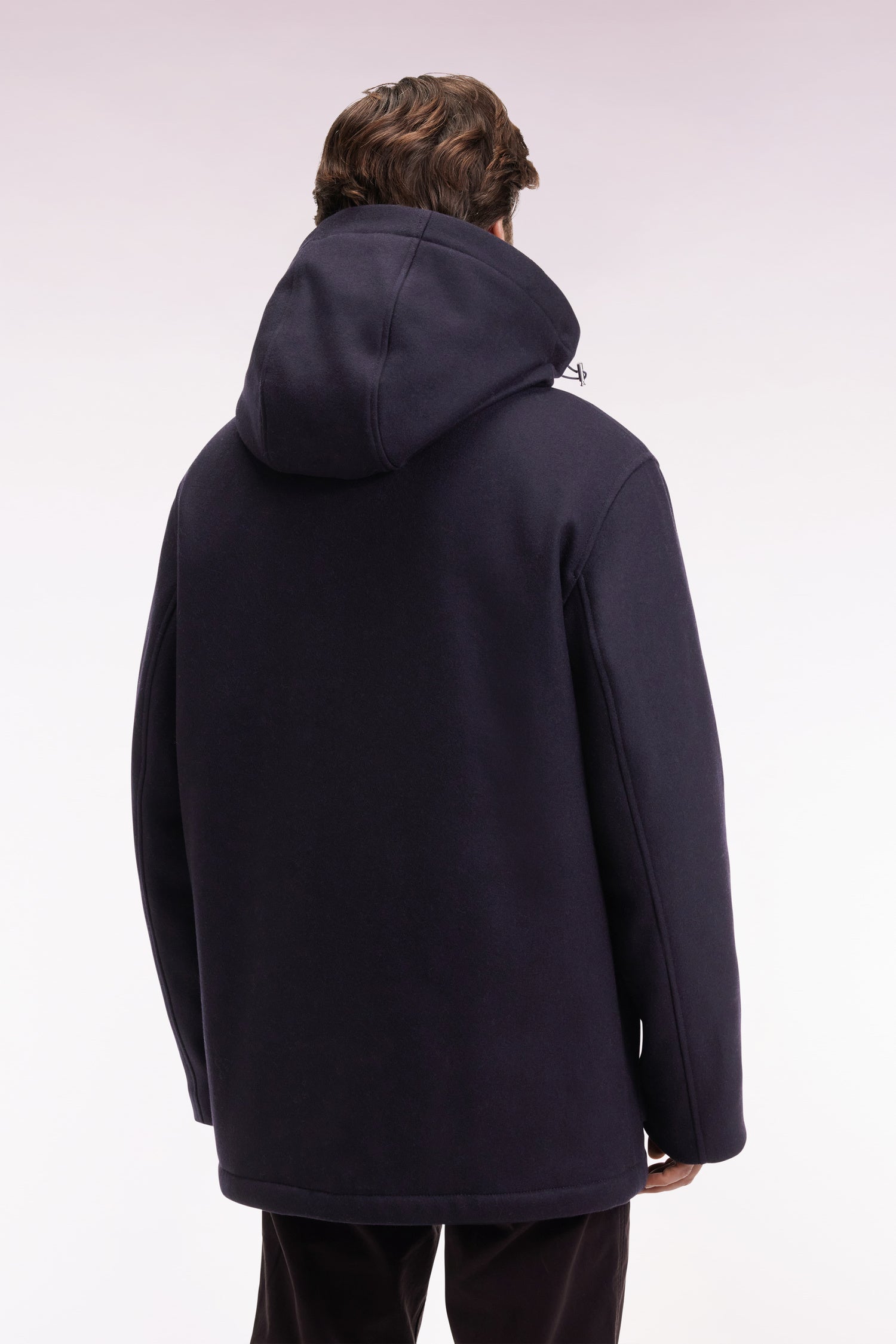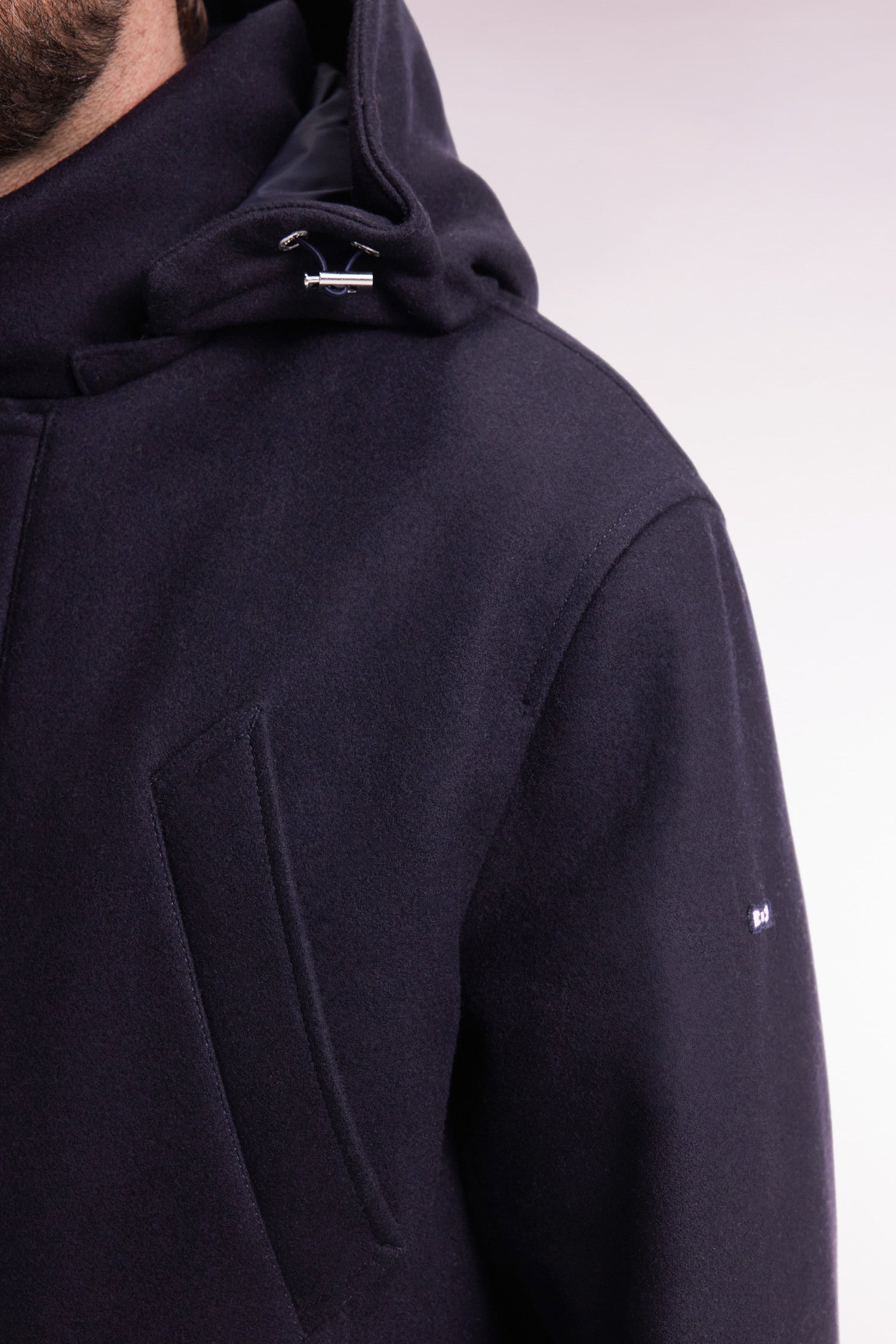 Designed to face the urban winter with elegance, this short men's parka in navy wool and cashmere mix revisits the outdoor wardrobe in a chic, structured version. Its detachable hood, comfortable nylon quilted lining and concealed zip fastening under the button placket guarantee warmth, functionality and elegance. Flap pockets, meticulous finishing and a pink rubber bowtie emblem on the sleeve create a sleek, stylish silhouette for this winter and beyond.