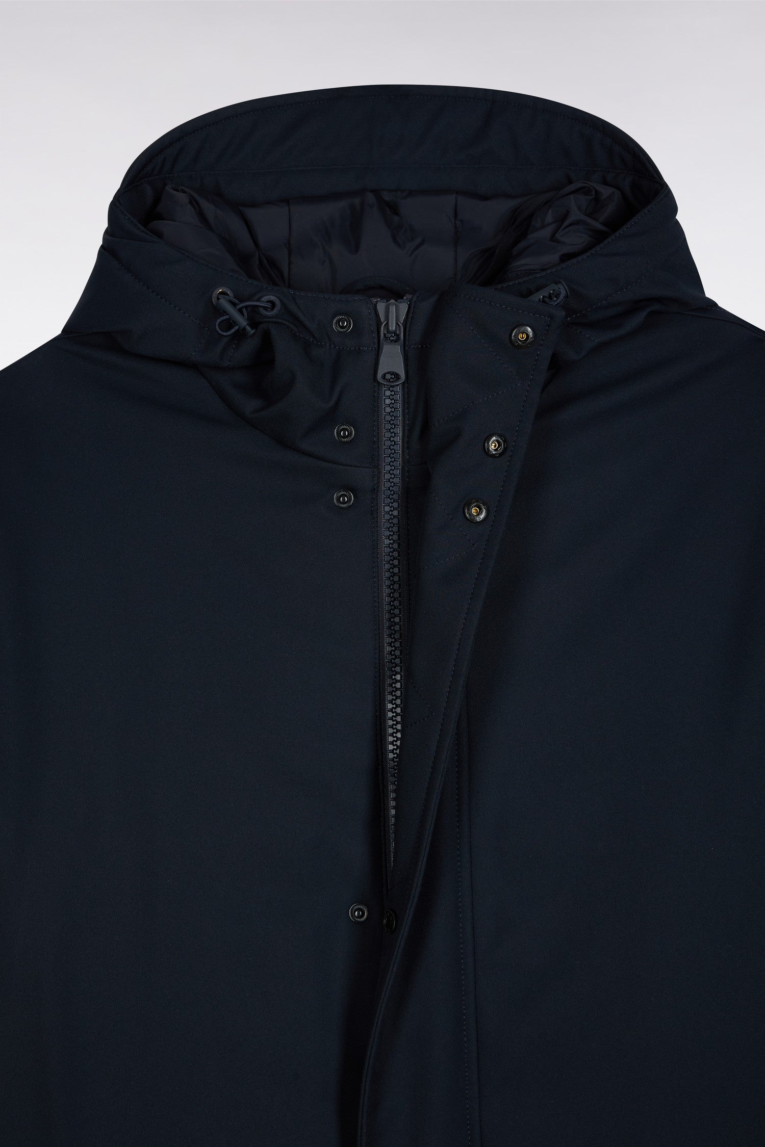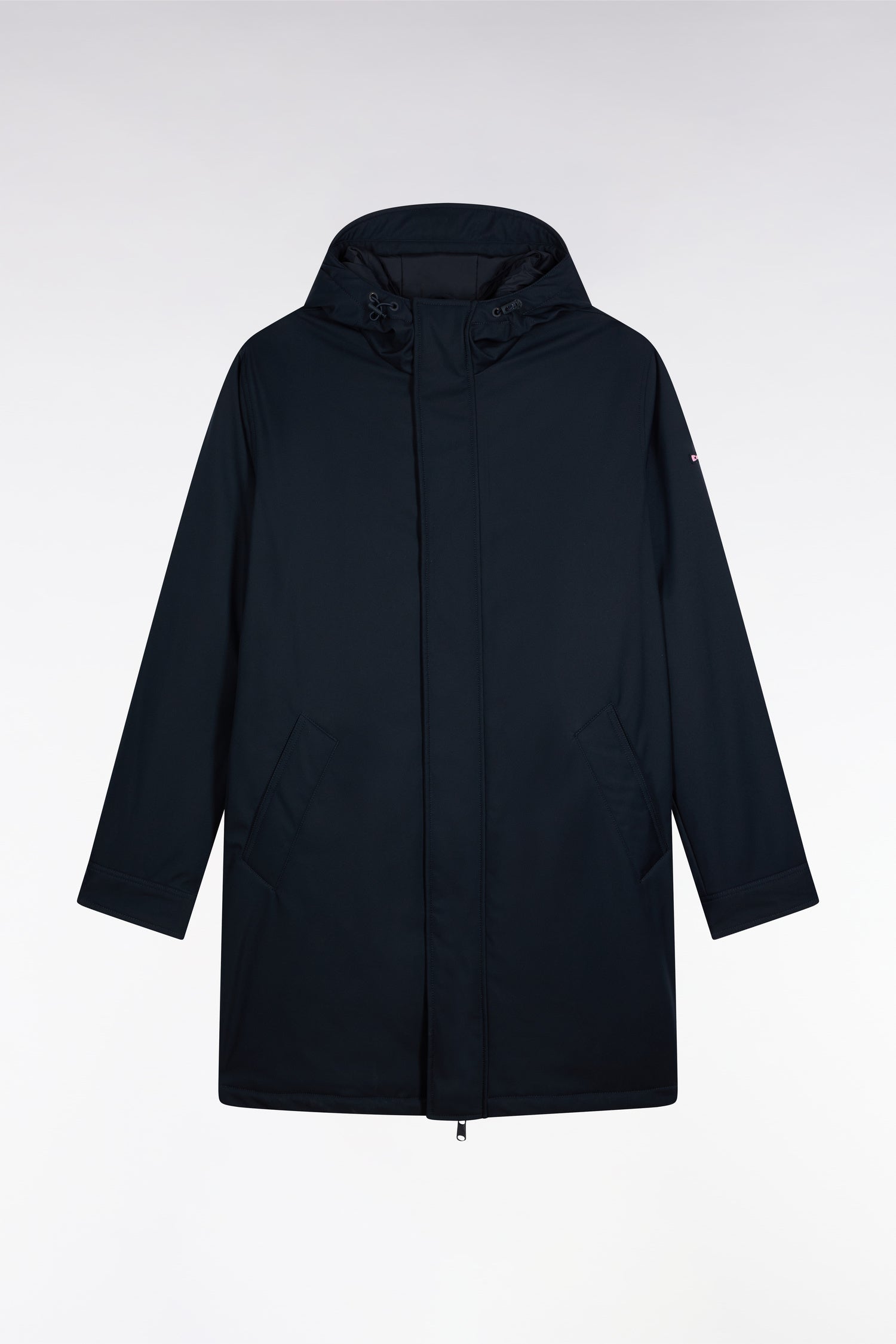 Available in navy, khaki or black, this long matte nylon parka embodies the perfect balance between urban sobriety and protection against the elements. Its interior quilting provides ideal thermal comfort for mid-season and winter alike. Its silhouette adjusts with a discreet drawstring at the back and hood. The double-zip concealed under the button placket, practical pockets and iconic finishing reinforce the functional, refined look of this men's parka with soft-touch supplies.