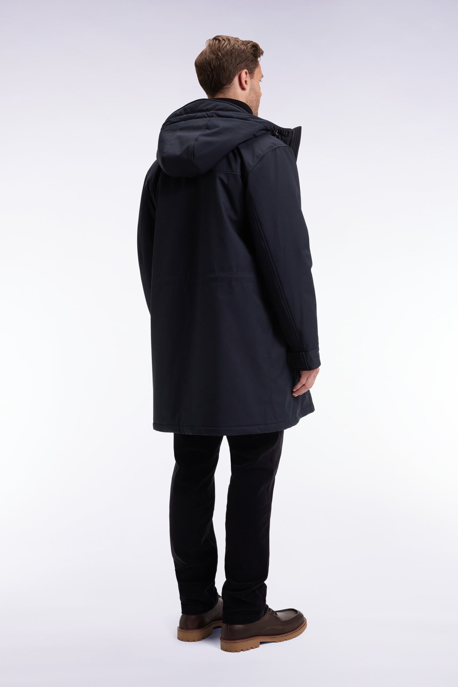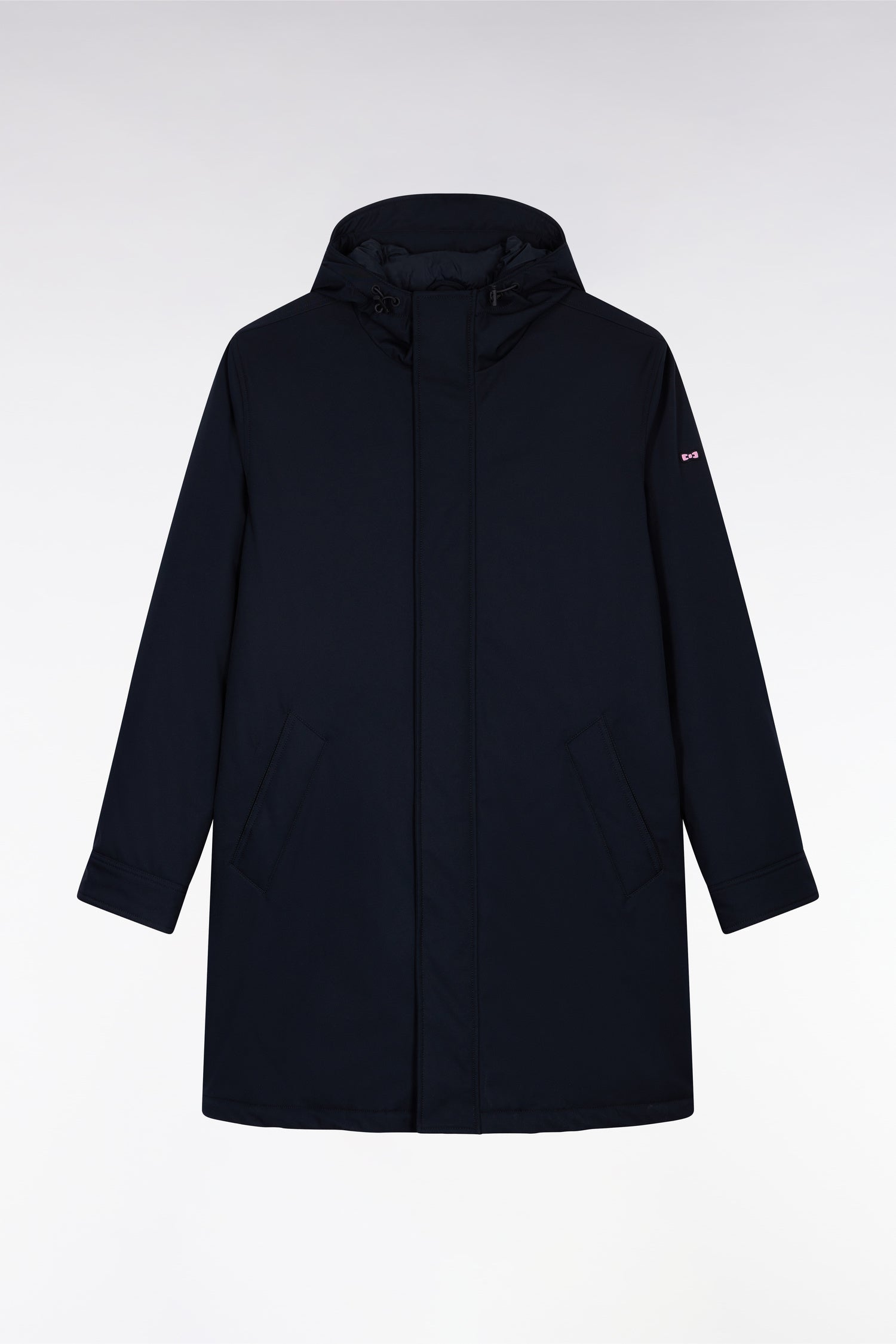 Available in navy, khaki or black, this long matte nylon parka embodies the perfect balance between urban sobriety and protection against the elements. Its interior quilting provides ideal thermal comfort for mid-season and winter alike. Its silhouette adjusts with a discreet drawstring at the back and hood. The double-zip concealed under the button placket, practical pockets and iconic finishing reinforce the functional, refined look of this men's parka with soft-touch supplies.