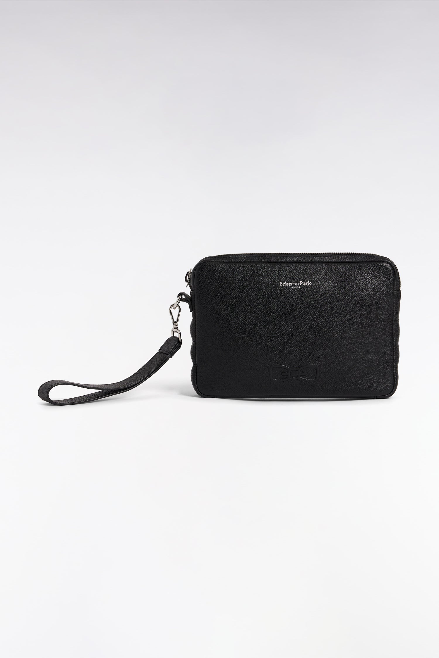 Cette pochette au porter main est confectionnée en cuir grainé noir. Elle propose une silhouette compacte et élégante et dispose d'une anse main amovible. Pensée pour transporter l’essentiel, elle conjugue praticité et raffinement, idéale pour un usage quotidien ou des déplacements urbains. Ses finitions matelassées, son logo argent et son nœud papillon embossé signent une allure chic et French Flair à la fois.