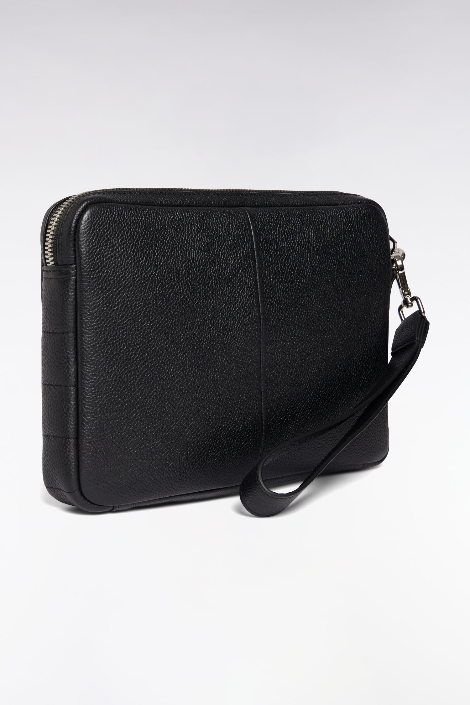 With its tone-on-tone bow-tie motif embossed on black grained leather and embossed logo accented with silver hues, this zippered pouch makes a statement of meticulous style down to the smallest detail. Its snap hook handle and generous capacity make it an ideal accessory from the office to the weekend.