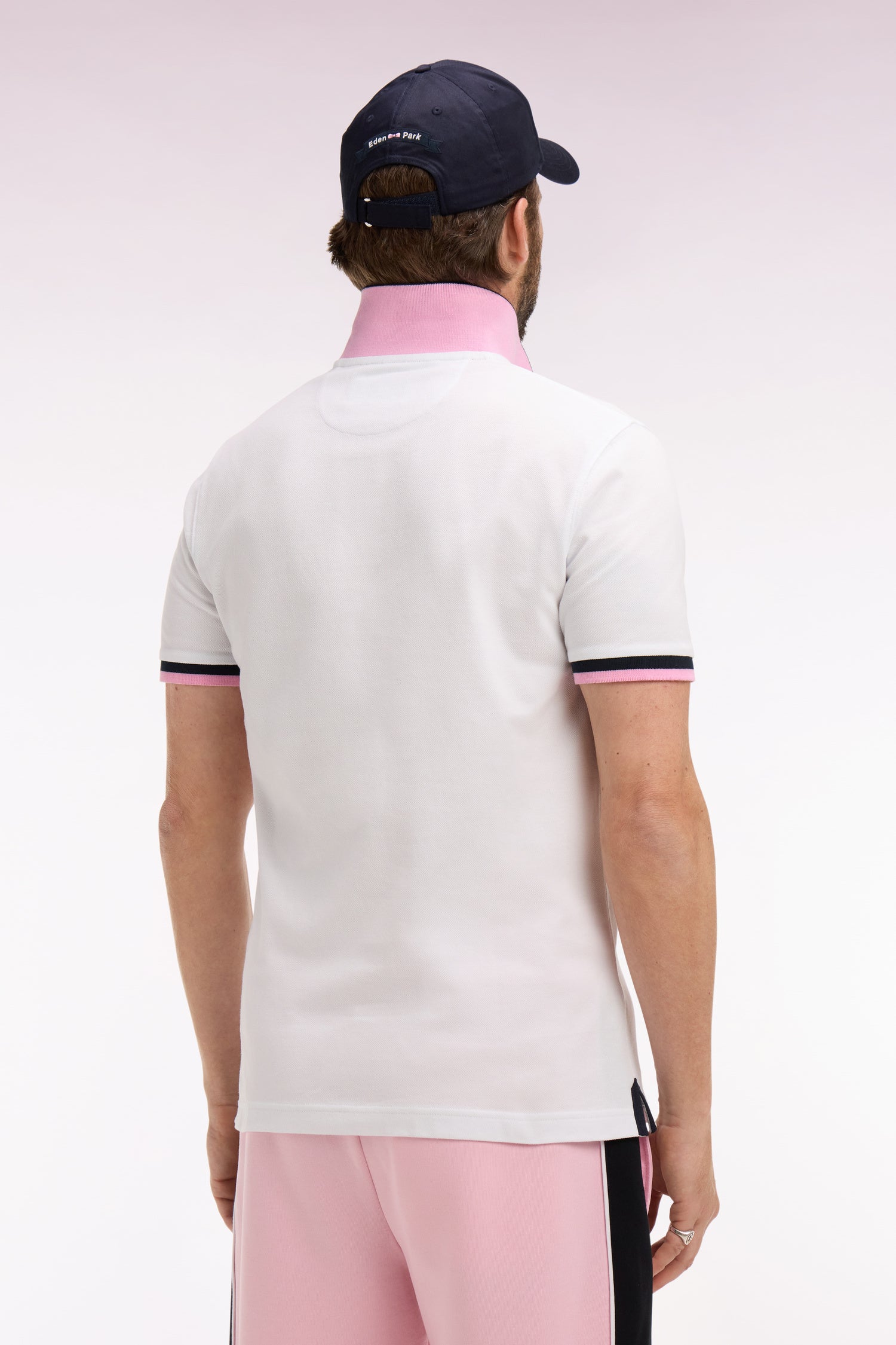 Ce polo en piqué de coton, issu de la ligne hommage au Tournoi des 6 Nations, référence de l'ovalie, se distingue par son corps uni et ses touches de couleurs sur le col et les bordures des manches. Disponible en blanc ou en rose, il présente des manches courtes finies par des bords-côtes rayés et un col polo marine à dessous de col ciel ou rose selon le modèle choisi. Un ruban herringbone parfait cette pièce au niveau de la plaquette de boutonnage et de ses fentes d'aisance, tandis qu'un écusson brodé vient compléter cette pièce sport-chic. I Col polo à dessous de col contrasté