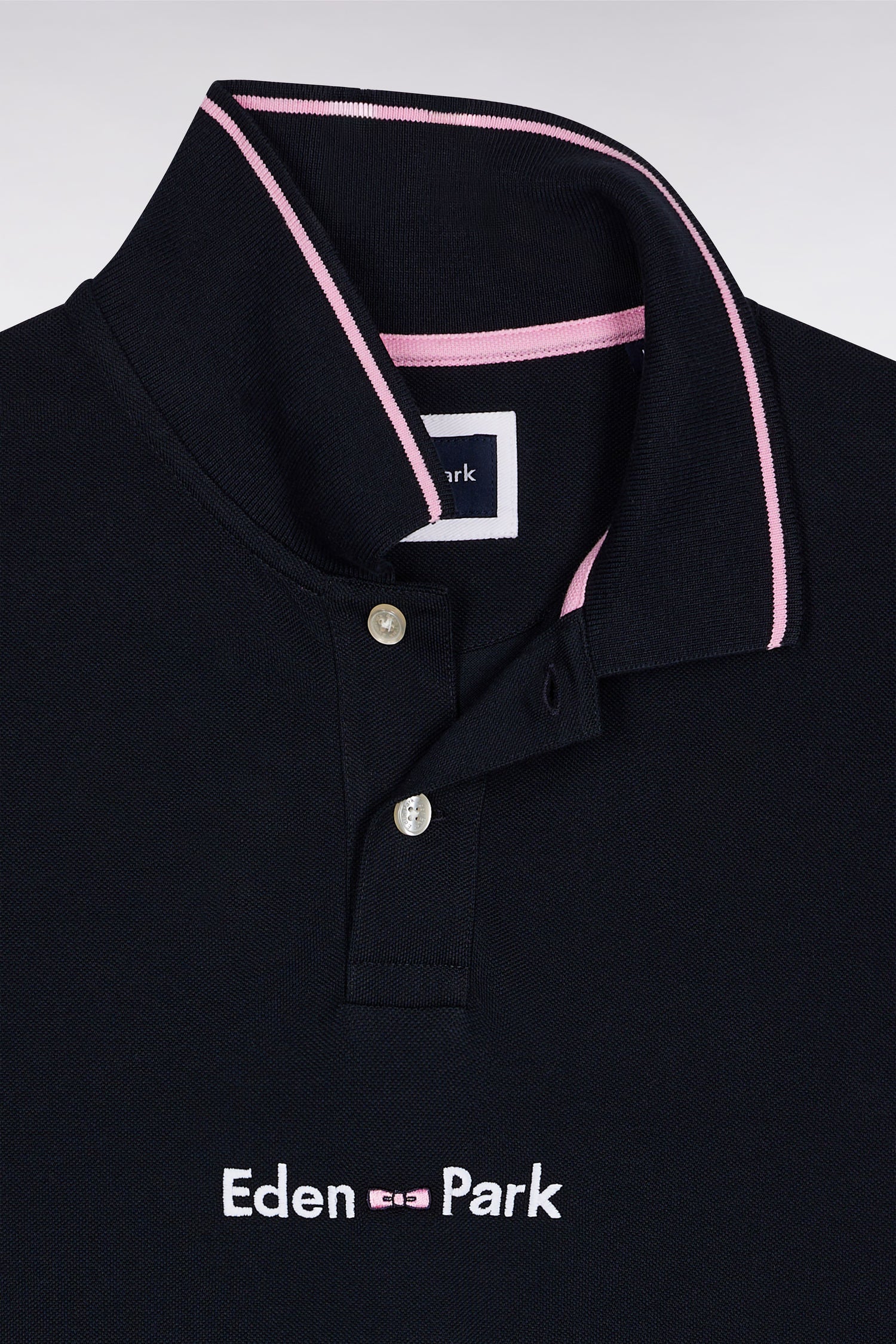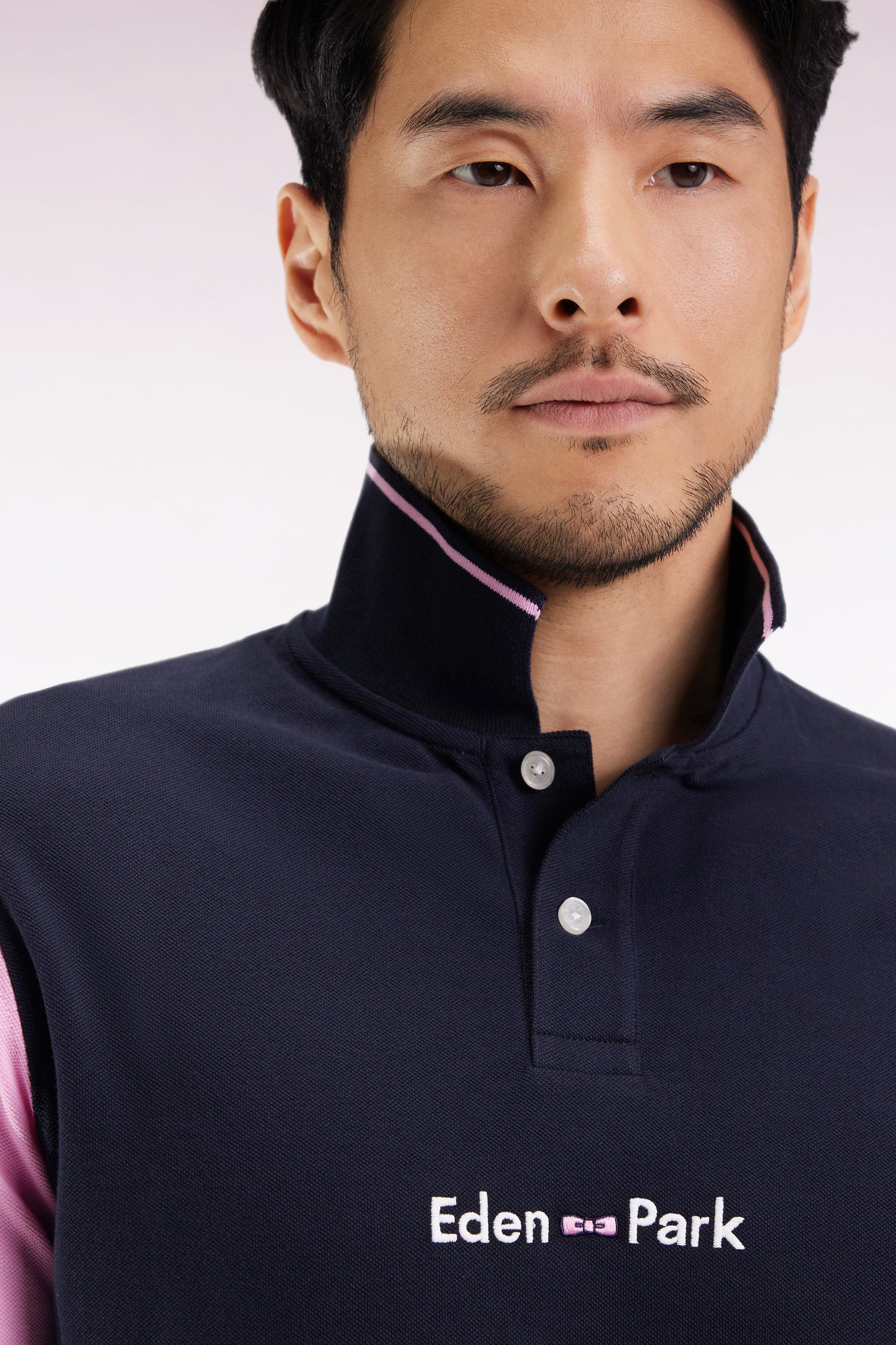 With its two-tone chords and front logo embroidery, this polo shirt is a signature piece in the spirit of the Eden Park collections. Its soft, breathable cotton piqué and straight cut make it a comfortable everyday piece. A fine, colorful stripe adorns the flat-knit ribbed cuffs and collar.