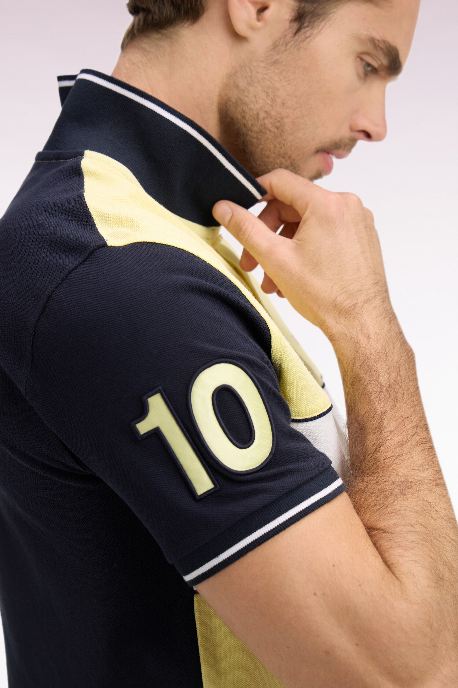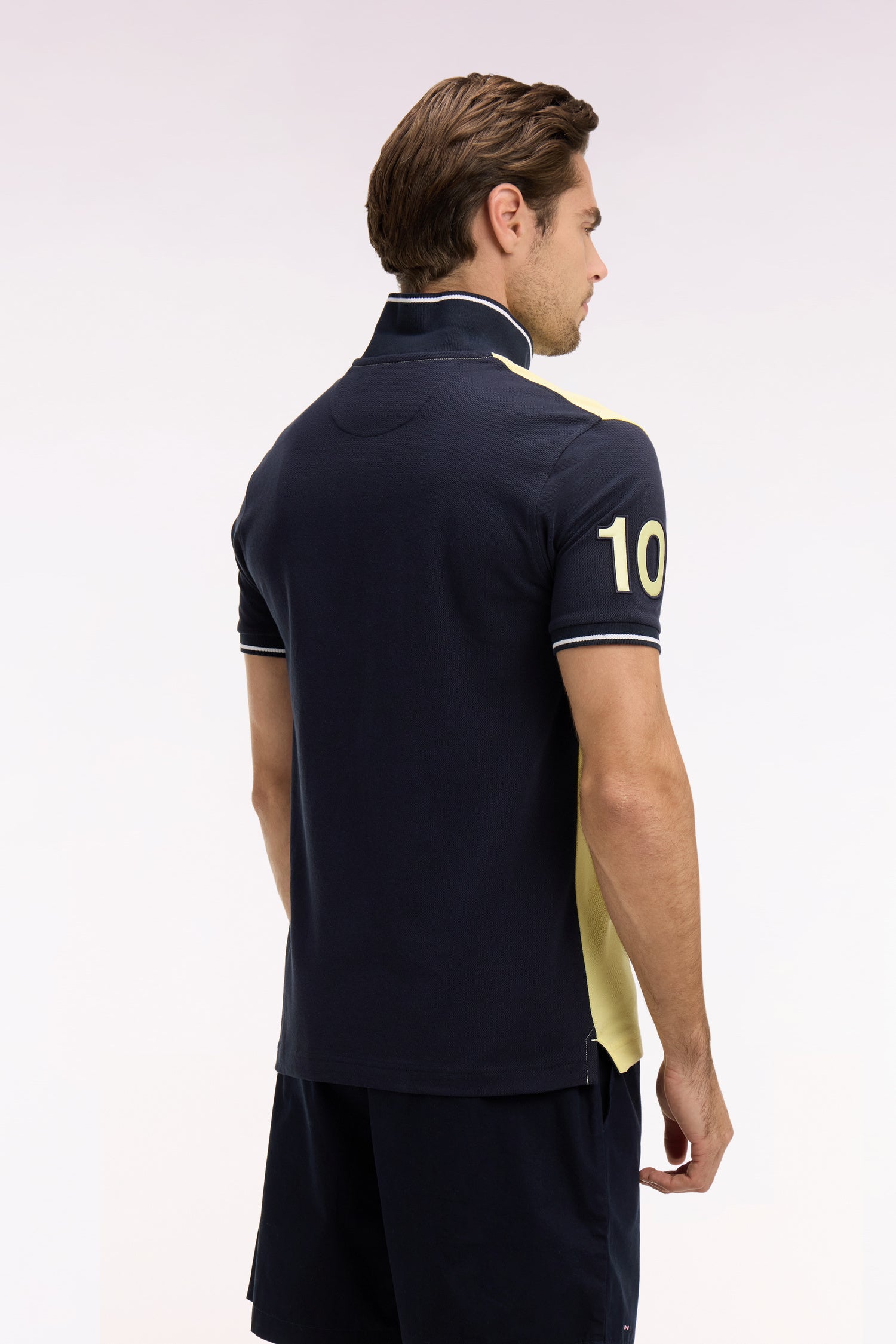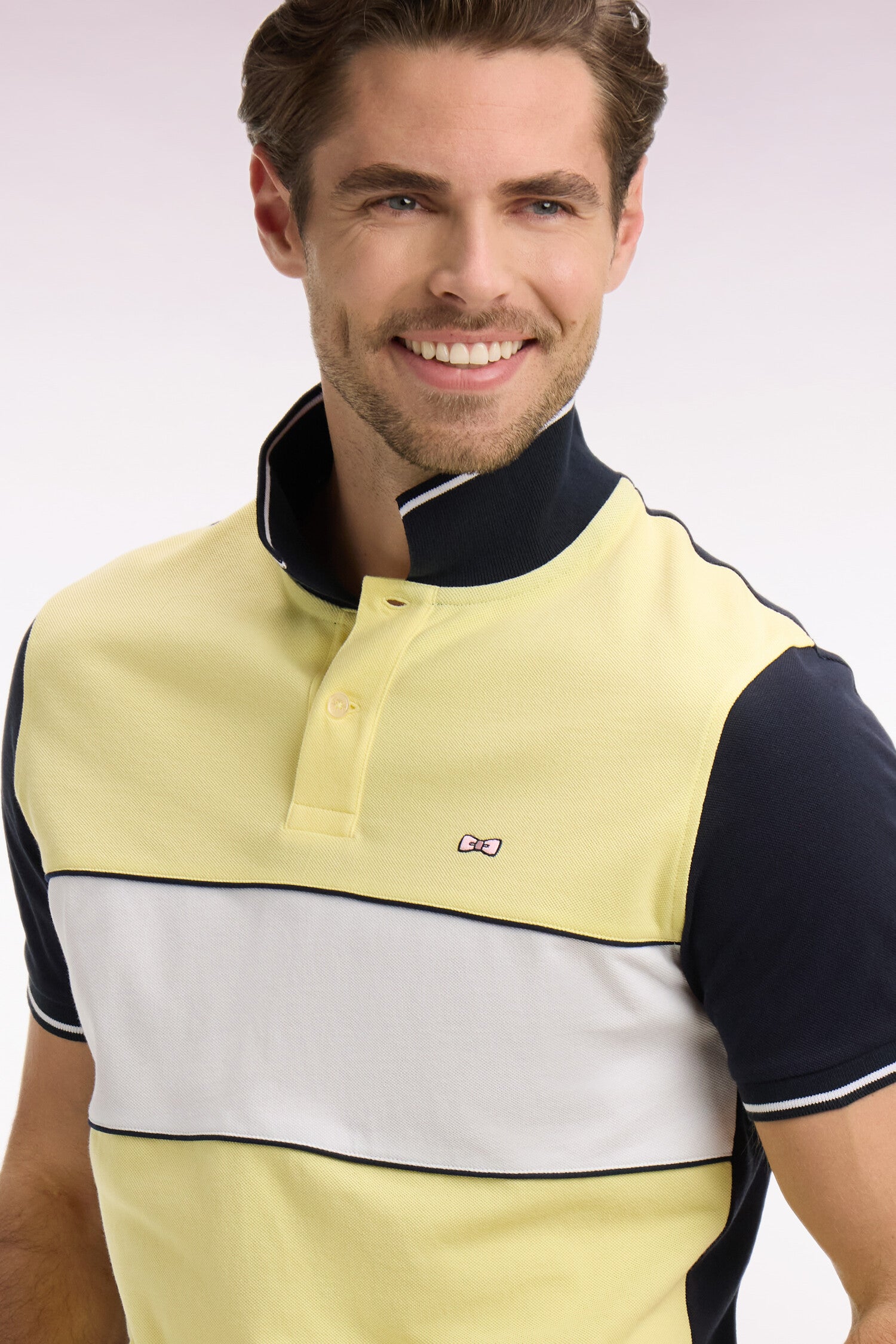 Ce polo masculin en piqué de coton coupe regular célèbre l’ADN rugby de la Maison grâce à sa large bande poitrine blanche, soulignée de passepoils marine qui structurent la silhouette. Le nœud papillon brodé et la broderie 10, enrichie d’une application en tissu cravate, renforcent son caractère identitaire. Son col et ses bas de manches en bords-côtes tricotés sont rehaussés d’un liseré contrasté, pour une touche élégante et sportive. Décliné dans les 4 coloris pastel signature de la saison, toujours associé à l'intemporel marine, ce polo à manches courtes incarne la modernité et la polyvalence du vestiaire sport chic Eden Park.