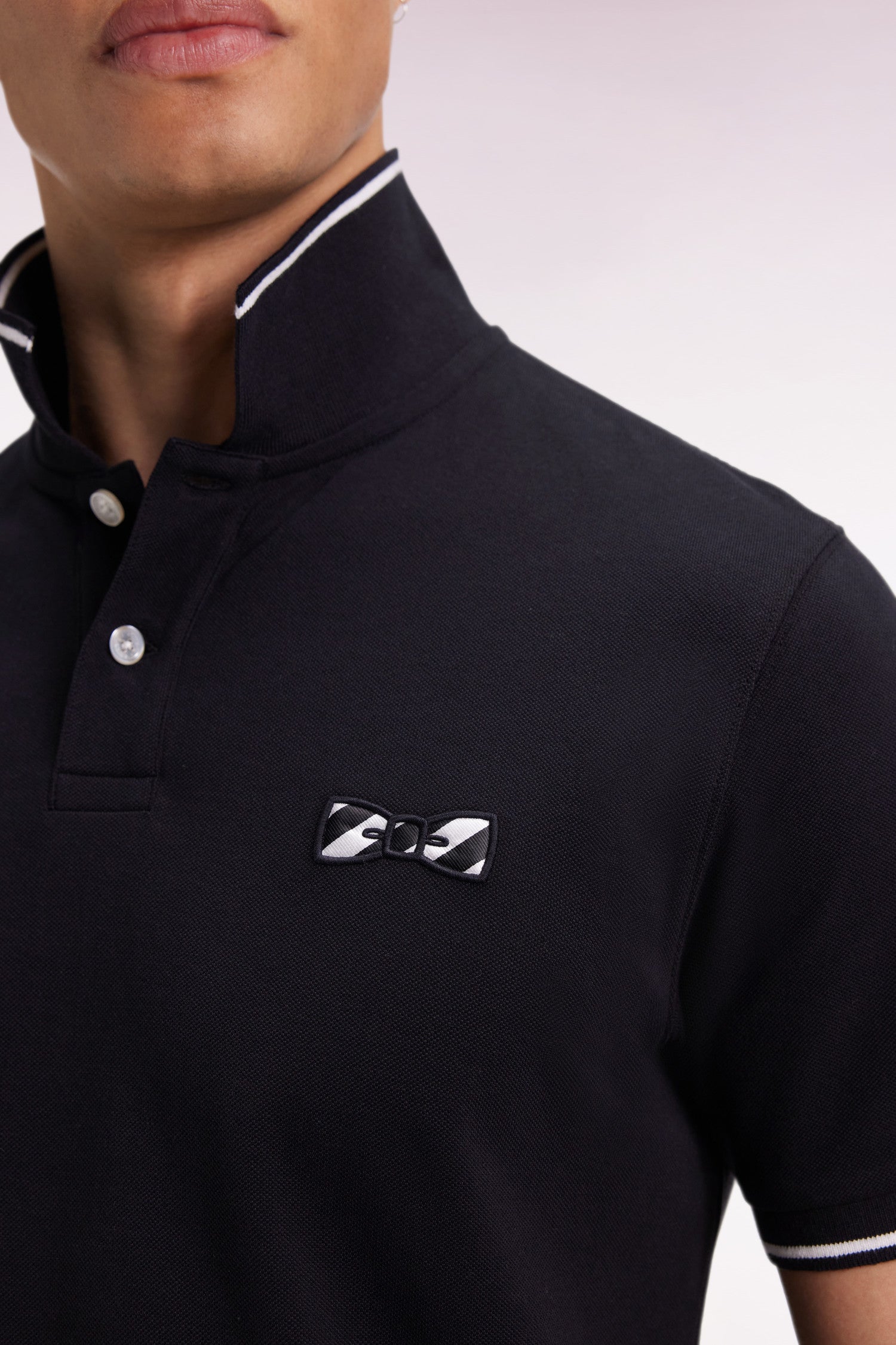 Short-sleeved polo shirt in black cotton with hooped embroidery