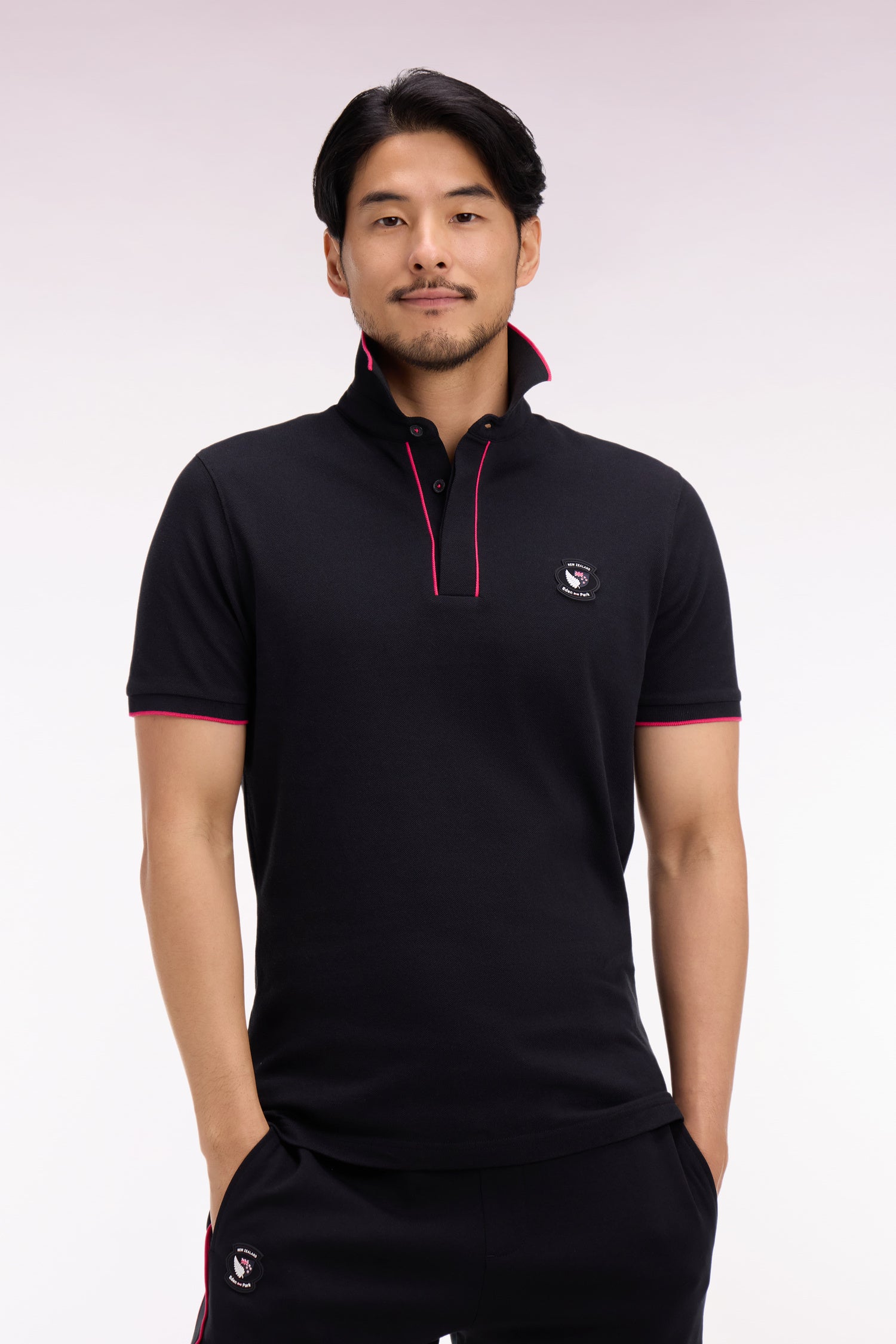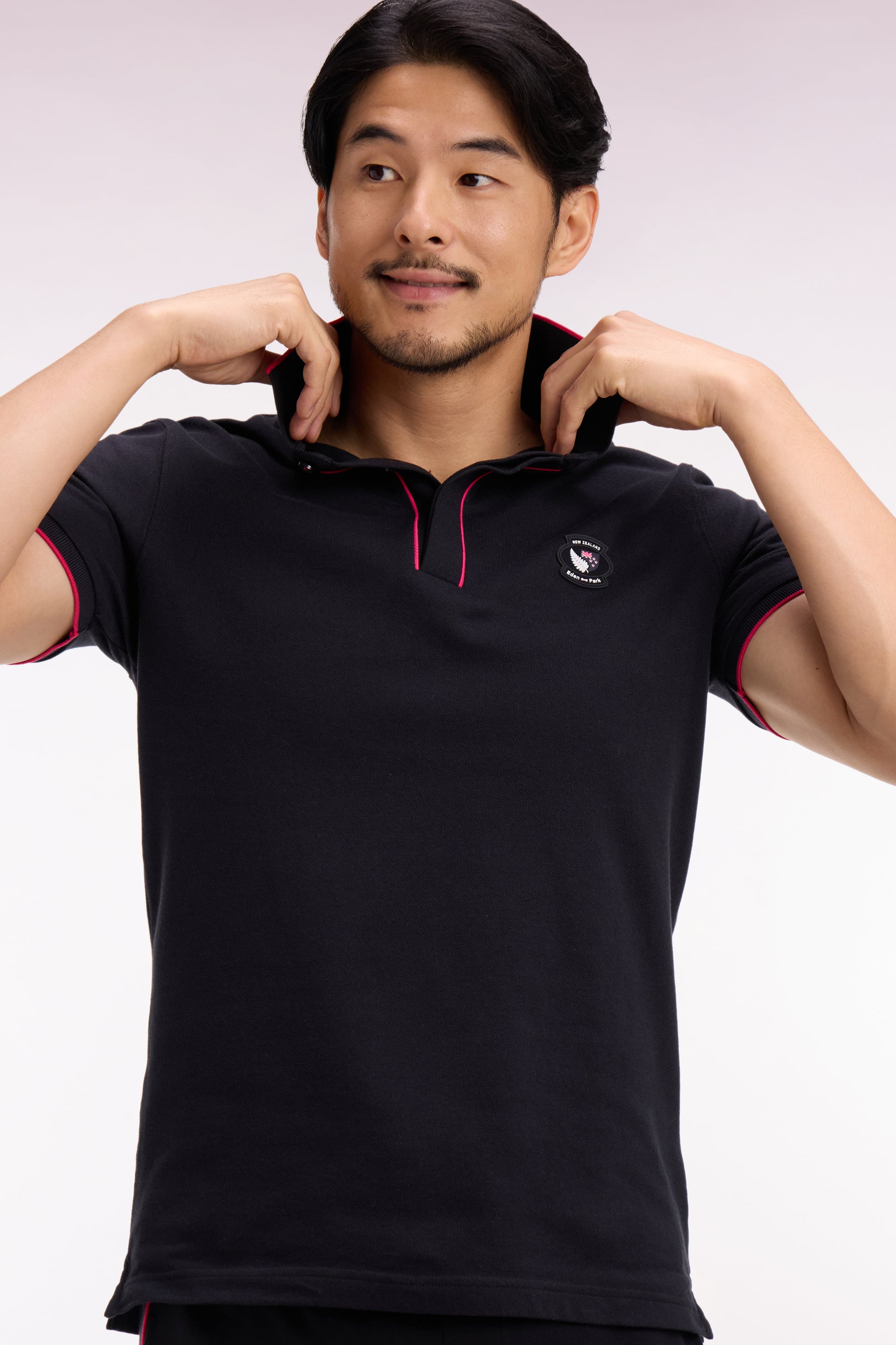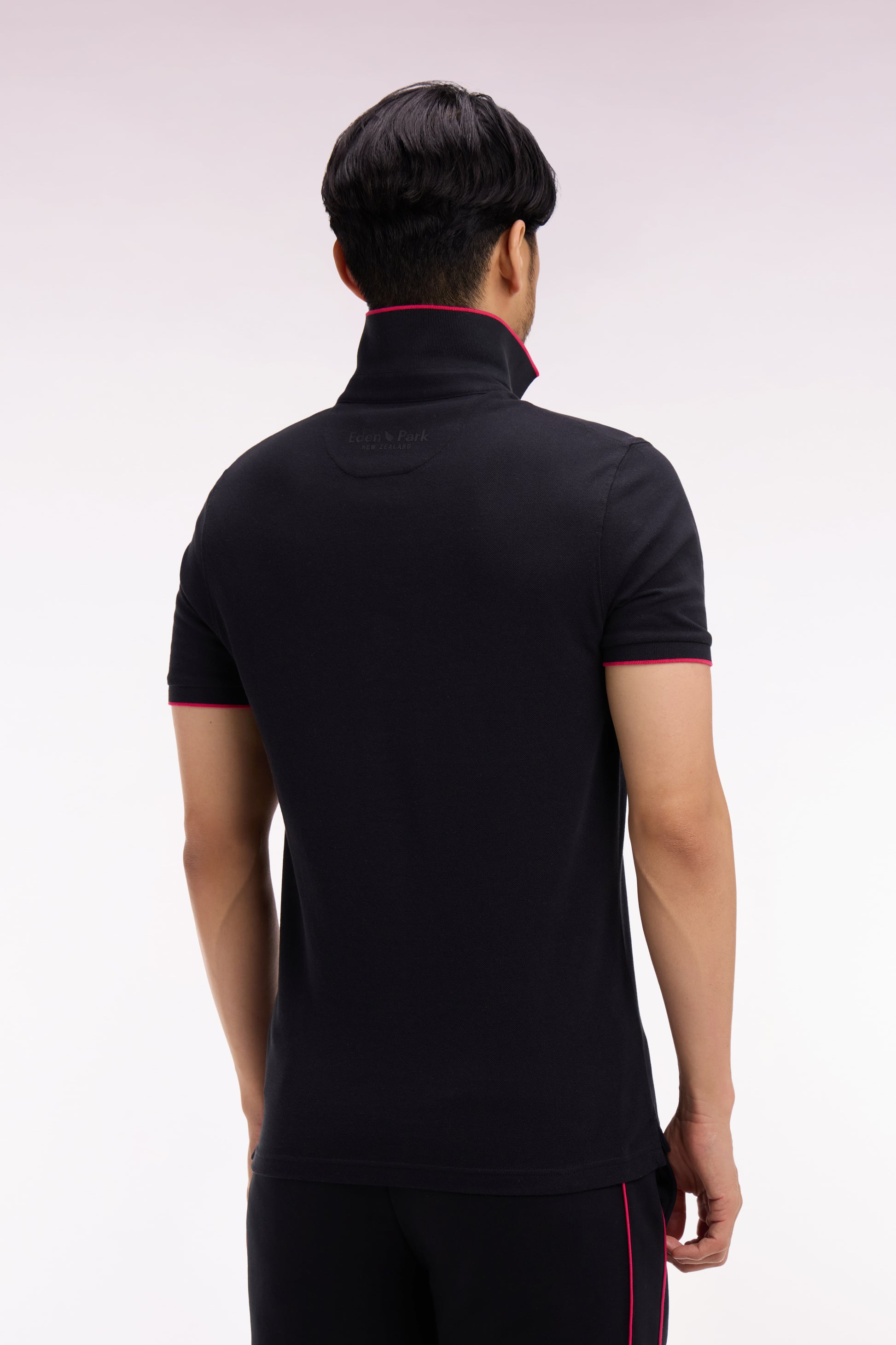 Ce polo de notre capsule Nouvelle vous est proposé en noir, rose ou blanc, et toujours doté d'une patte de boutonnage et bordures de manches noirs souligné d'une rayure contrastée. Ce modèle collector se distingue par son écusson New Zealand brodé sur la poitrine tandis qu'au dos de sa Demi-lune se retrouve la signature Eden Park.