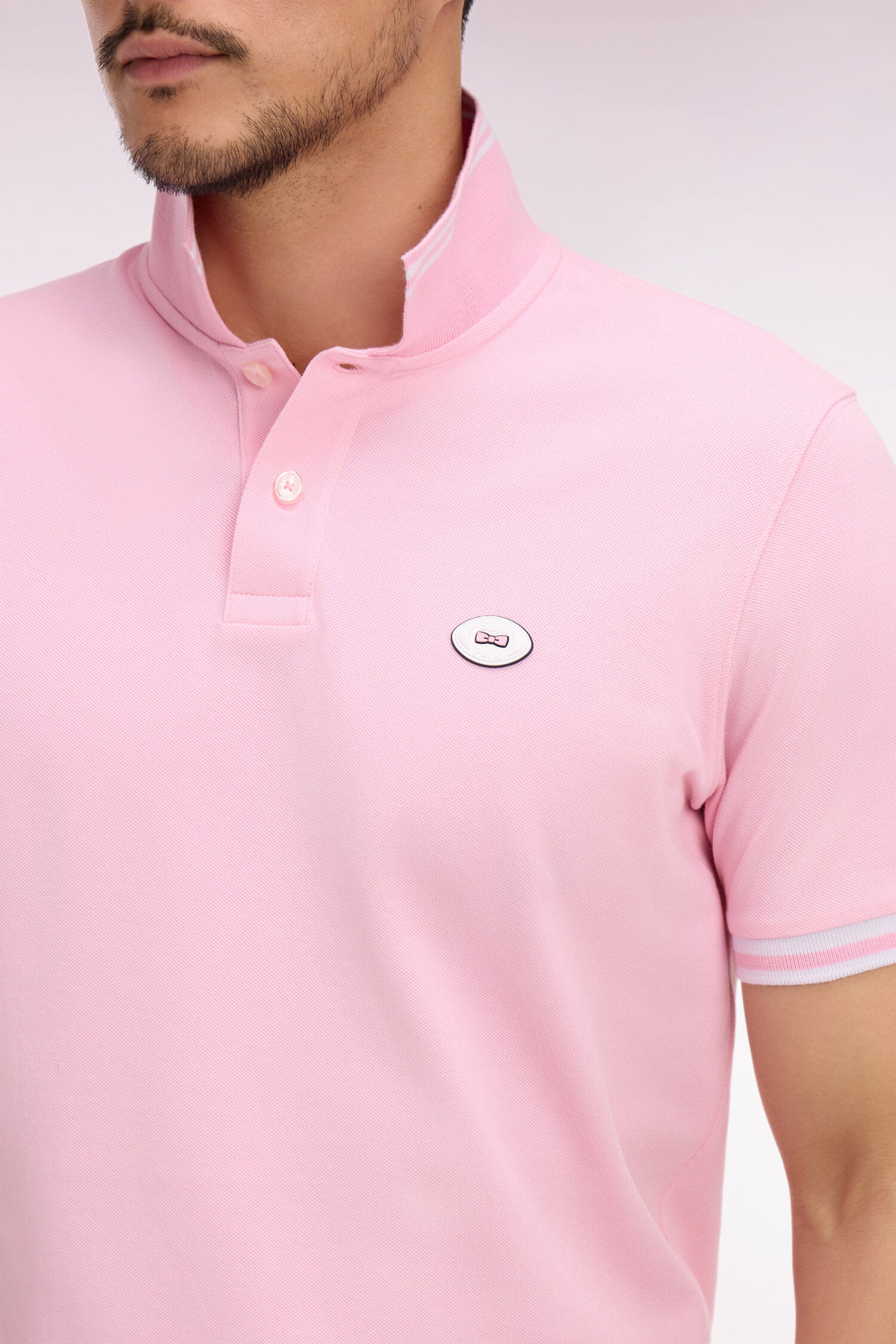 Notre nouveau polo uni assure une allure sport-chic en toutes occasions. Détail élégant, il est doté de fines rayures contrastées en bordures de col et de manches. Un badge en gomme silicone sur la poitrine ajoute au charme de ce polo masculin facile à associer au vestiaire de la saison comme à vos pièces préférées.