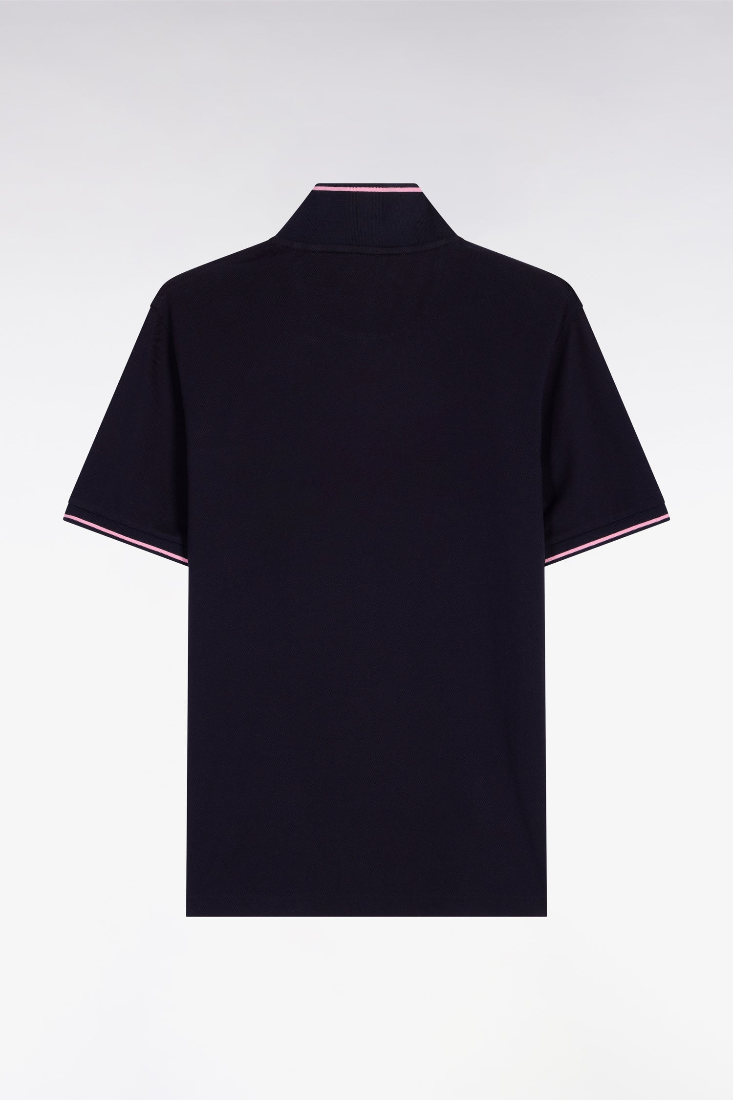 Notre polo masculin blanc ou marine se distingue par ses fines rayures roses agrémentant ses bords-côtes manches et col, un détail repris sur le passepoil qui traverse sa poitrine et sur le pourtour de ses fentes d'aisance. Ces finitions en font un modèle emblématique, reflétant l'esprit rugby chic de notre Maison.