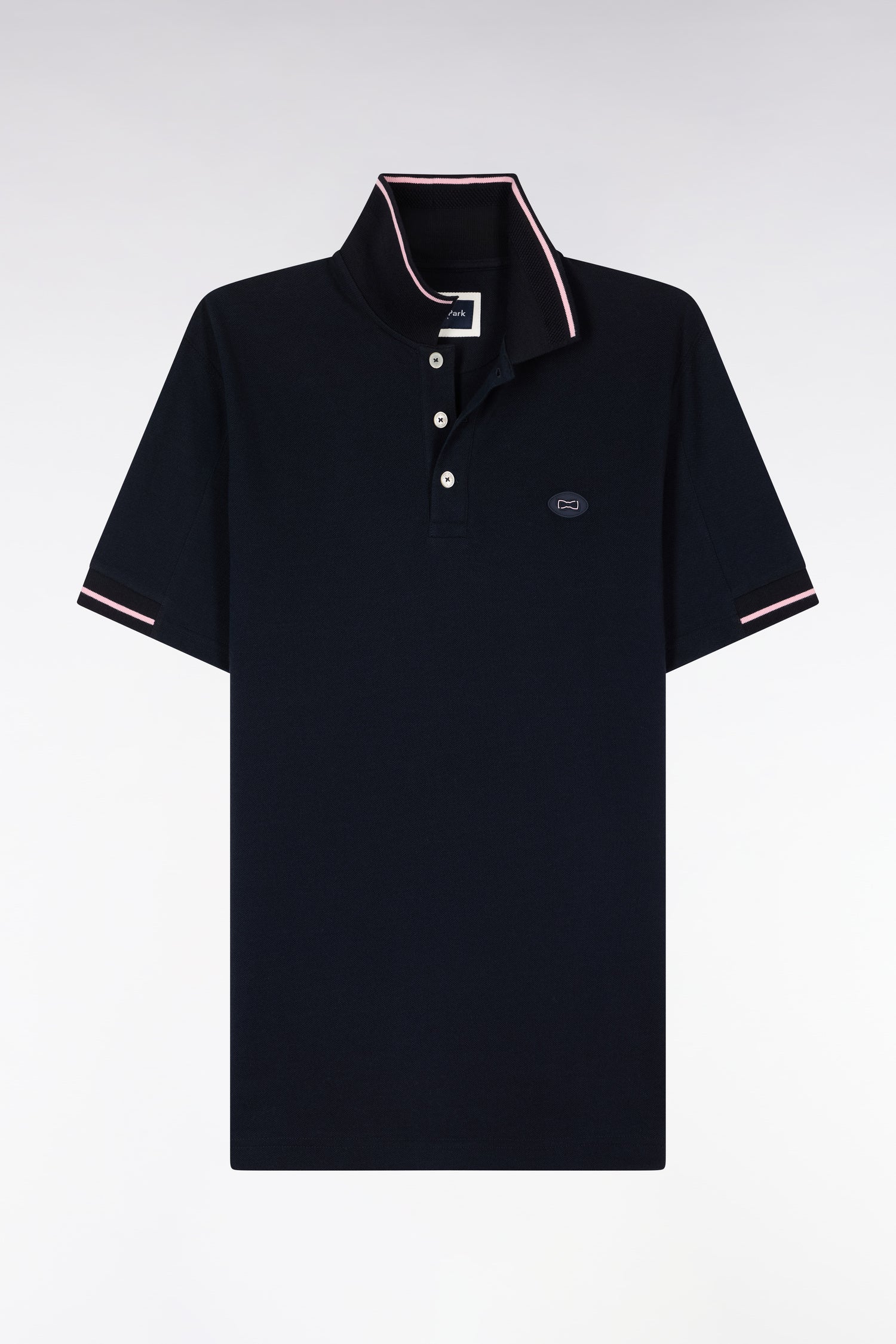 This short-sleeved polo shirt in white or navy cotton pique is distinguished by its two-tone ribbed edges at the sleeve edges. It features a navy polo collar with a contrasting stripe that highlights the head position. This typical model of the men's wardrobe Eden Park, combining elegance and rugby spirit, is embellished with an oval badge on which the House emblem can be recognized: the pink bow tie.