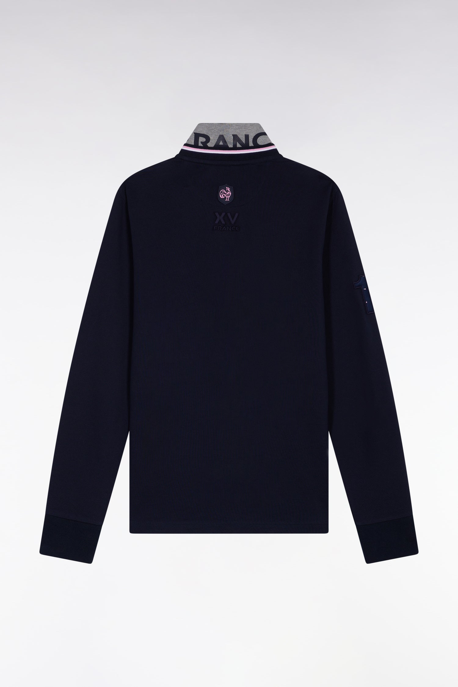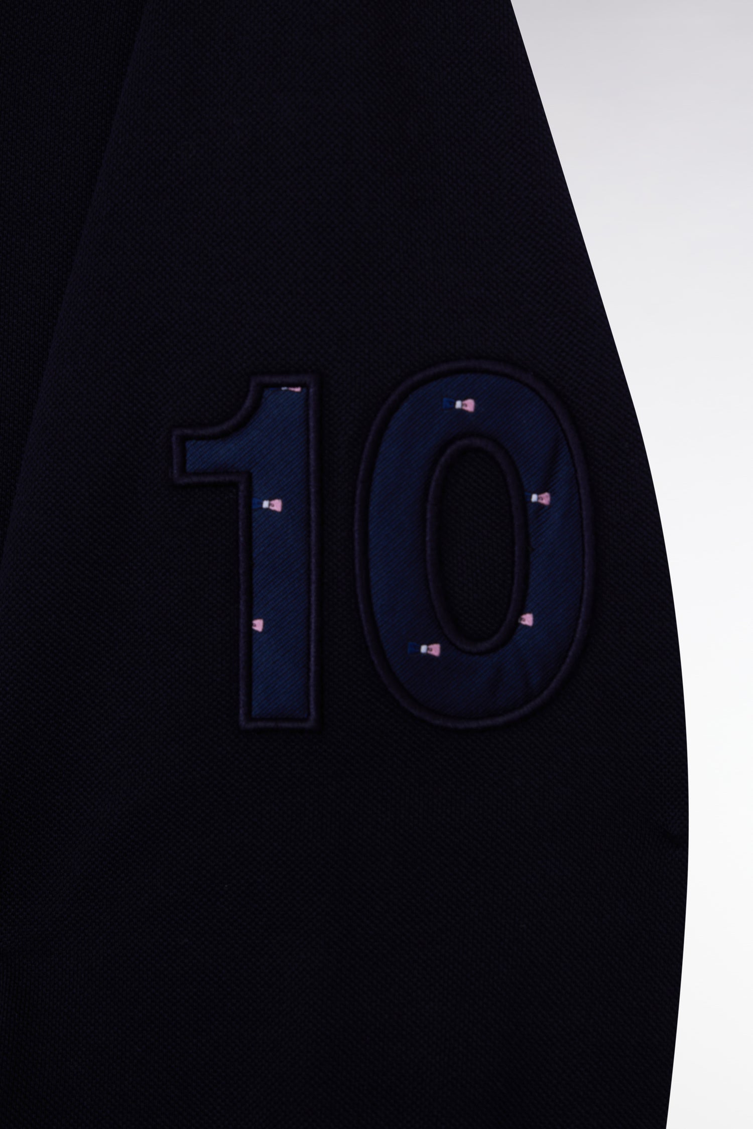 With its contrasting double collar highlighted by a fine tricolor stripe, this long-sleeved polo shirt asserts its sporty-chic character in the spirit of the Eden Park wardrobe. Made from piqué cotton, it features a "FRANCE" print under the collar and N°10 embroidery on the sleeve, a nod to the jersey worn by Franck Mesnel highlighted by the application of an elegant tie fabric printed in the colors of our emblem. Available in pink or navy for an elegant, casual silhouette.