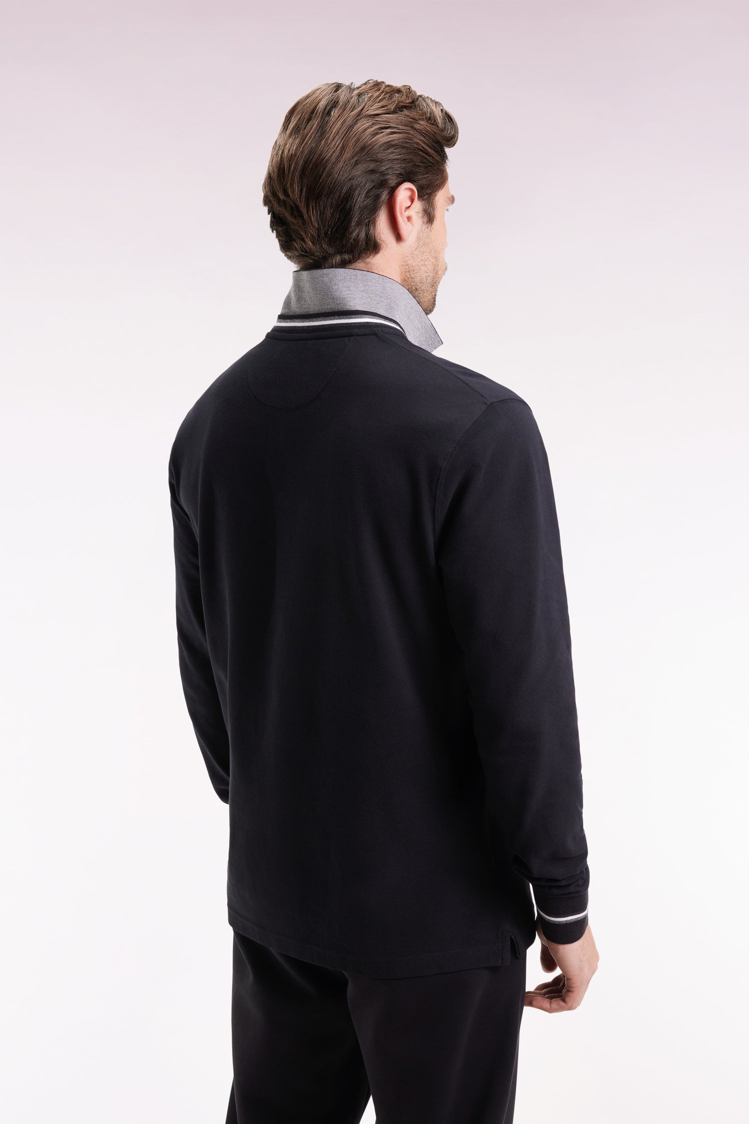 Inspired by the company's rugby heritage, this men's long-sleeved polo features tricolored striped trim on the collar and sleeve cuffs. Made from piqué cotton, the Relaxed cut is slightly looser than a straight cut for greater ease of movement. It features a unique trompe-l'œil overlay effect on the collar and cuffs. A staple of the Eden Park sport-chic wardrobe, available in navy or black.