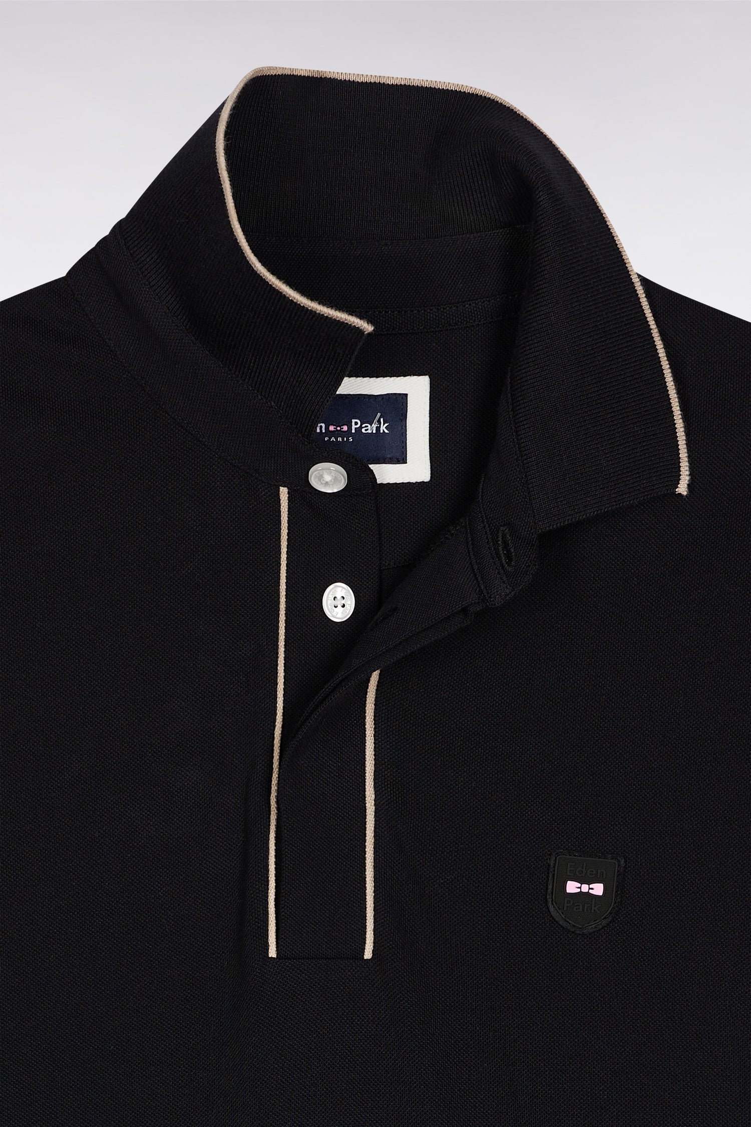 Long-sleeved polo shirt in black stretch cotton with piping, slim fit