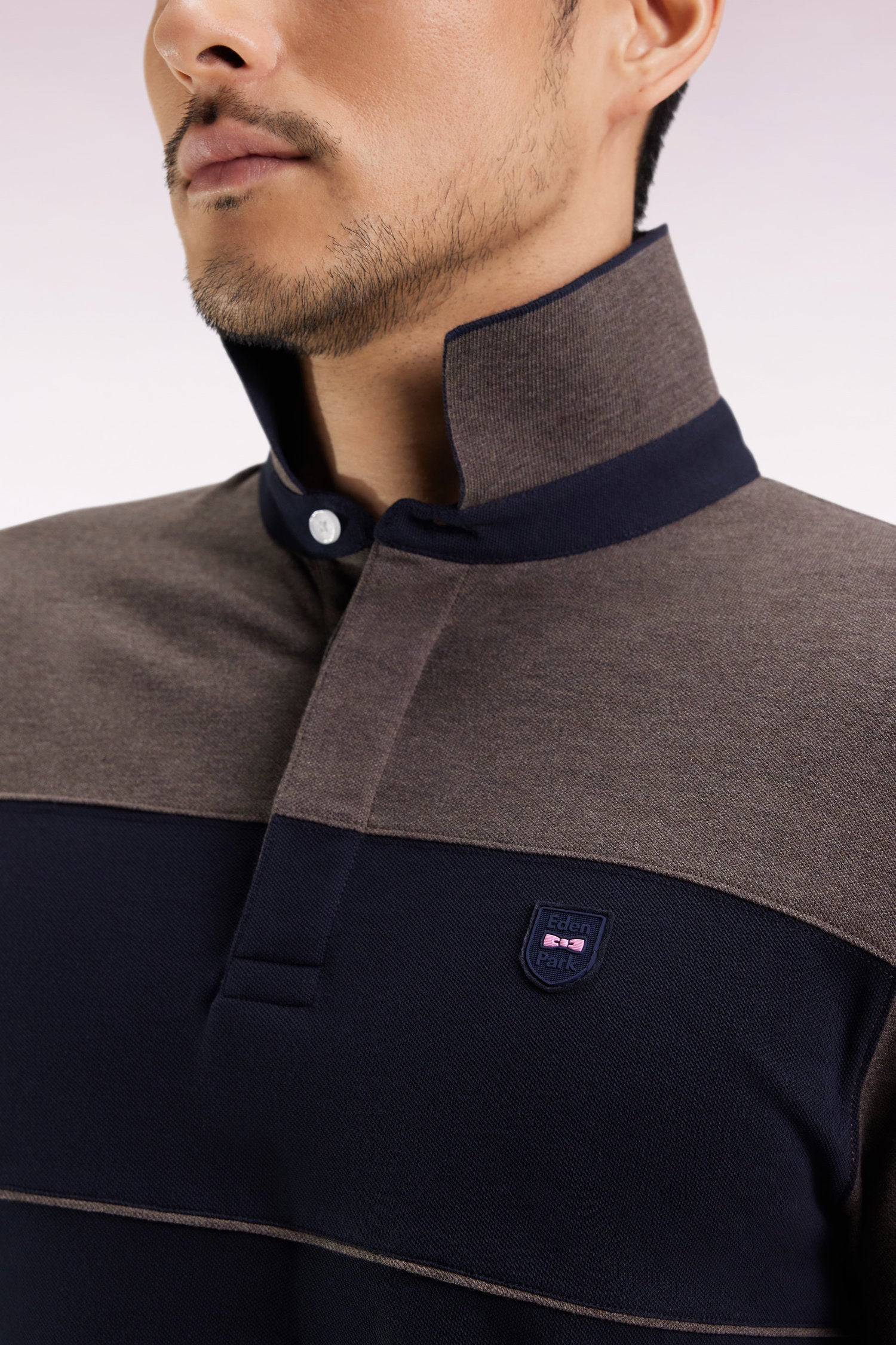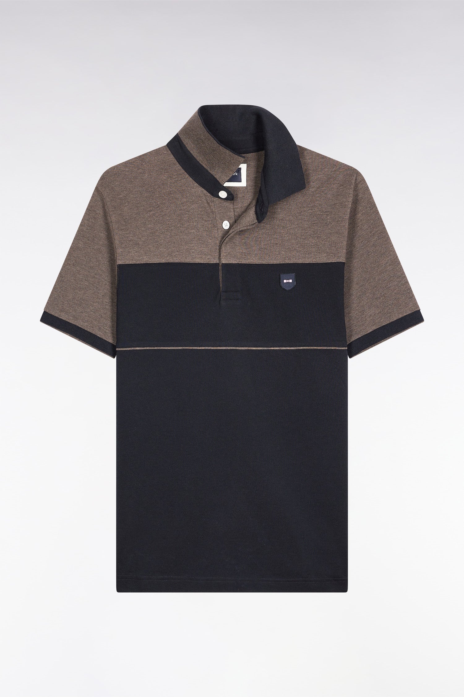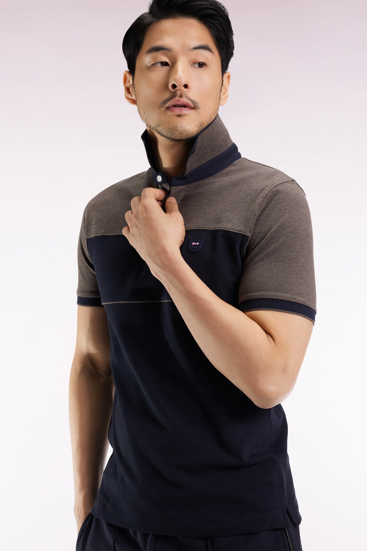 Two-tone short-sleeved polo shirt in navy stretch cotton piqué, slim fit