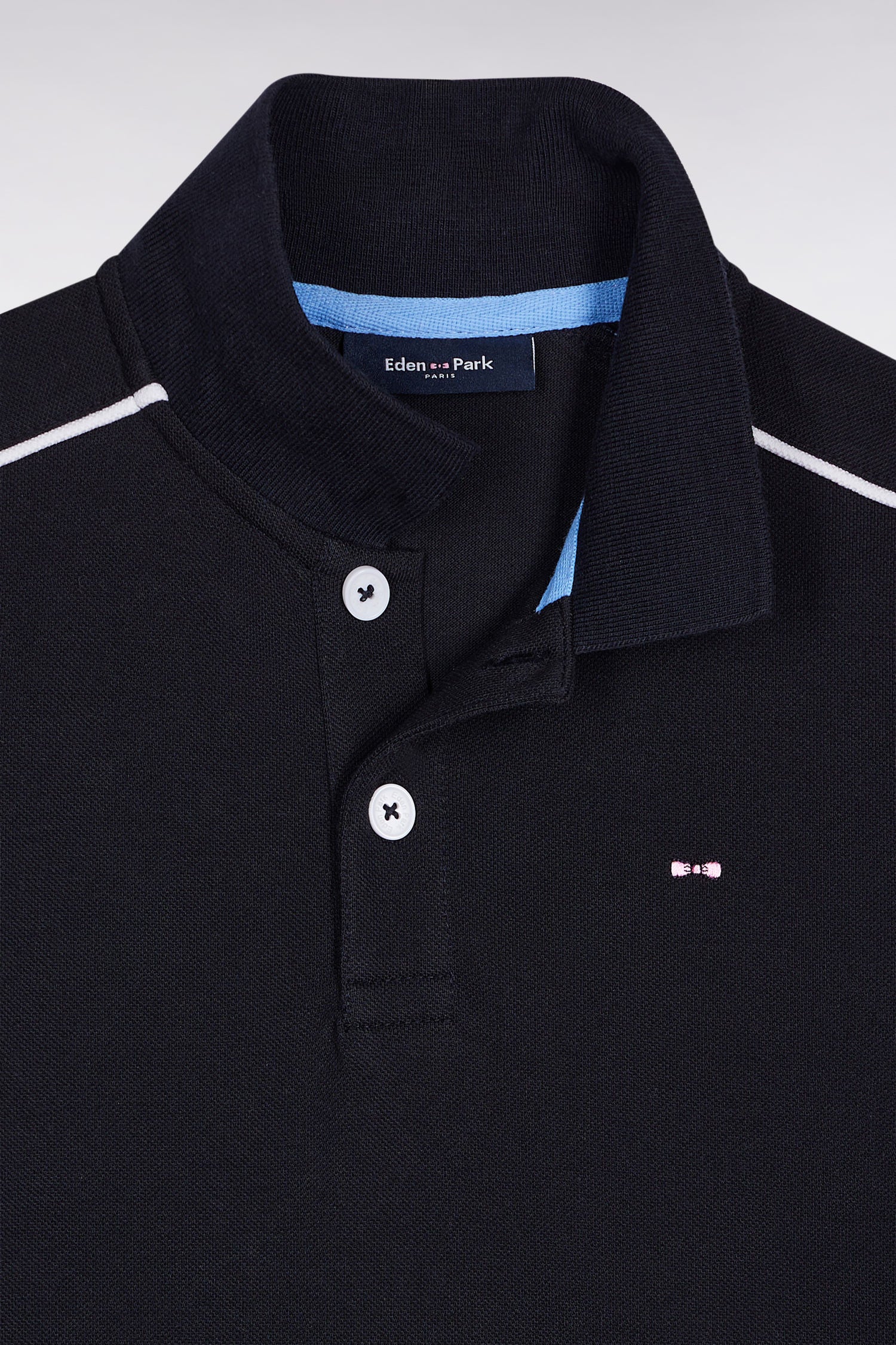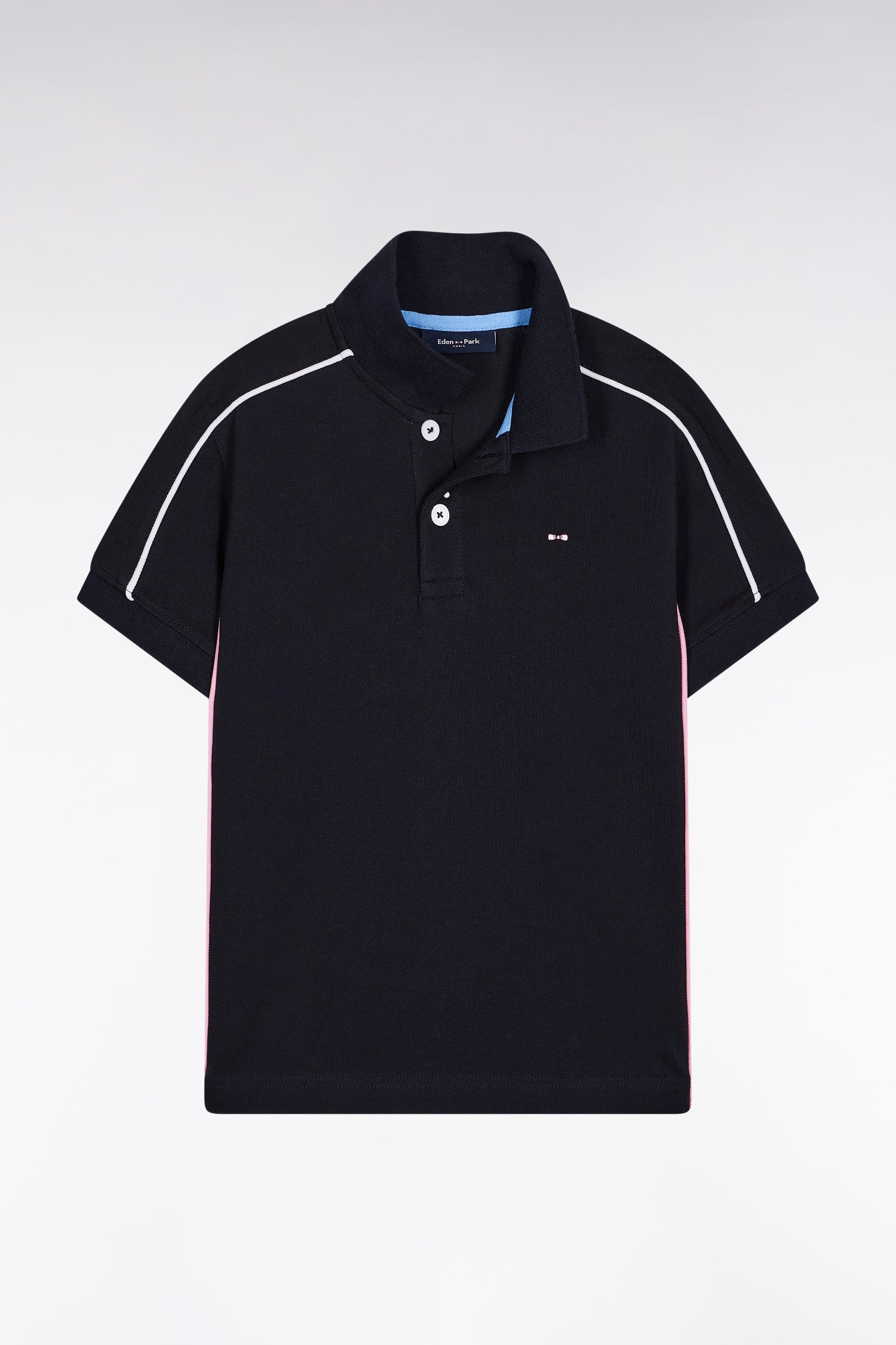 Short-sleeved polo shirt in navy cotton with white piping, straight cut