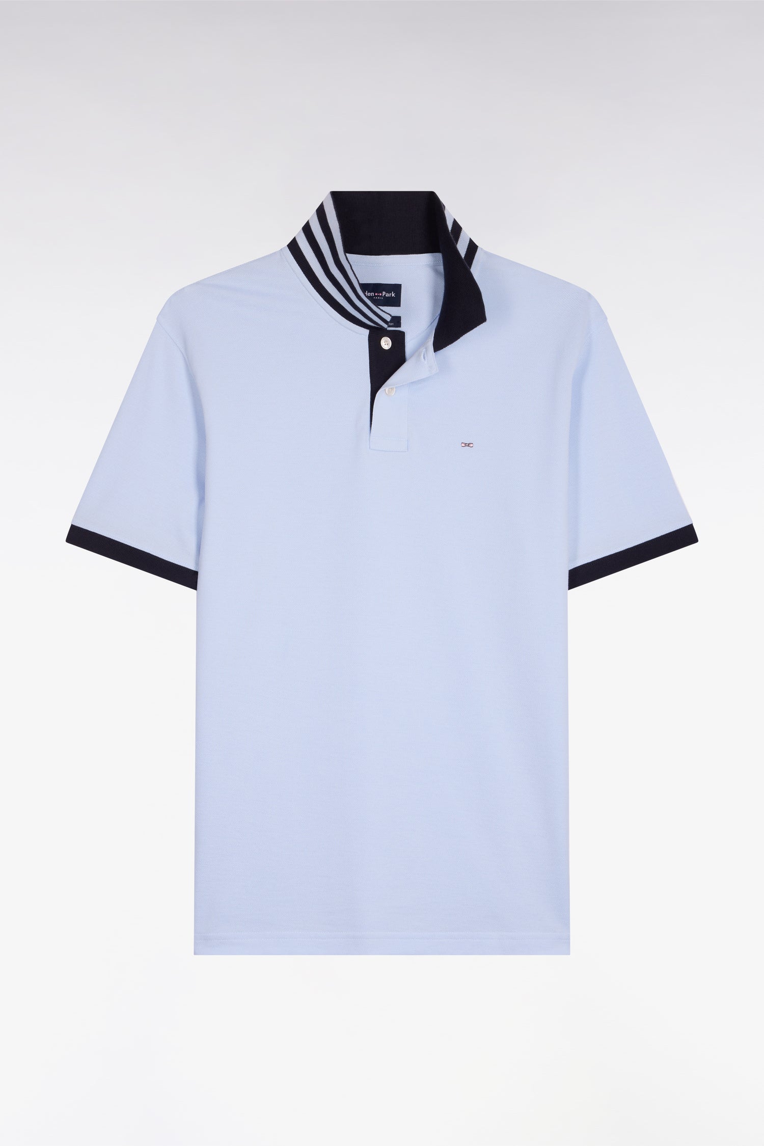 Polo manches courtes en piqué coton ciel dessous de col rayé coupe slim