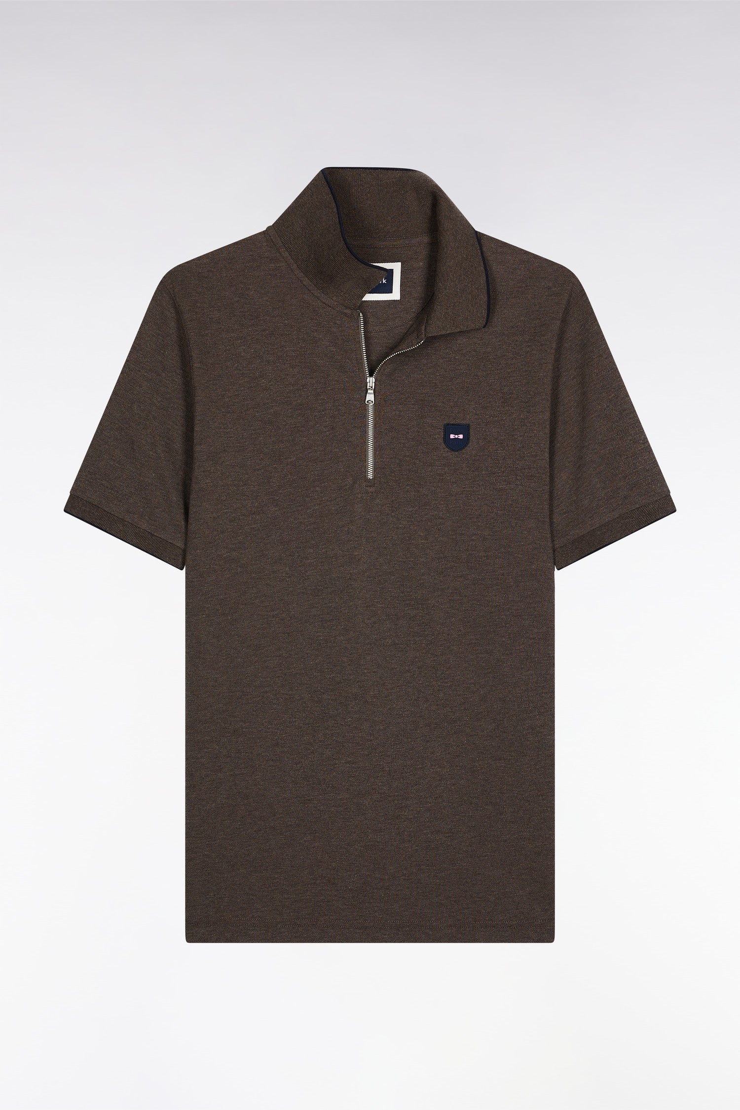 Short-sleeved polo shirt in brown stretch cotton piqué with zip and slim fit