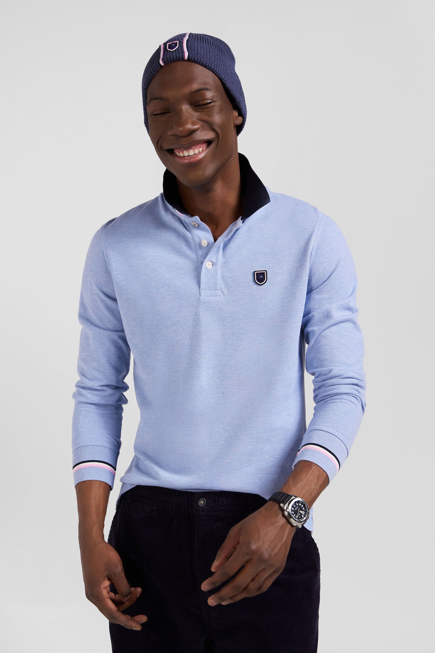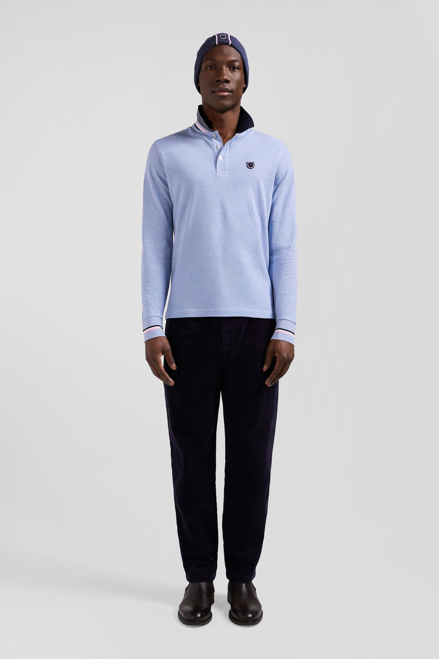 Regular sky blue long-sleeved cotton piqué polo shirt with rubber badge