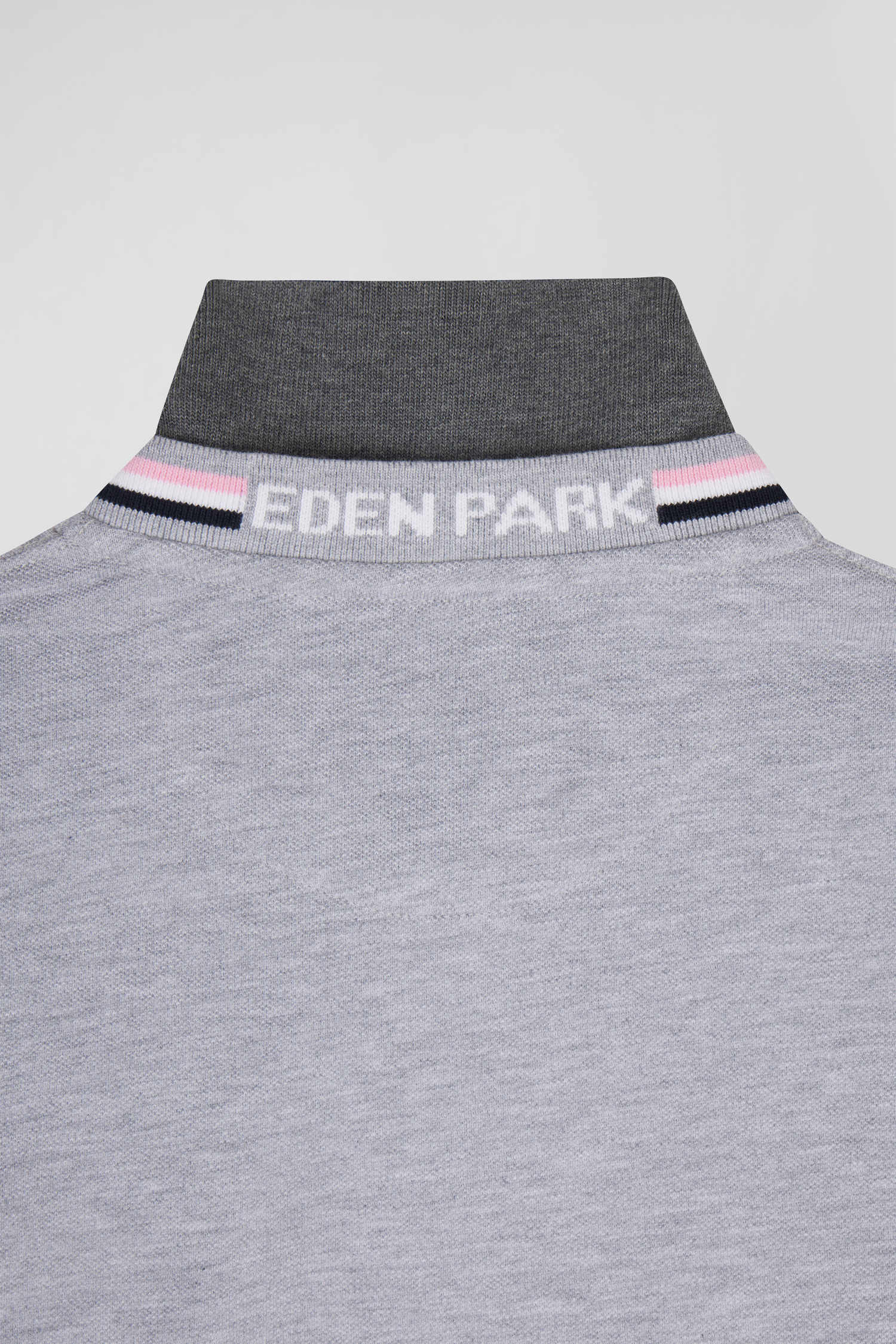 Regular grey long-sleeved cotton piqué polo shirt with rubber badge