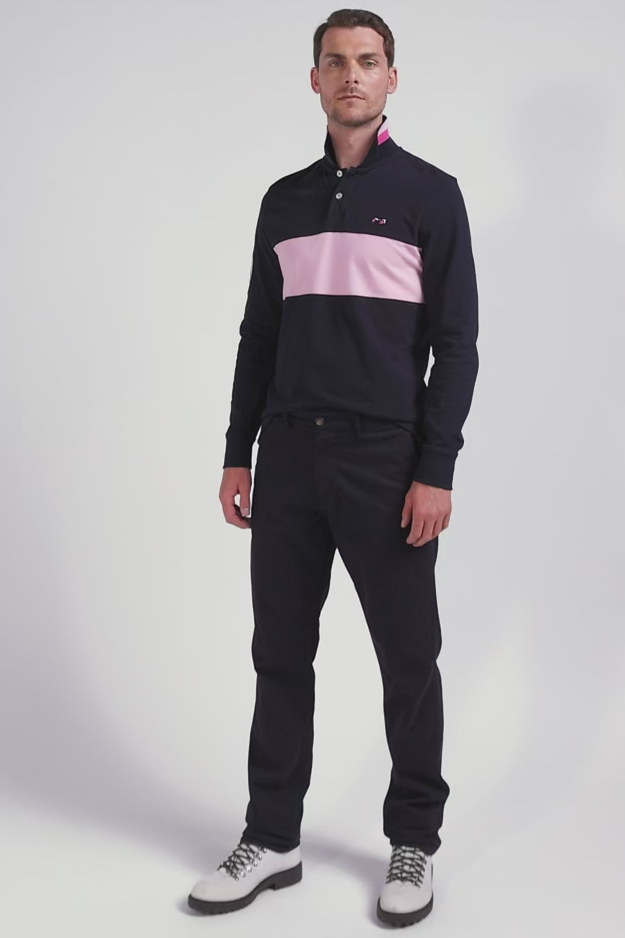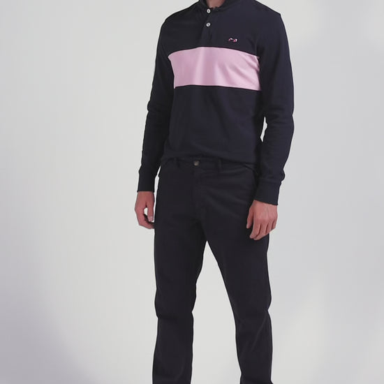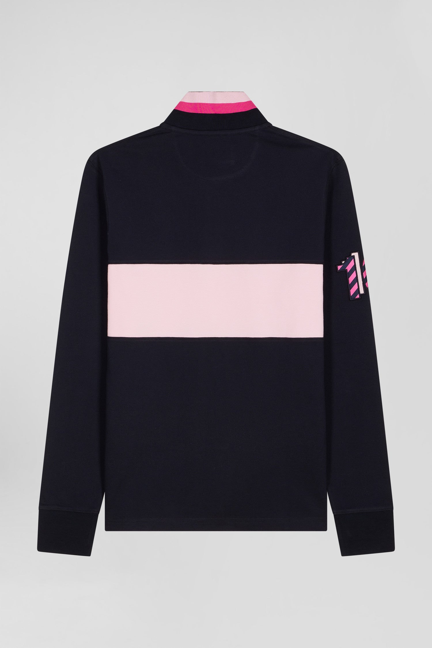 Add a sophisticated touch to your casual wardrobe with this men's long-sleeved polo shirt. Its embroidered finish with fabric tie application on the sleeve lends it a certain elegance. The number 10 shirt is no coincidence: it's the jersey worn by rugby player and Eden Park founder Franck Mesnel. The rugby-inspired oval buttons, bearing the name of our House, add to the meticulous details of this men's polo shirt, such as the knitted collar with tricolored stripes.