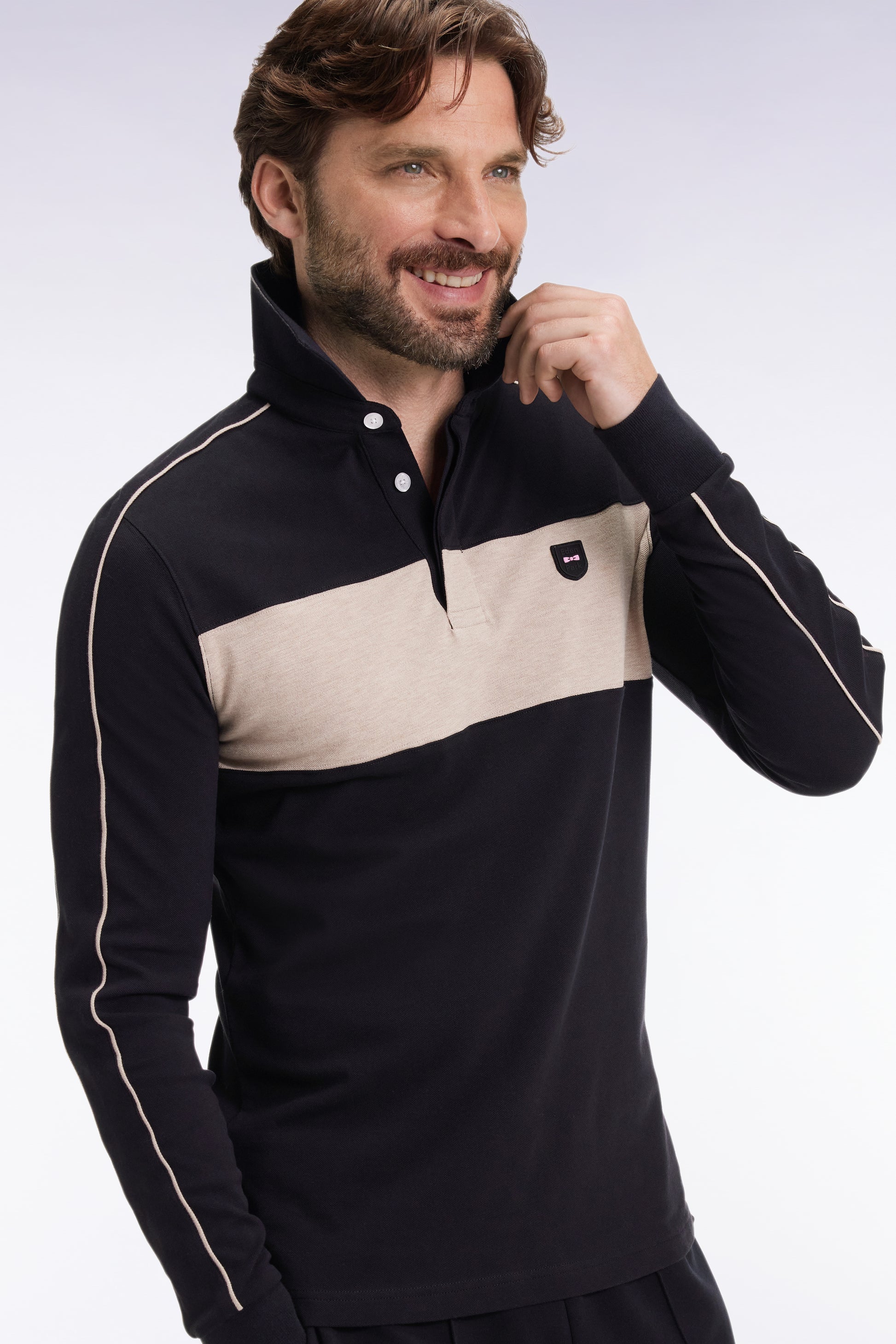 Three-tone long-sleeved polo shirt in black stretch cotton, slim fit