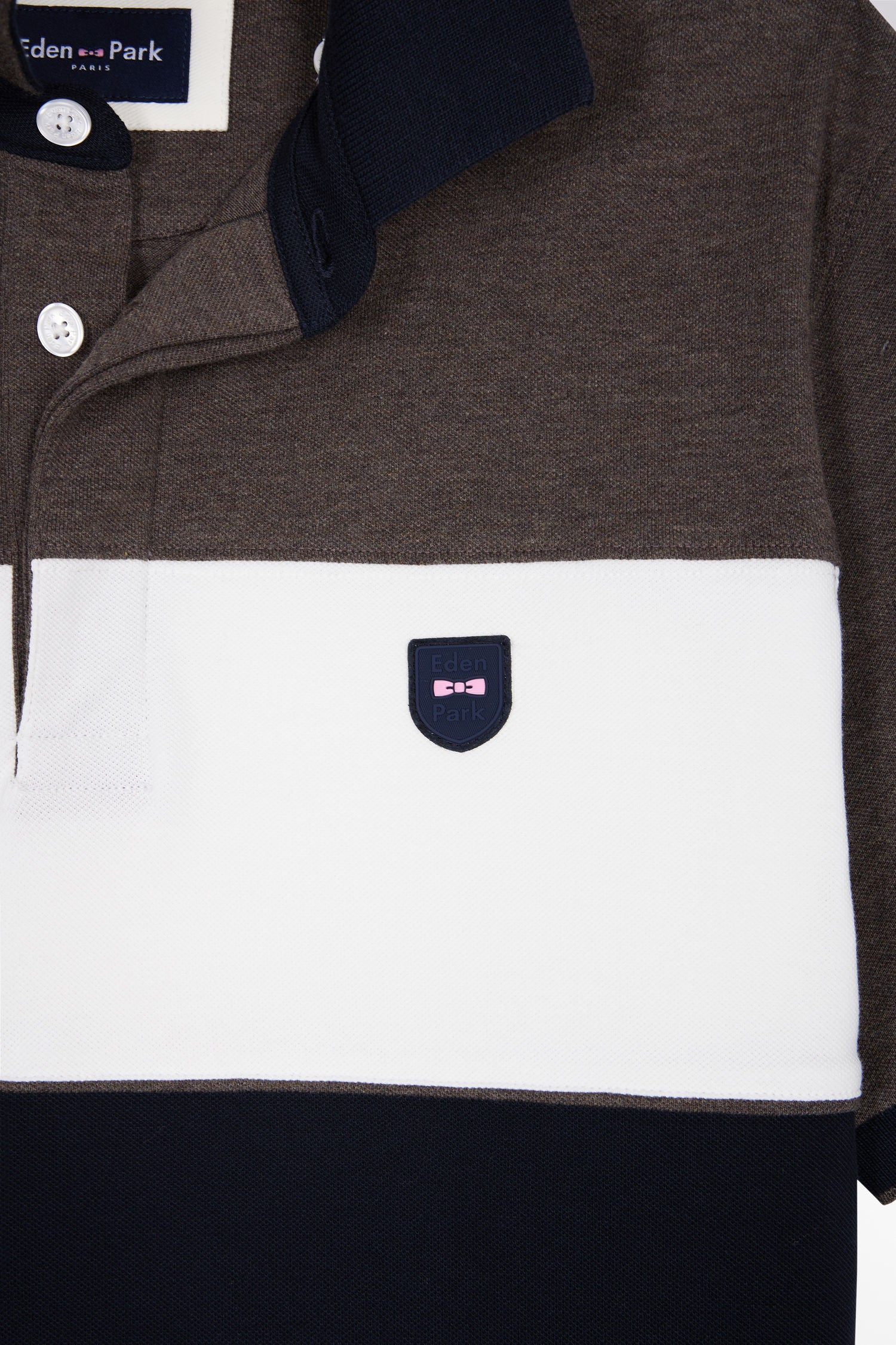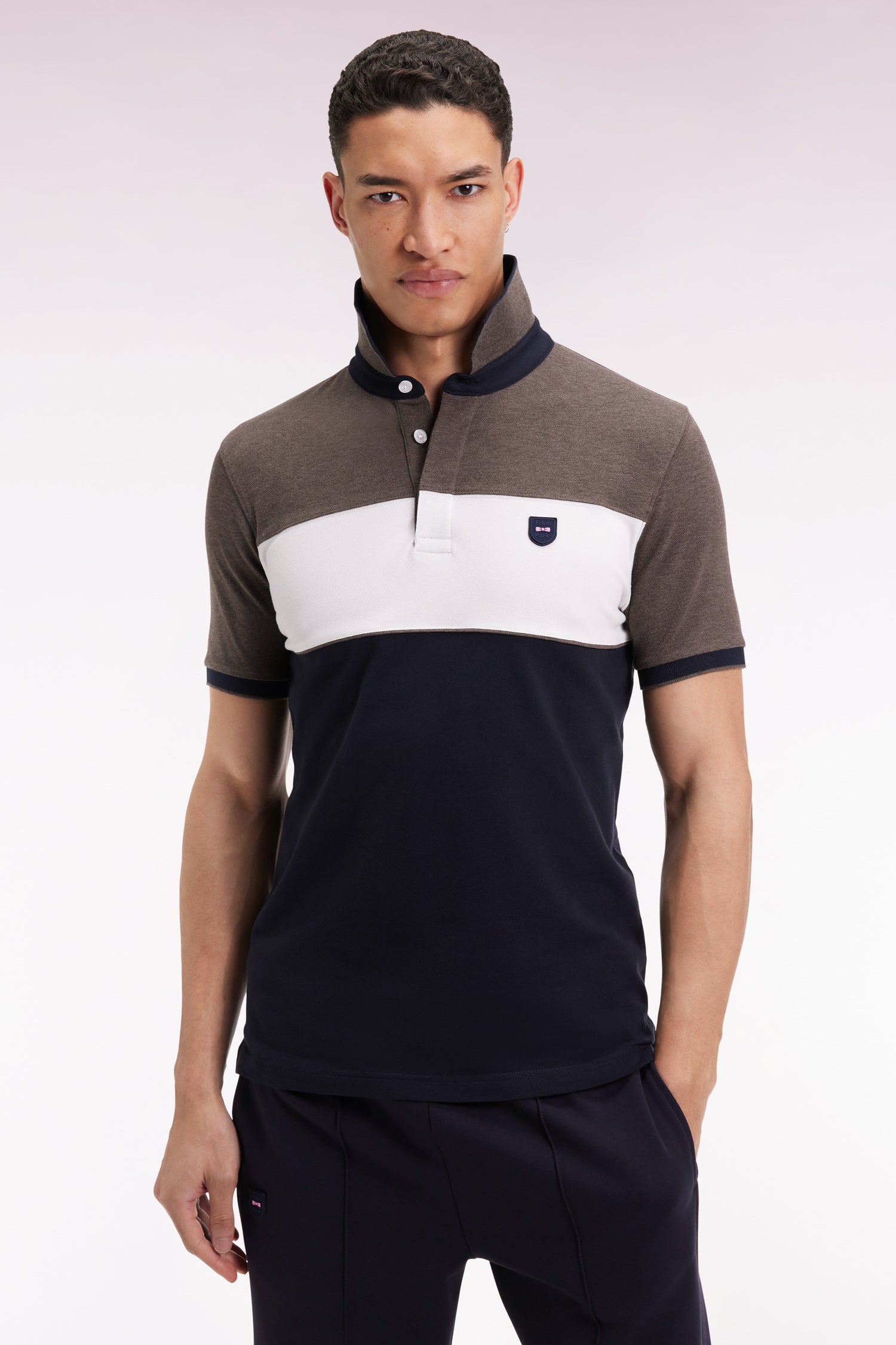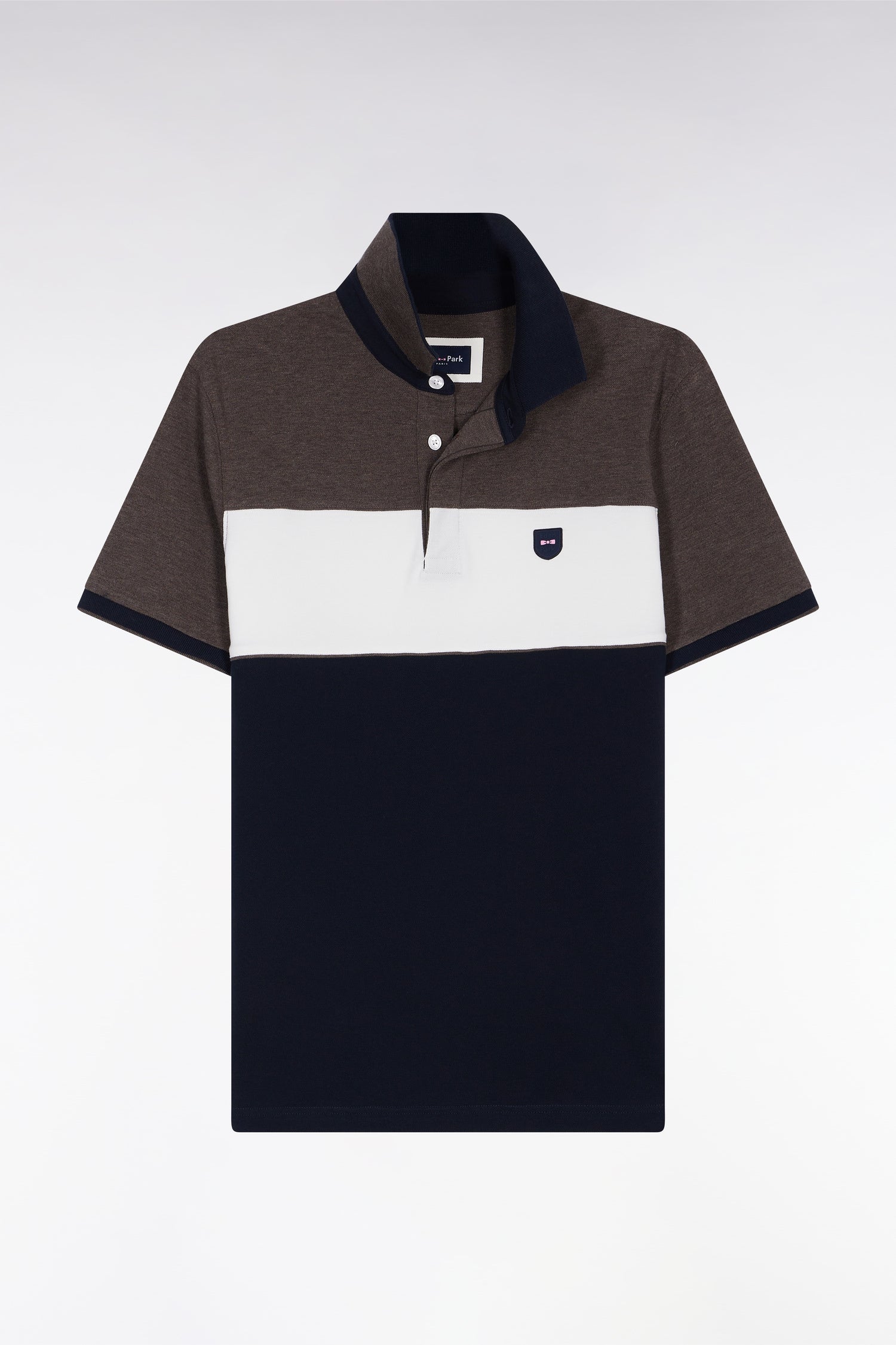 Three-tone short-sleeved polo shirt in brown stretch cotton piqué, slim fit