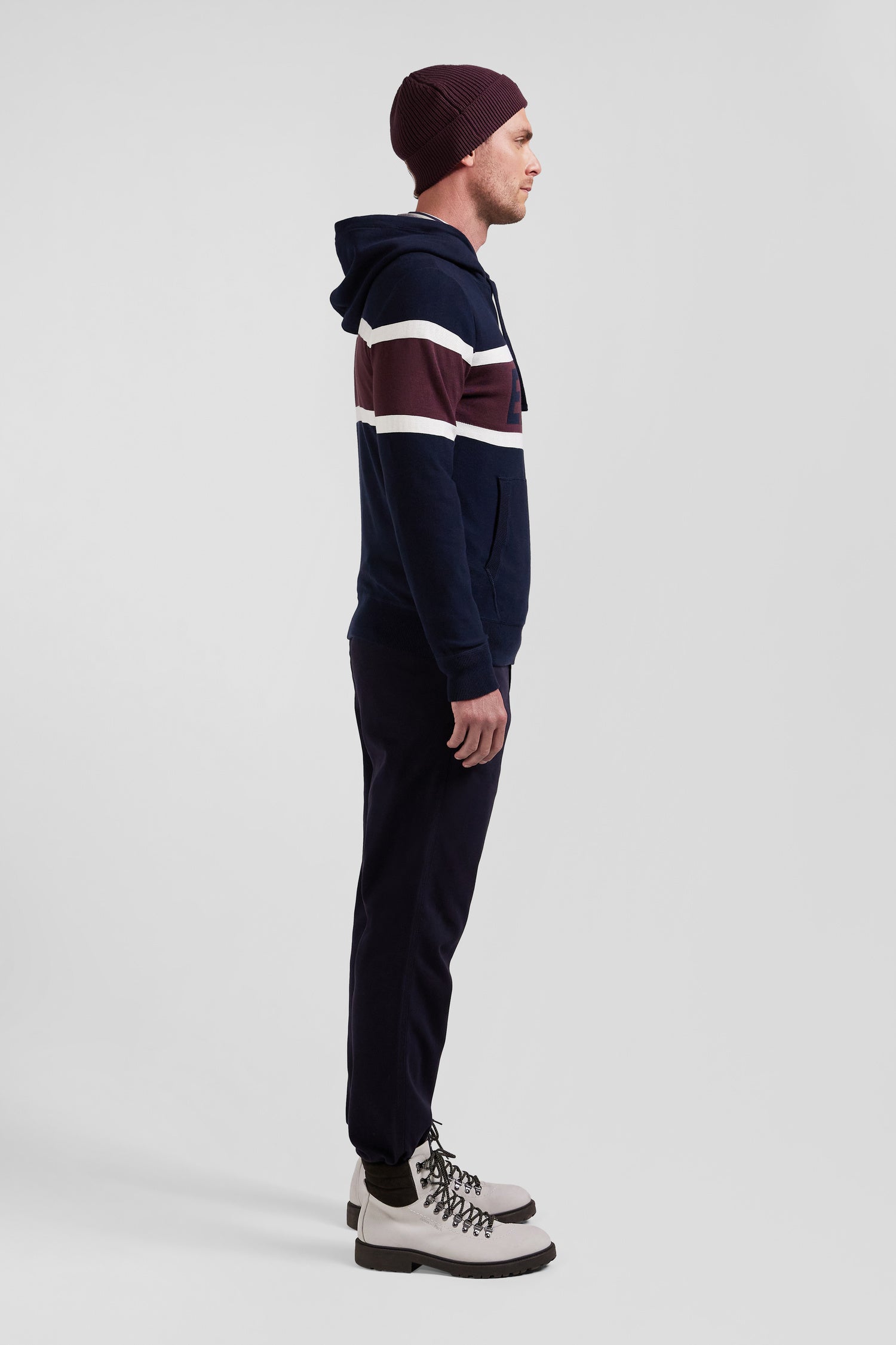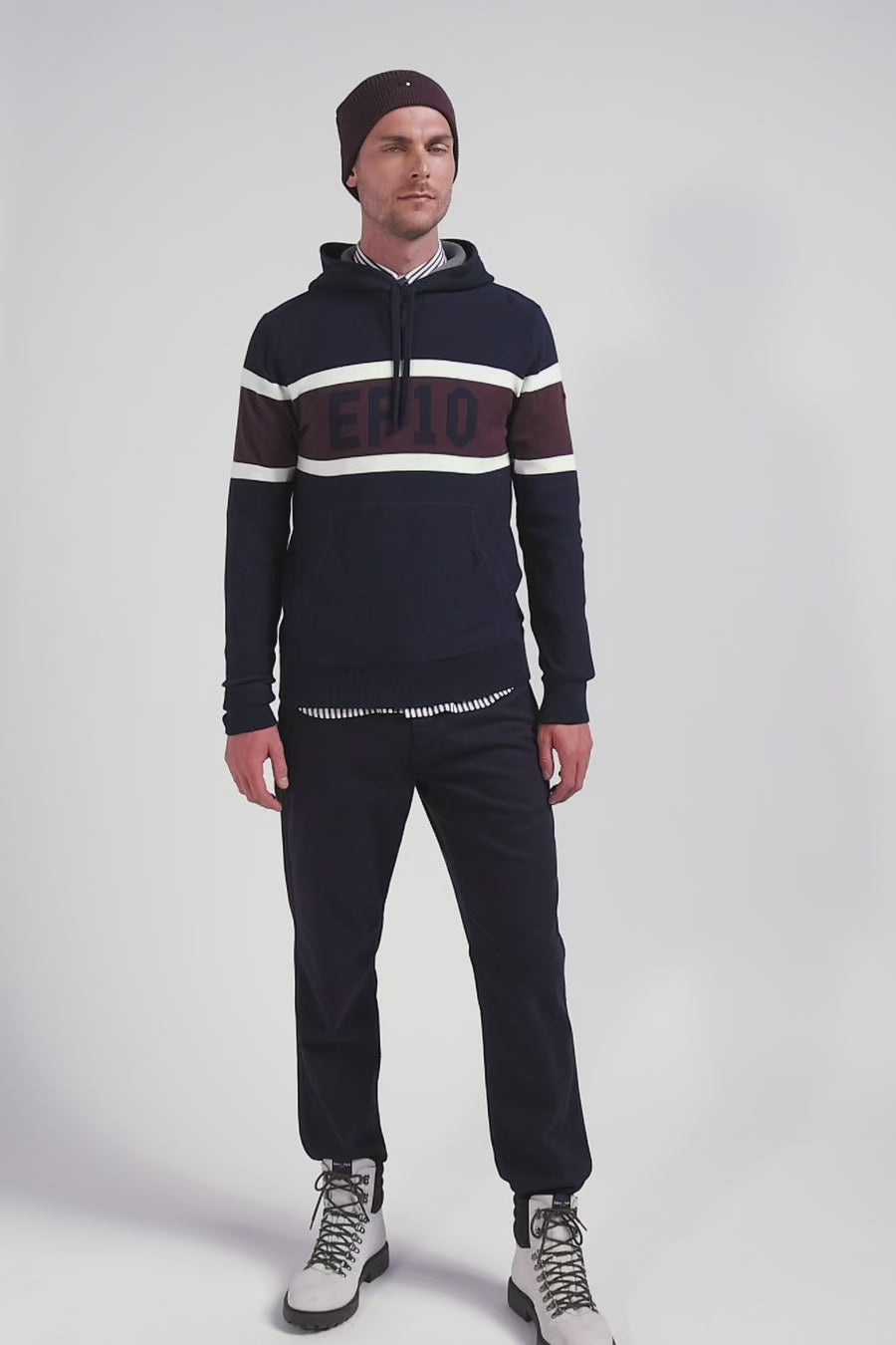 Work on your casual look with this hooded sweater, which skilfully combines contrasting knits for a dynamic visual effect. On the chest, a jacquard stripe highlights the EP 10 logo. Inspired by the sweatshirt with its ribbed trim, integrated hood, jersey body and reverse jersey half-moon, this sweater is the perfect blend of style and comfort.