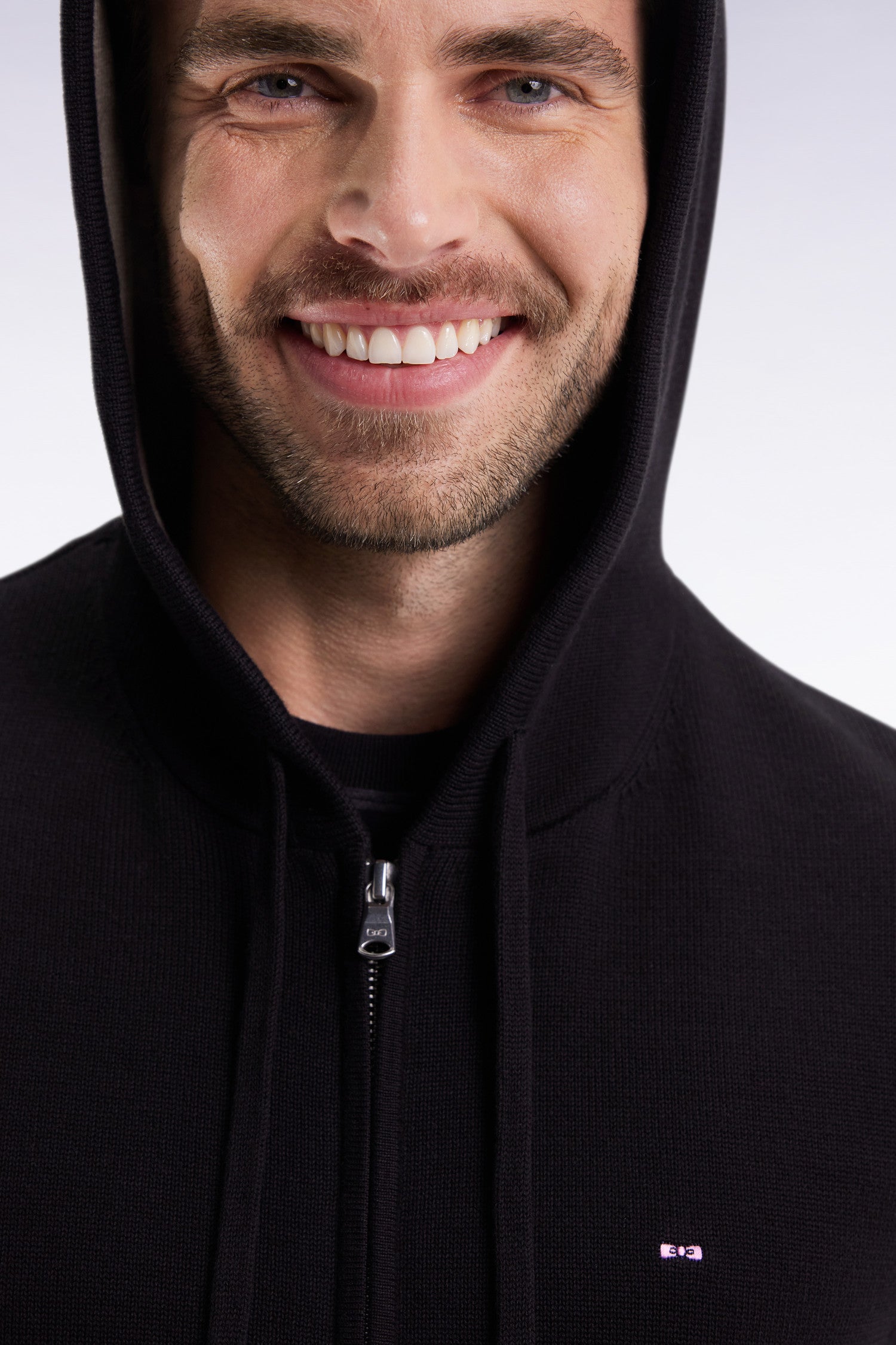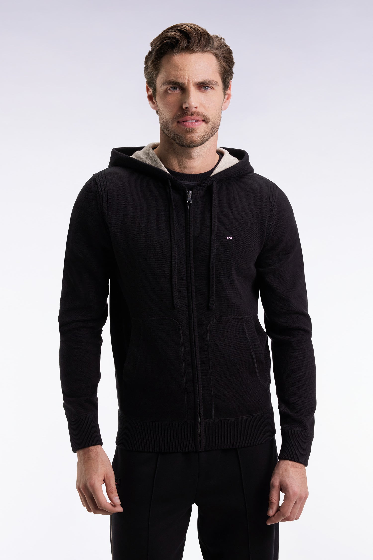 Conceived as a chic alternative to the sweatshirt, this knitted cotton hooded sweater plays the card of comfort and sport-chic style. The jersey body is complemented by a contrasting brown or beige lining on the inside of the hood, while the tapered armholes and ribbed trims add structure and hold to this trendy, timeless men's model. Kangaroo pockets and knitted drawstrings complete this piece, perfect for a casual, controlled everyday look. The perfect combination of soft knitwear and the cool attitude of a sweatshirt.
