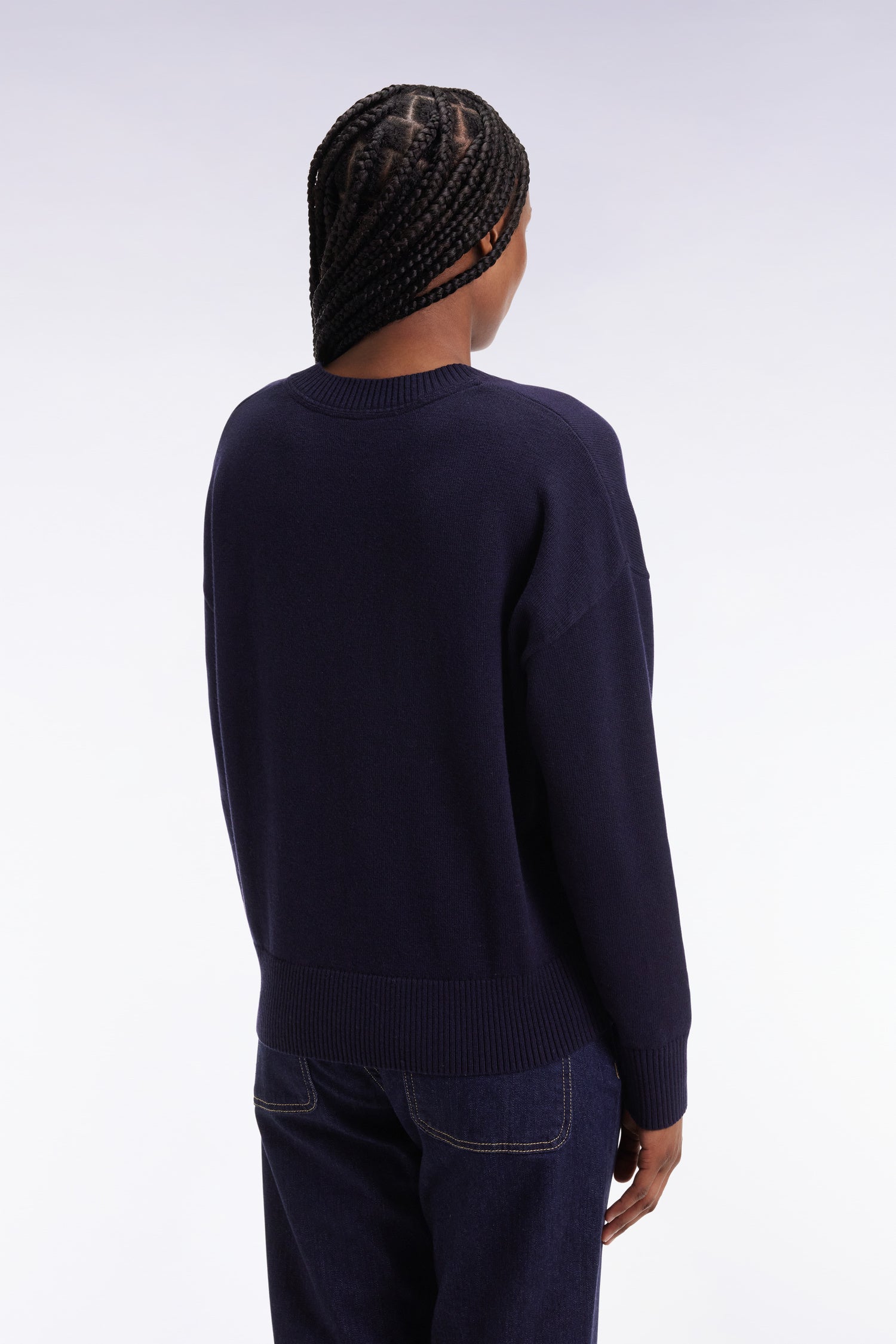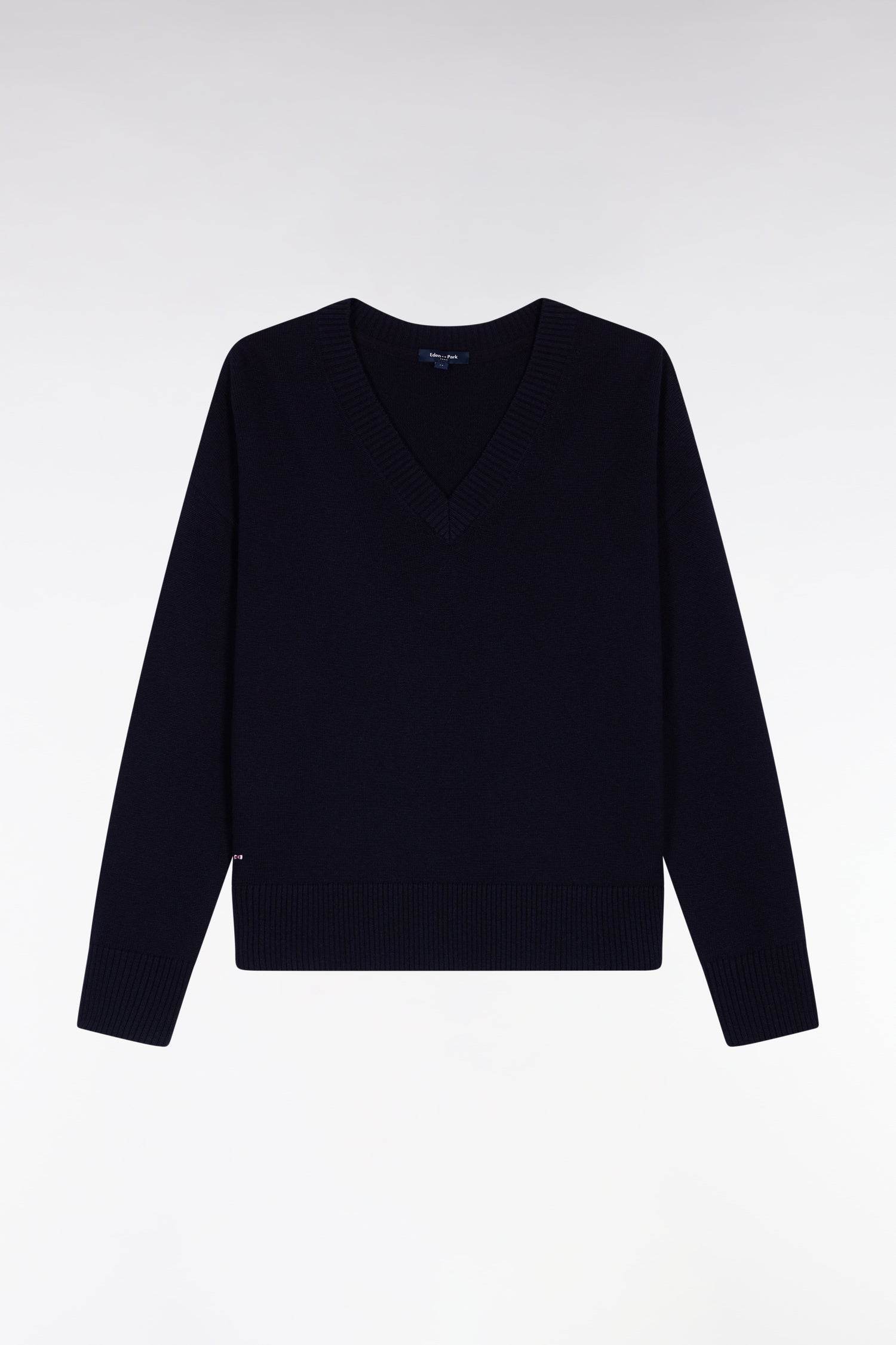 This women's V-neck sweater, knitted in a soft wool/cotton blend, has the casual elegance typical of our French sport-chic wardrobe. Its soft knit and rib-knit finishing give it a streamlined style. An essential model to wear alone or layered over a shirt. Available in 3 timeless colors