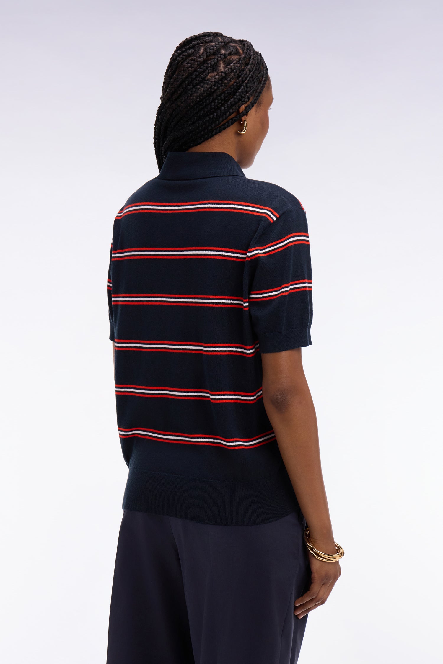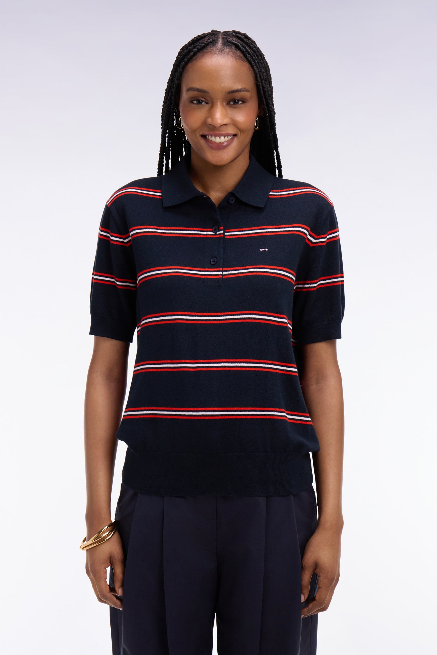 Ce pull polo à manches courtes, tricoté dans un confortable mélange de coton, polyamide et soie, offre douceur, brillance et un tomber impeccable. Ses rayures graphiques et sa maille régulière soulignent une allure chic décontractée. Ses finitions soignées valorisent le travail de la maille effectué par nos ateliers, tandis que ses boutons rugby siglés et le nœud papillon brodé apportent la touche signature Eden Park. Parfait avec un jean brut ou notre jupe en denim pour une silhouette estivale moderne.
