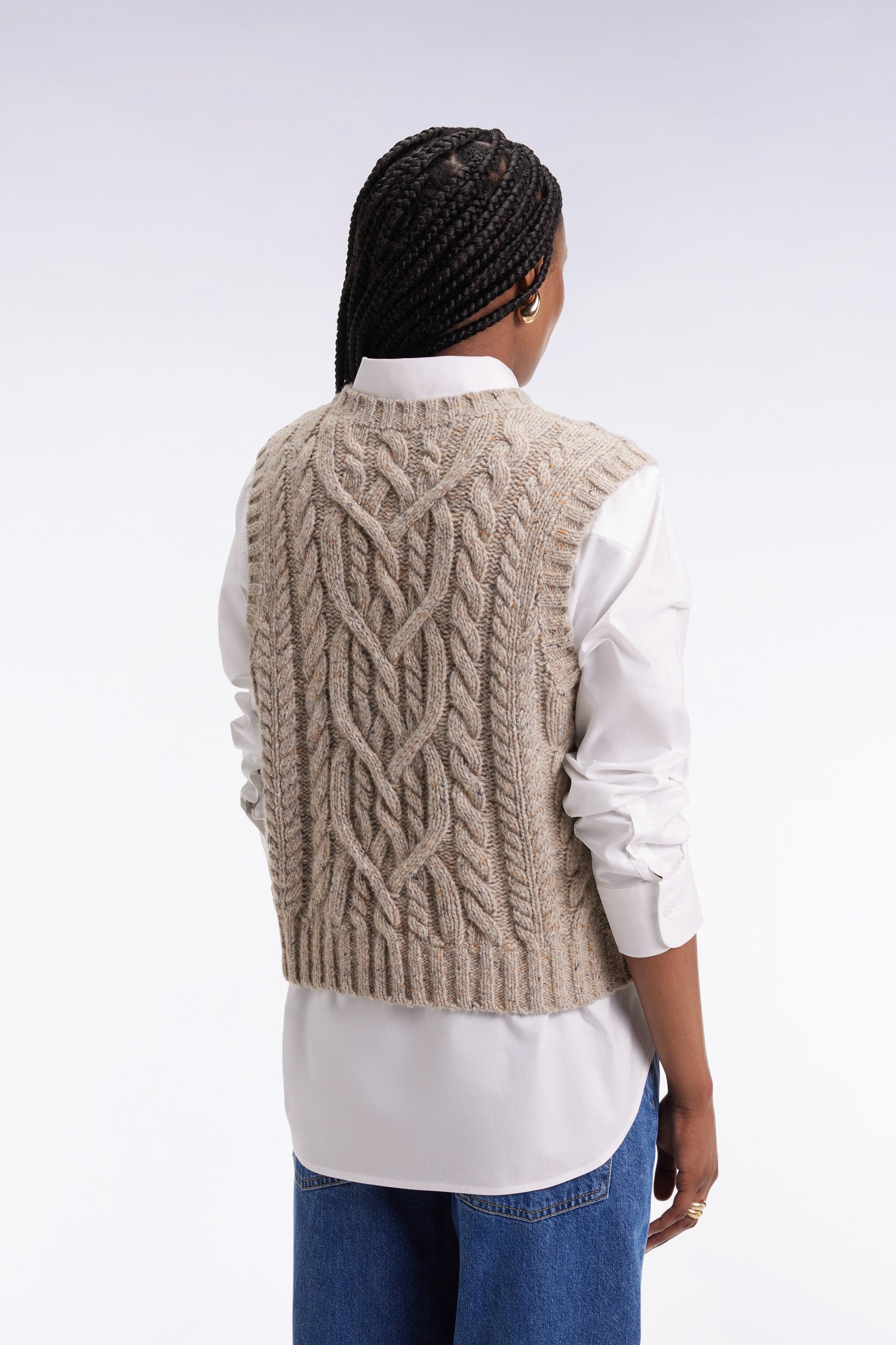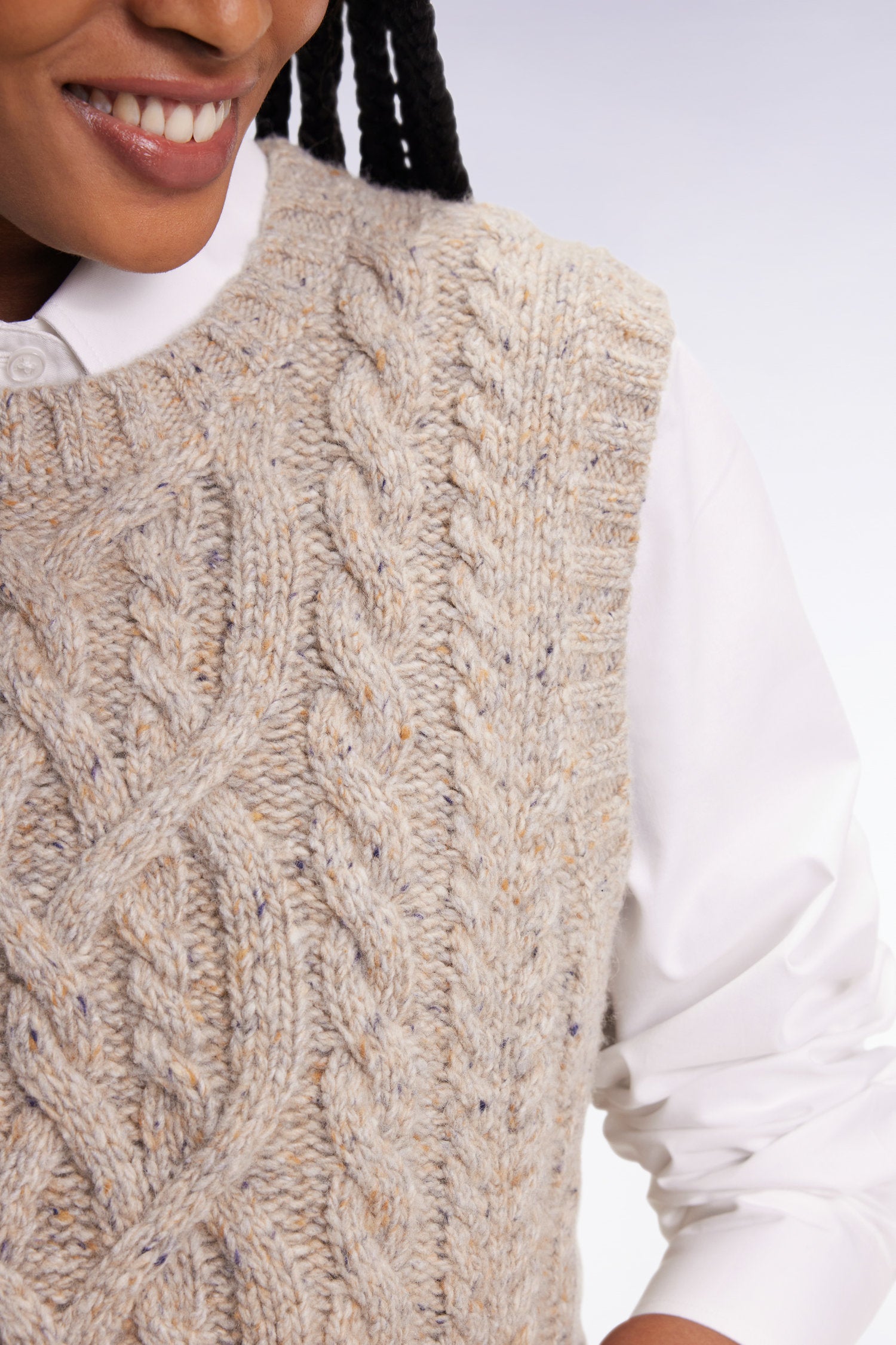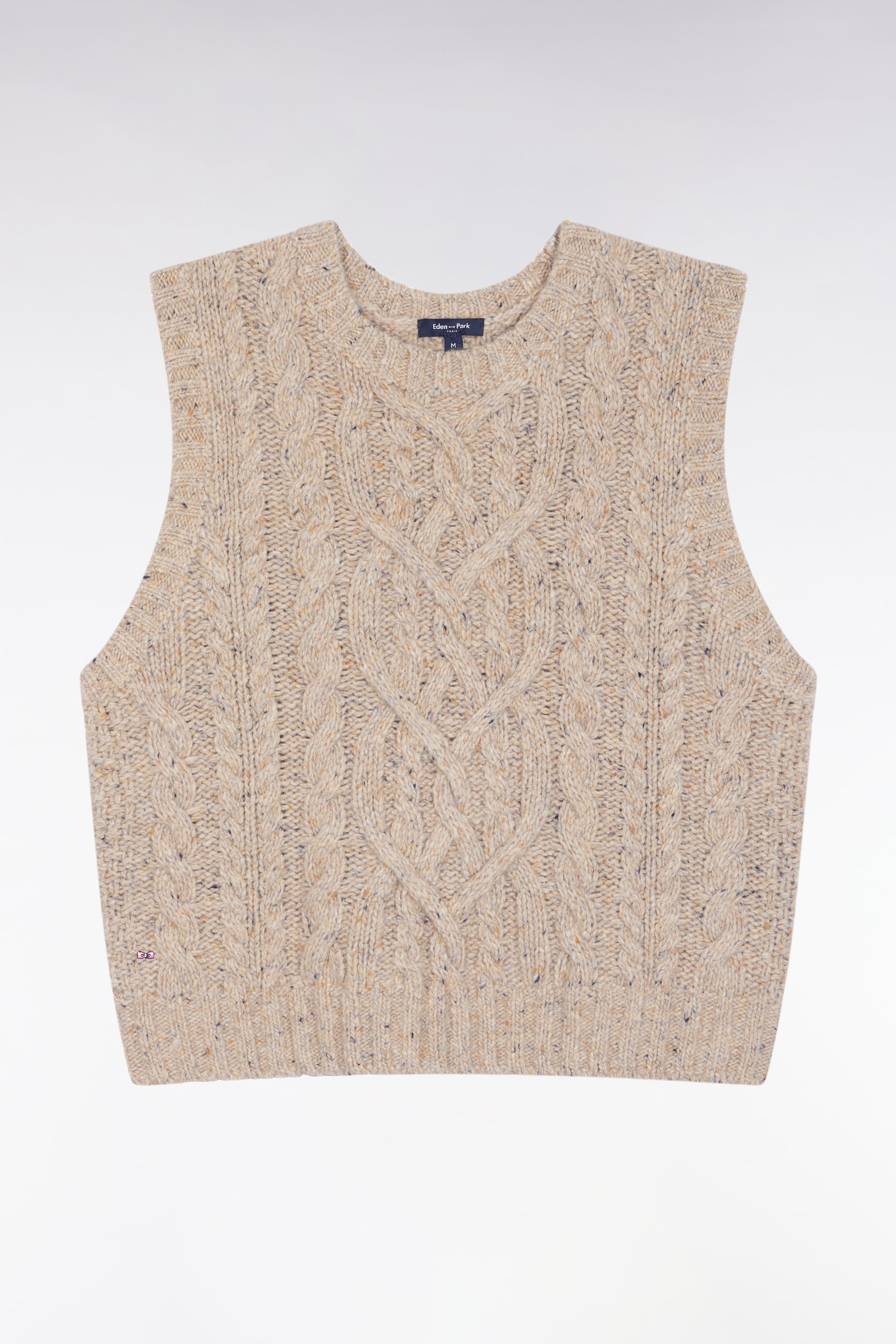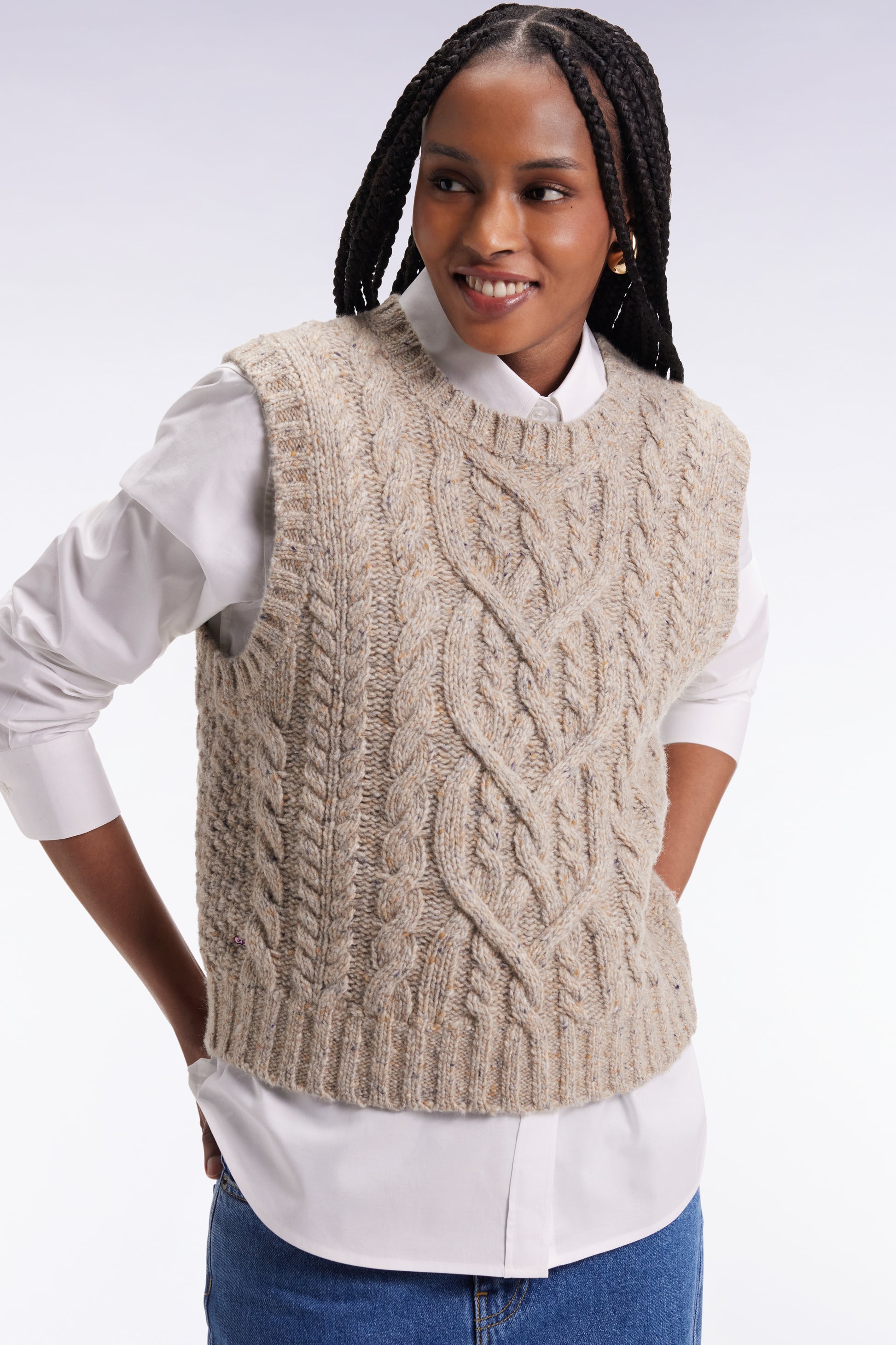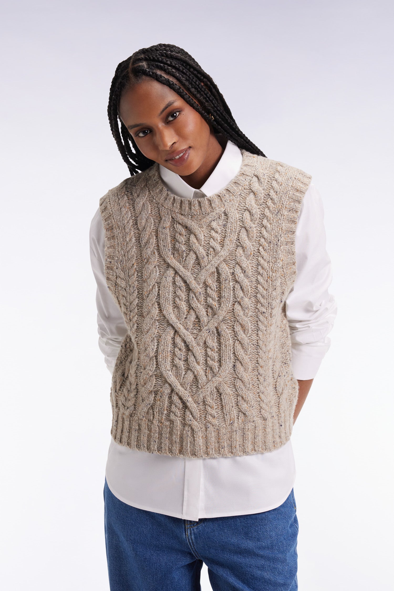This sleeveless cable-knit sweater plays on contrasts with style and boldness. Knitted in a mottled effect knit for a chunky sweater effect with controlled proportions, this women's sweater seduces with its short cut and graphic finish. Layer over an oversized shirt for an assertive, structured style that plays with volume.
