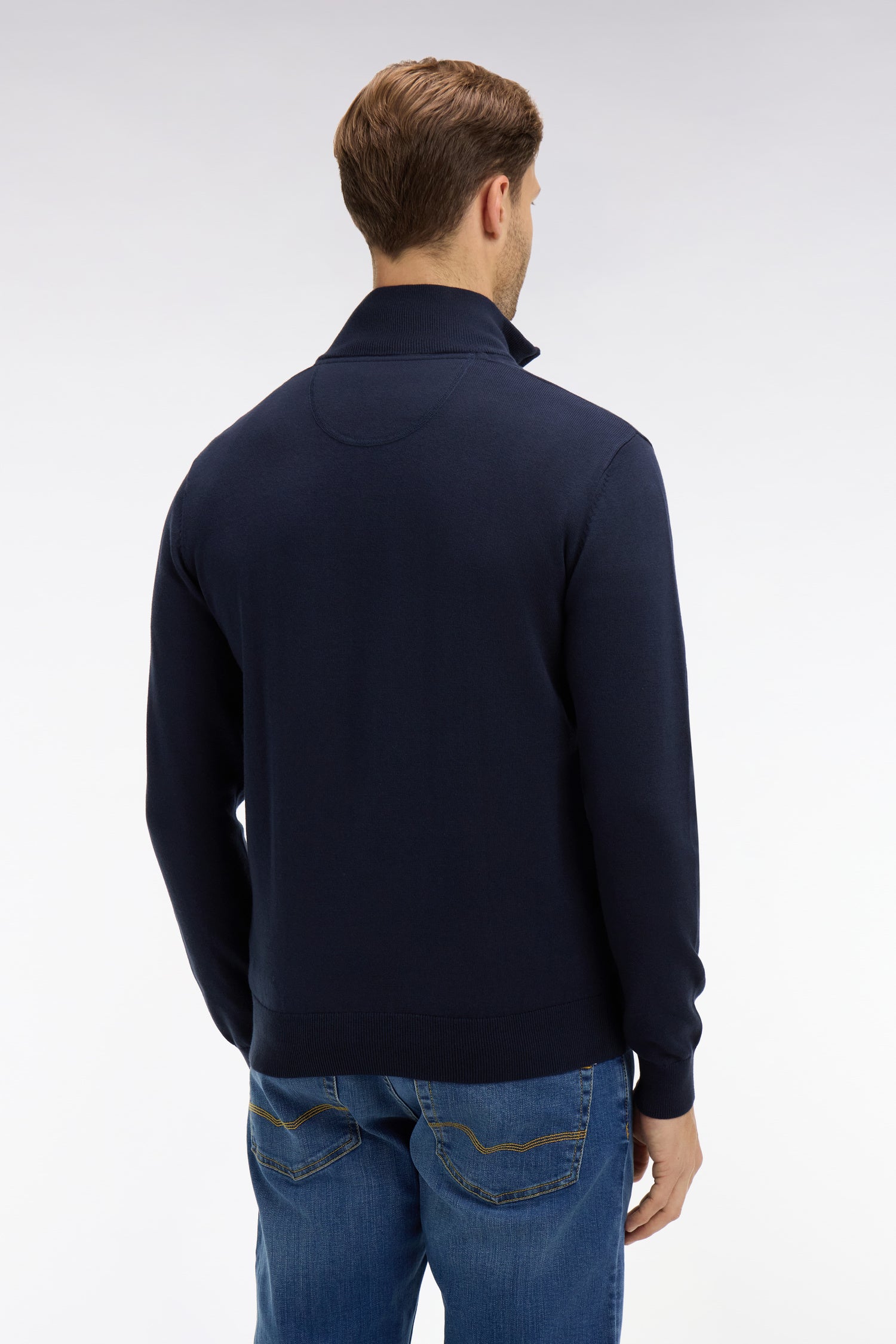 Crafted in a warm, soft cotton knit, this zip trucker neck jumper is all about simplicity. Don't miss this winter must-have, the ideal way to warm up cotton chino trousers and brown leather derbies.