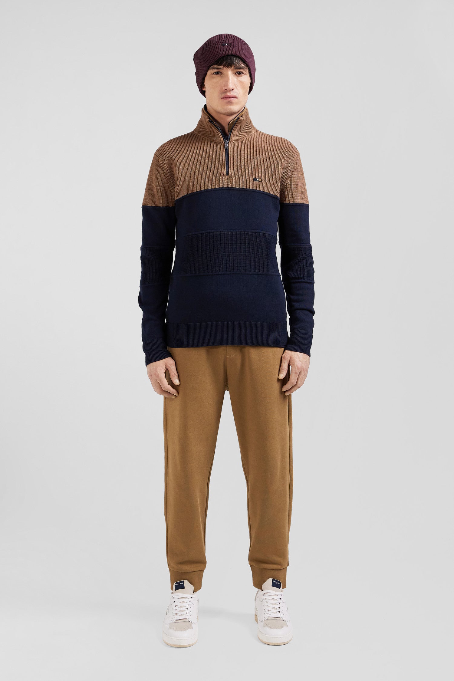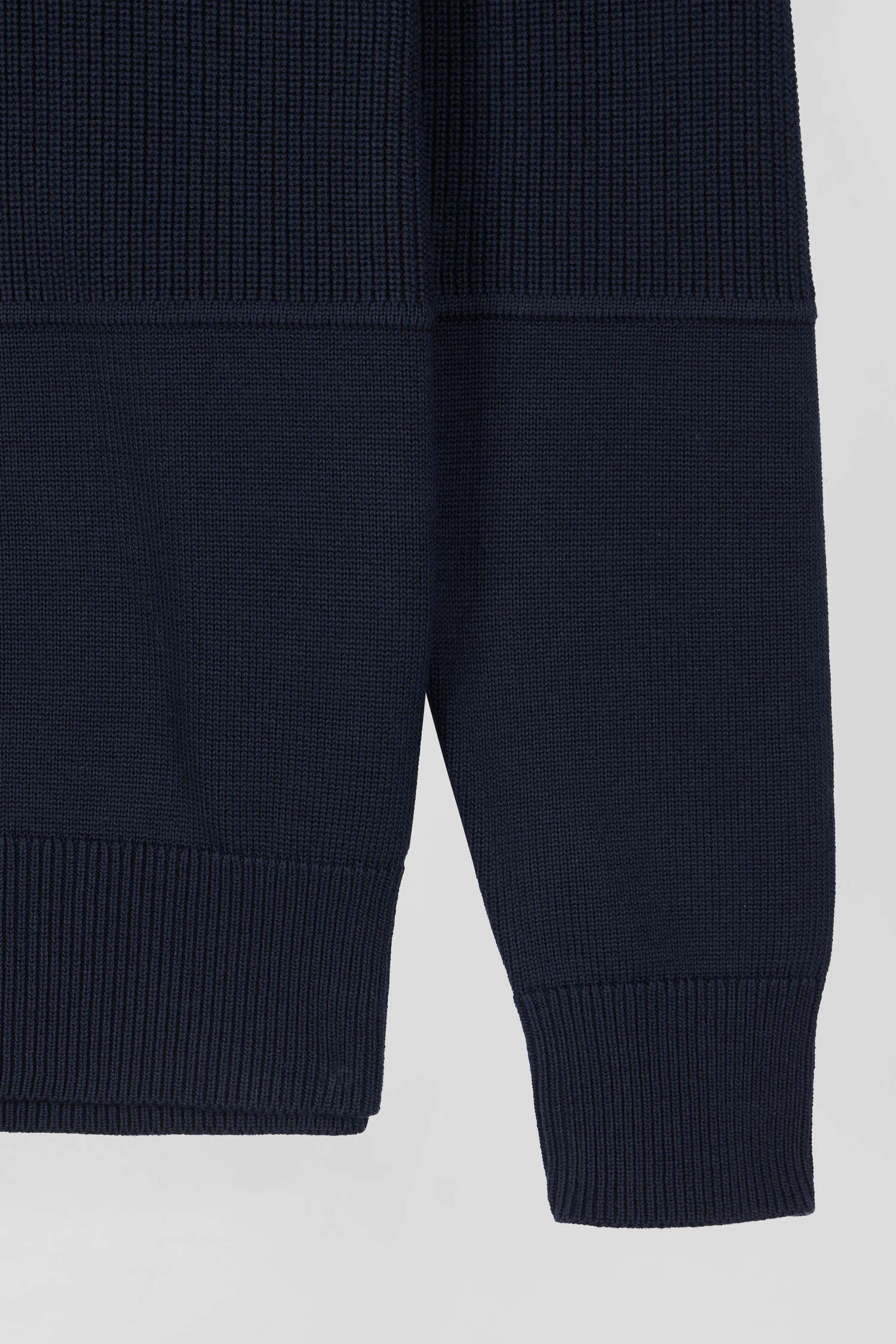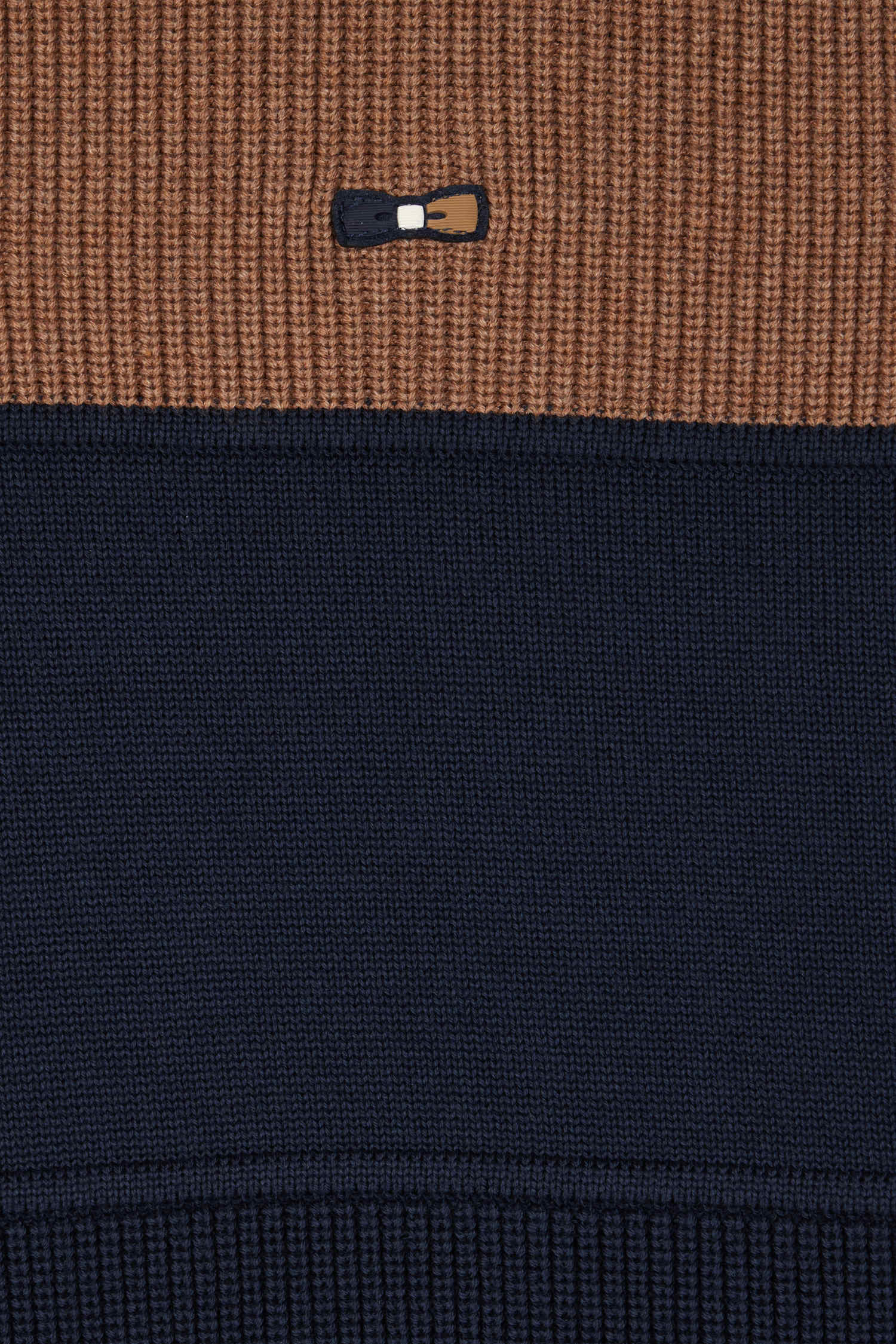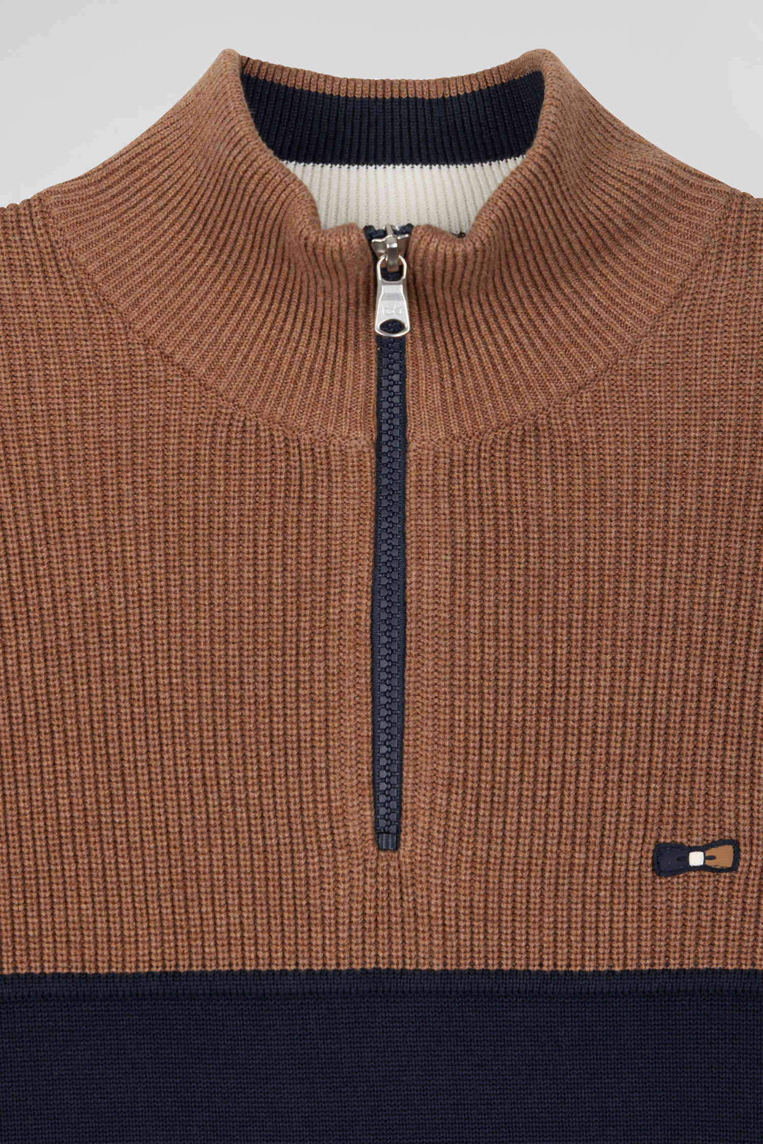 Elegance and originality merge in this zipped trucker-neck sweater. Its contrasting interior stripes and jersey half-moon are enhanced by a tricolored knitted ribbon, for a discreet touch of sophistication. The play of pearled ribbing alternating with jersey creates a striking trompe-l'oeil effect, evoking a contemporary cut-and-sew style paying homage to rugby jerseys and their distinctive tailoring. This revisited masculine essential is perfect for a refined yet casual look.