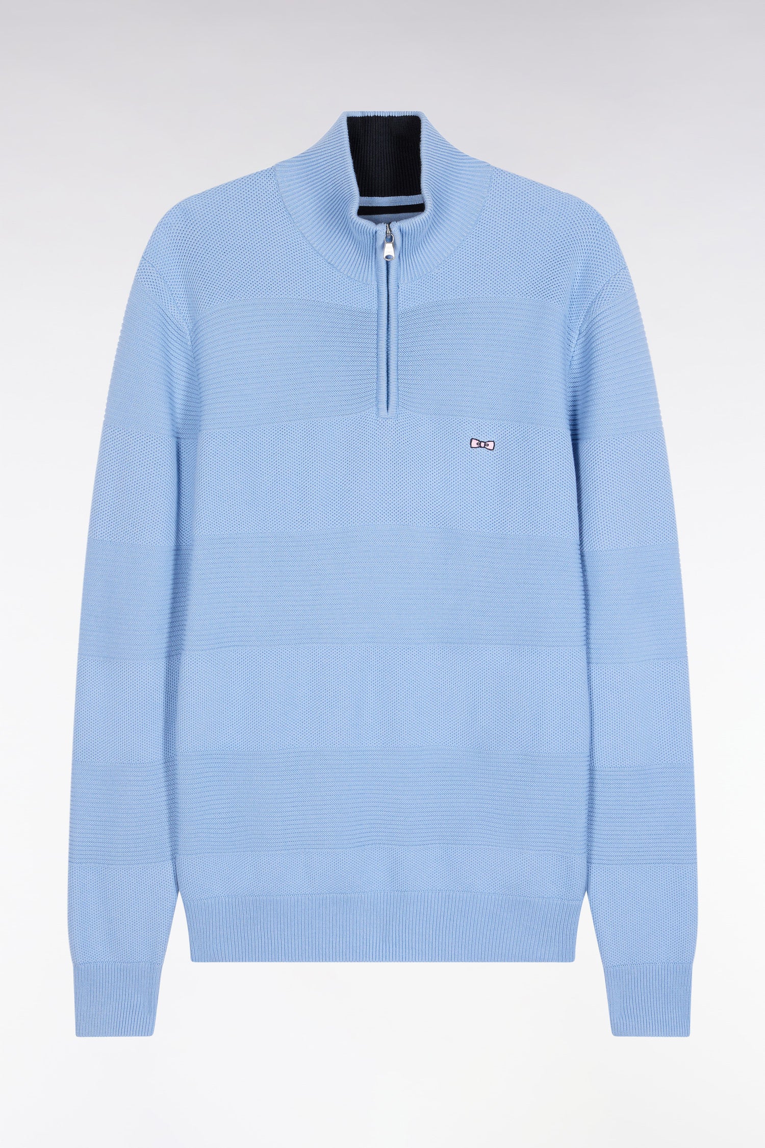 Proud of its sporting heritage, this trucker-zip sweater in pure cotton features a double knit while guaranteeing a long-lasting feeling of comfort. Its play of textures recreates, tone-on-tone, the emblematic stripes of rugby jerseys. The comfortable straight cut, high zip collar and pink bowtie embroidery on the chest make this graphic yet timeless piece perfect for combining style and casualness in everyday life. This model, which has become a classic in the Eden Park men's wardrobe, is available in 4 timeless shades