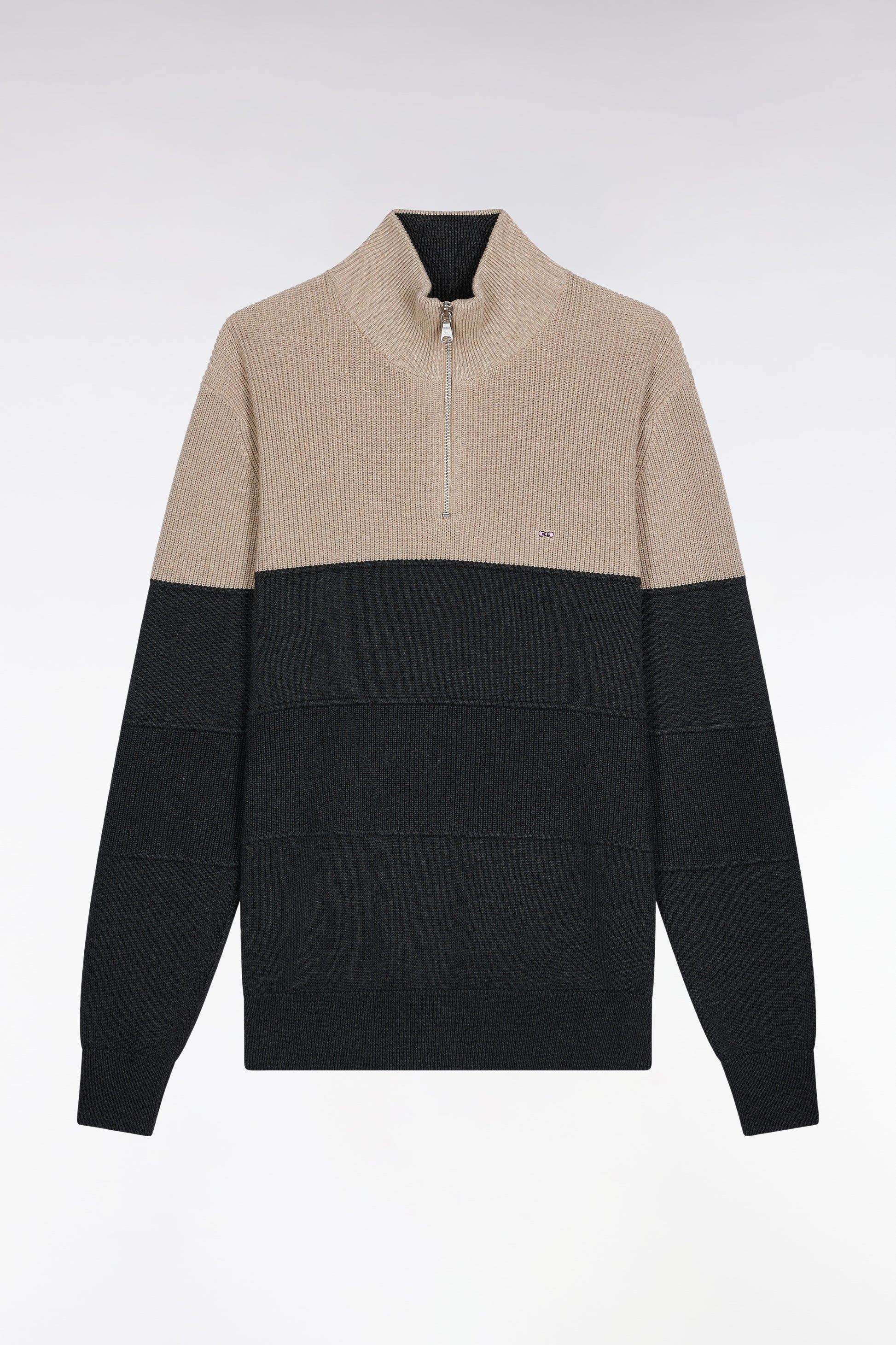 Inspired by the world of rugby, this high-neck zip-up sweater revisits the iconic stripe in a sophisticated urban version. With its mix and match of colors and subtle alternation of knit stitches, it plays on textures to give rhythm to the silhouette. A powerful piece, designed to combine sporty allure with contemporary elegance.