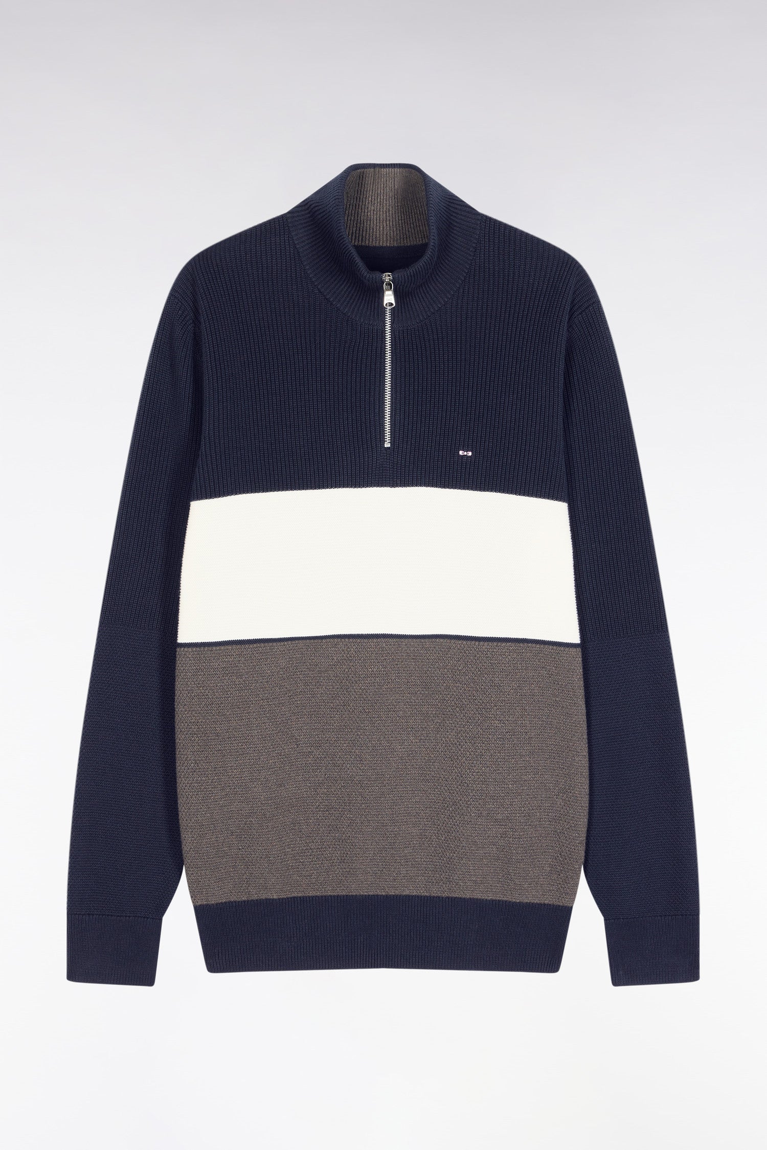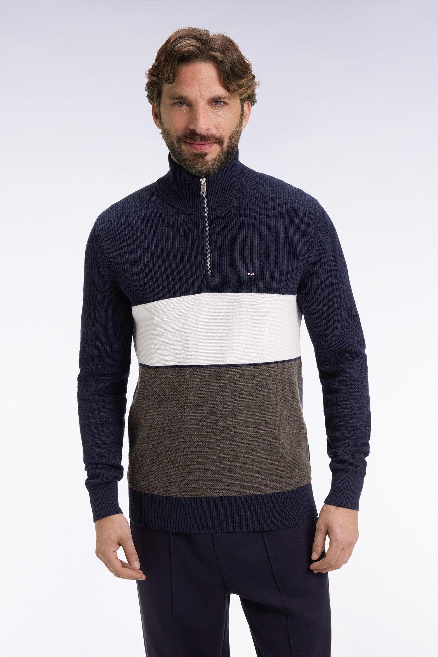 True to the Eden Park heritage, this tricolor sweater offers an elegant interpretation of the rugby stripe. Alternating textures, a mix of knitting stitches and refined color combinations: every detail underlines the House's expertise and gives this zip-neck sweater its resolutely contemporary character.