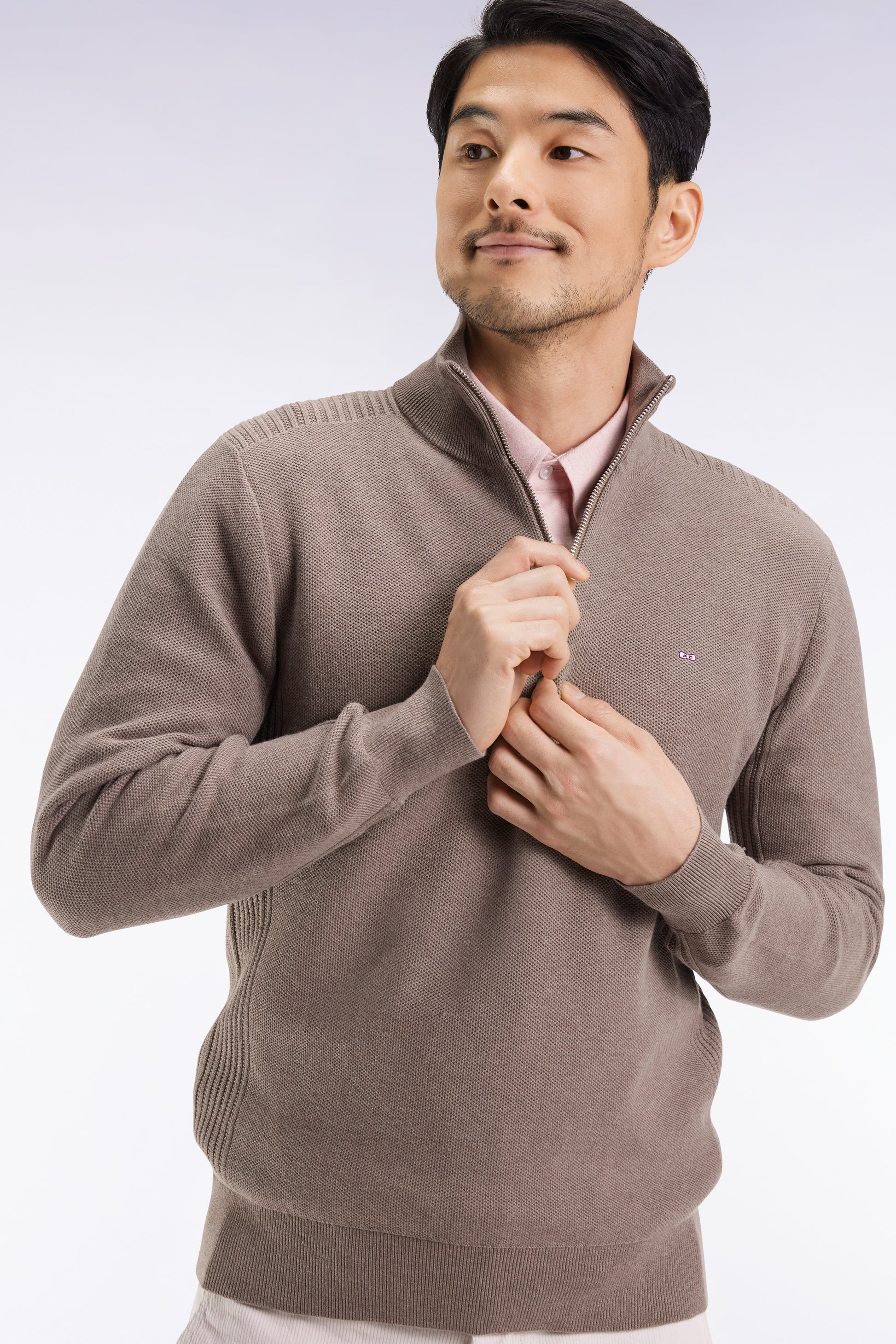 Knit in a honeycomb cotton for a subtle, lightweight texture, this trucker sweater with zipped collar features rib knitting on the sides, shoulders and undersleeves. Its high zip collar allows you to modulate the look to suit your mood. Available in a range of timeless colors, it's a men's wardrobe essential, to be worn season after season.