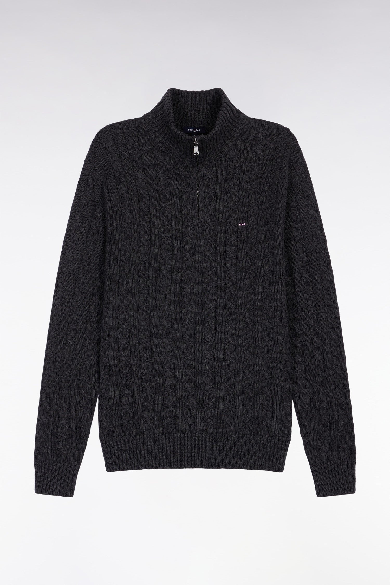 With its zipped stand-up collar and twisted knit, this pure cotton sweater has a trendy, preppy look. Its meticulous finishing and knitwork give depth to this piece, designed to combine comfort and elegance all day long. Available in 4 timeless colors: beige, navy, gray or brown, this cable-knit sweater is a must-have for men's wardrobes, whether worn alone or layered over a shirt.
