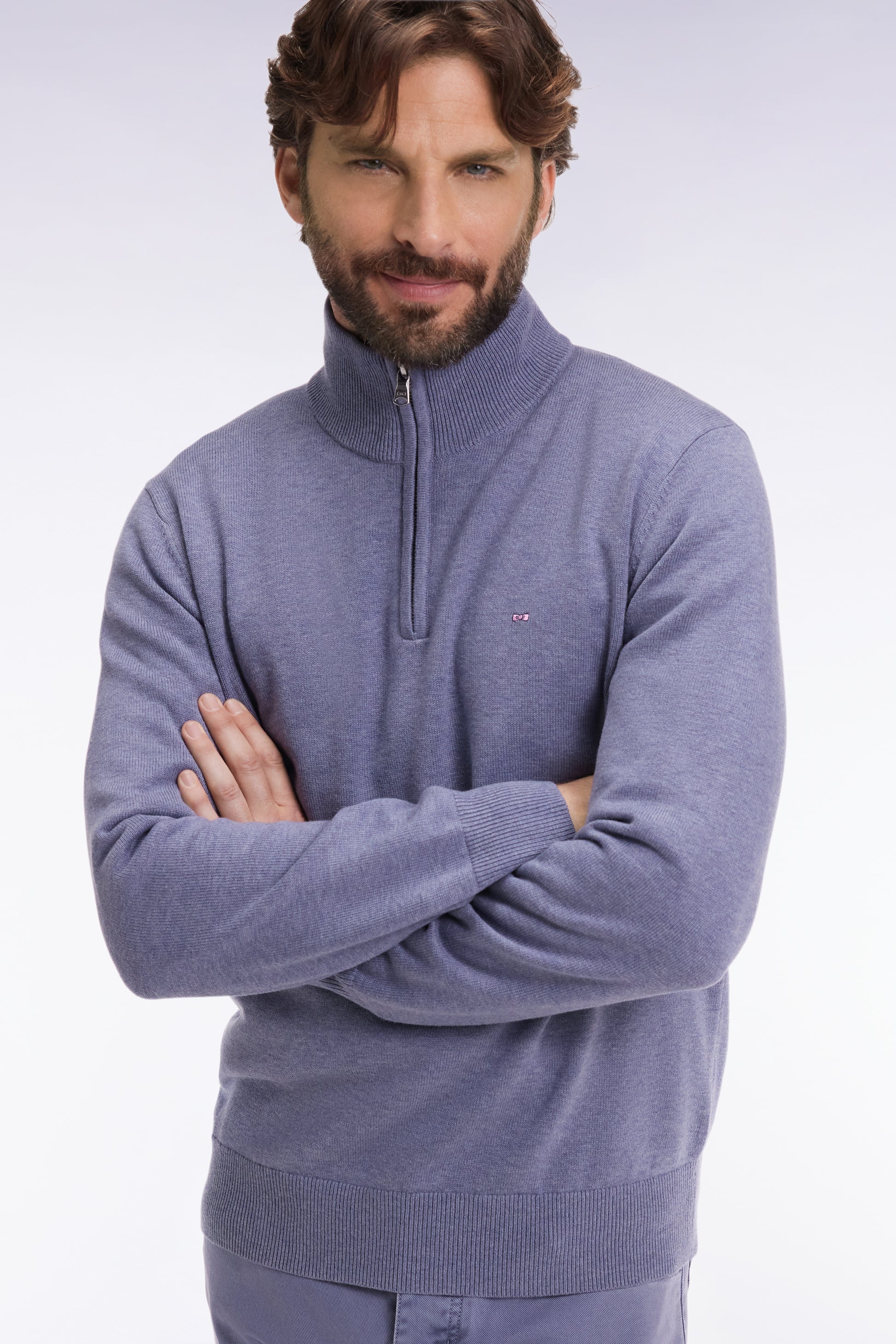 A men's wardrobe classic, the zipped trucker-neck sweater in wool and cotton blend embodies the functional elegance of the Eden Park wardrobe. Its comfortable straight cut lends itself to all kinds of layering. The bowtie embroidery on the chest and the signature slider zip give this timeless sweater the discreet signature of our French house. All you have to do is choose from 14 colors!