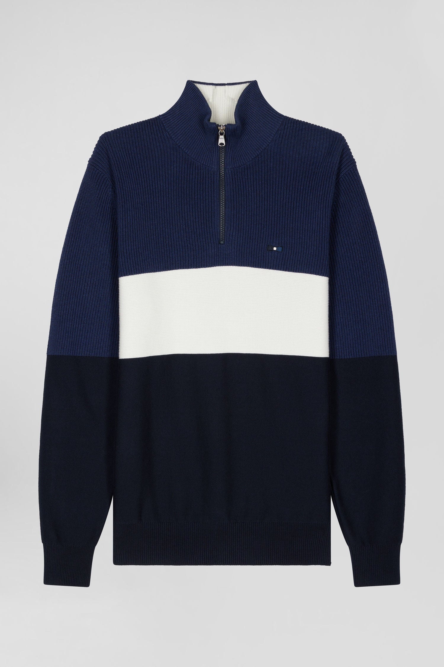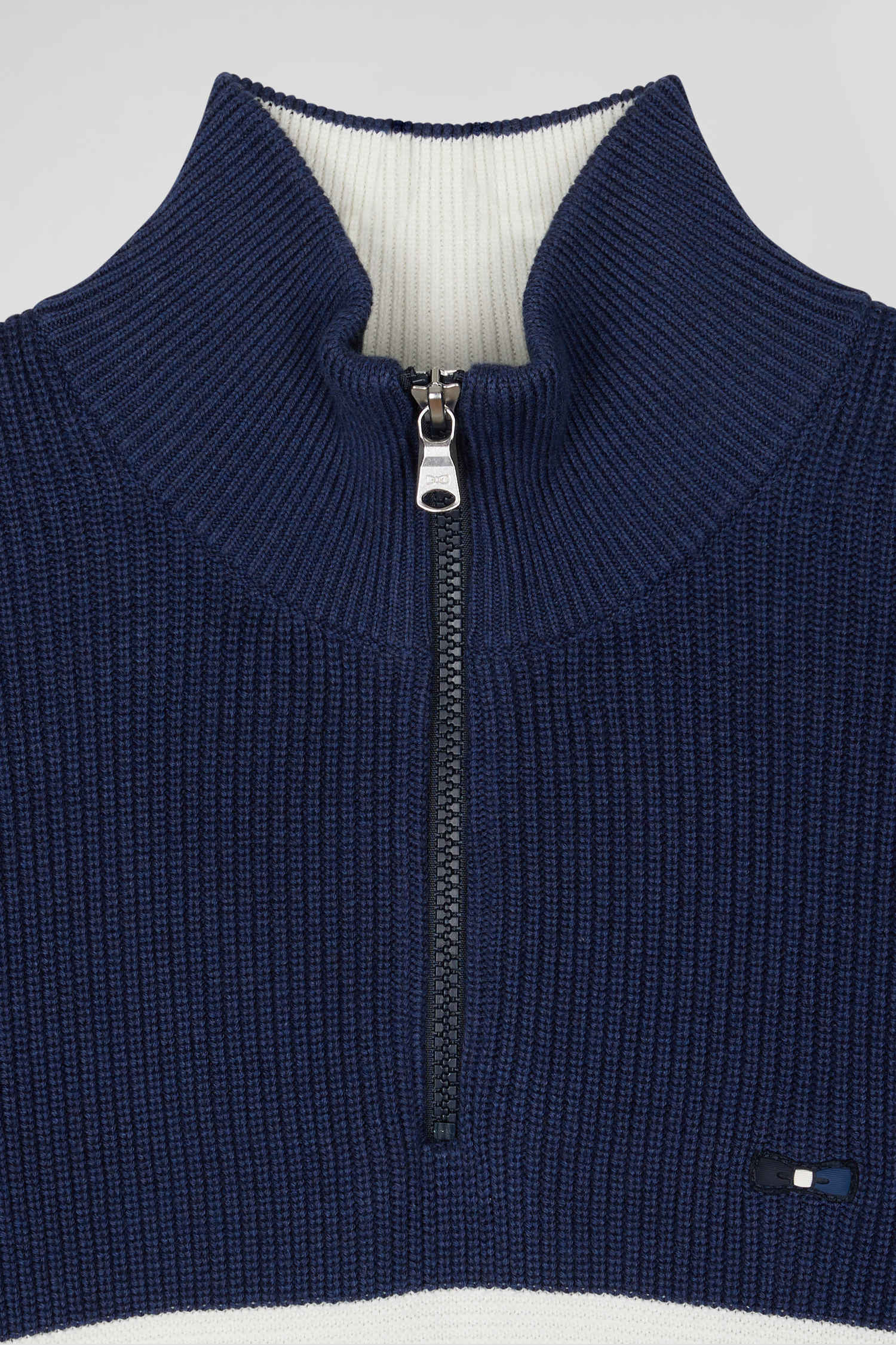 Regular dark blue semi-zipped cotton jumper with knit patterns