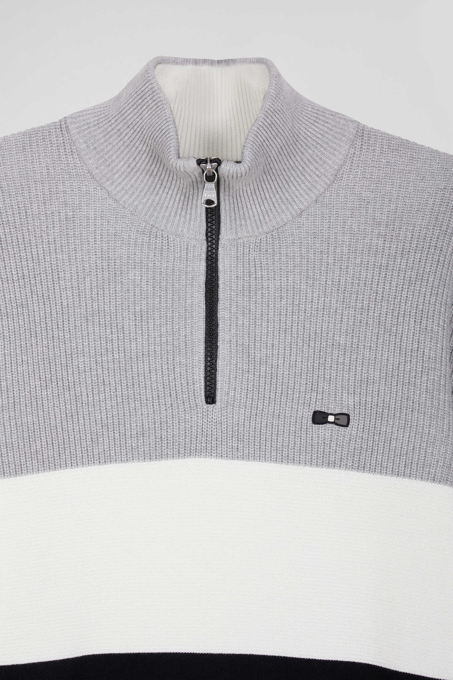 This zip-up stand-up collar sweater reveals meticulous finishes like its elegant vertical stripes on the inside, its jersey half-moon and the tricolored knit detail that enrich its interior with distinction. Alternating pearl ribbing, reverse jersey and Ottoman stitch create a subtle contrast, offering a versatile piece in three timeless shades for everyday style.