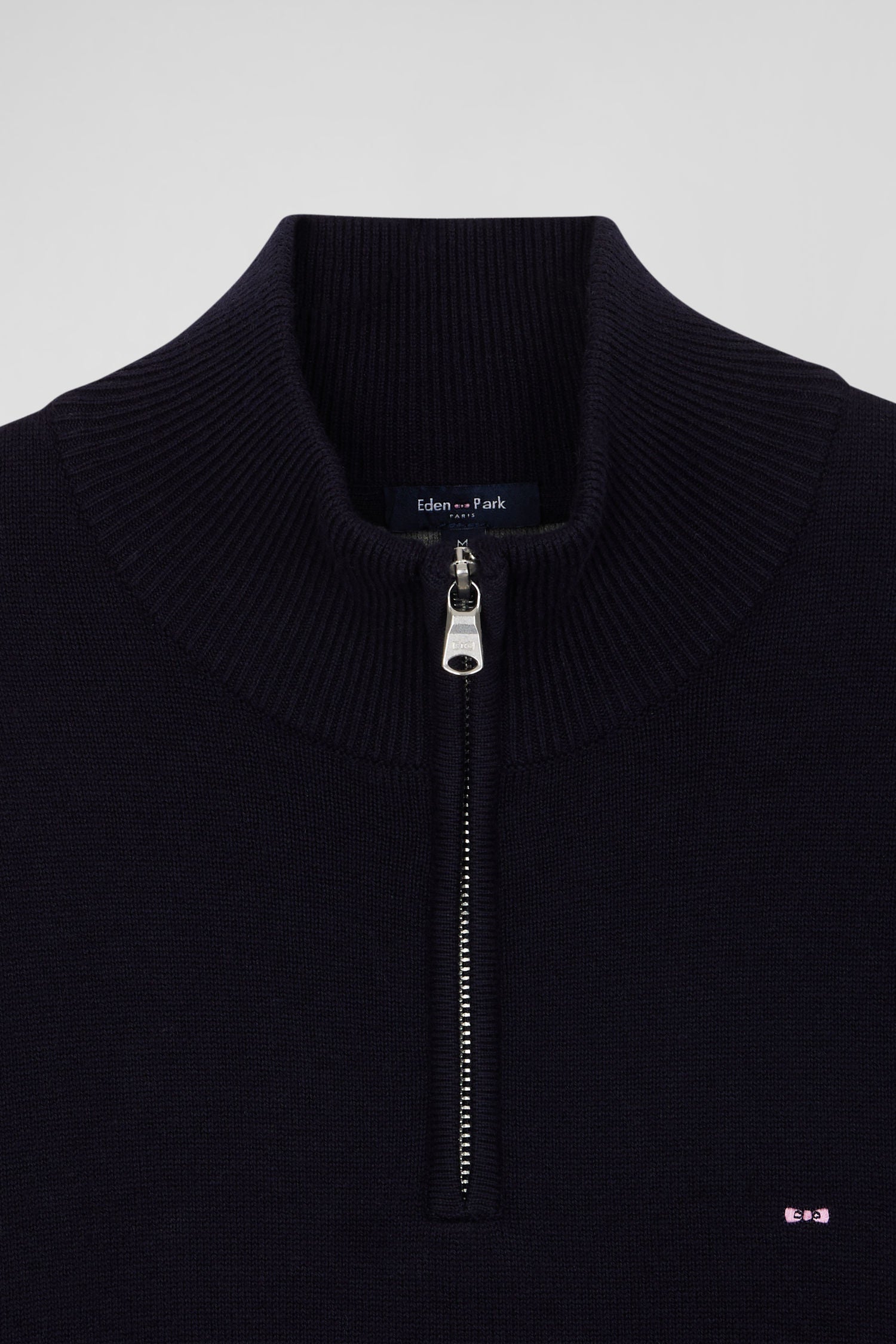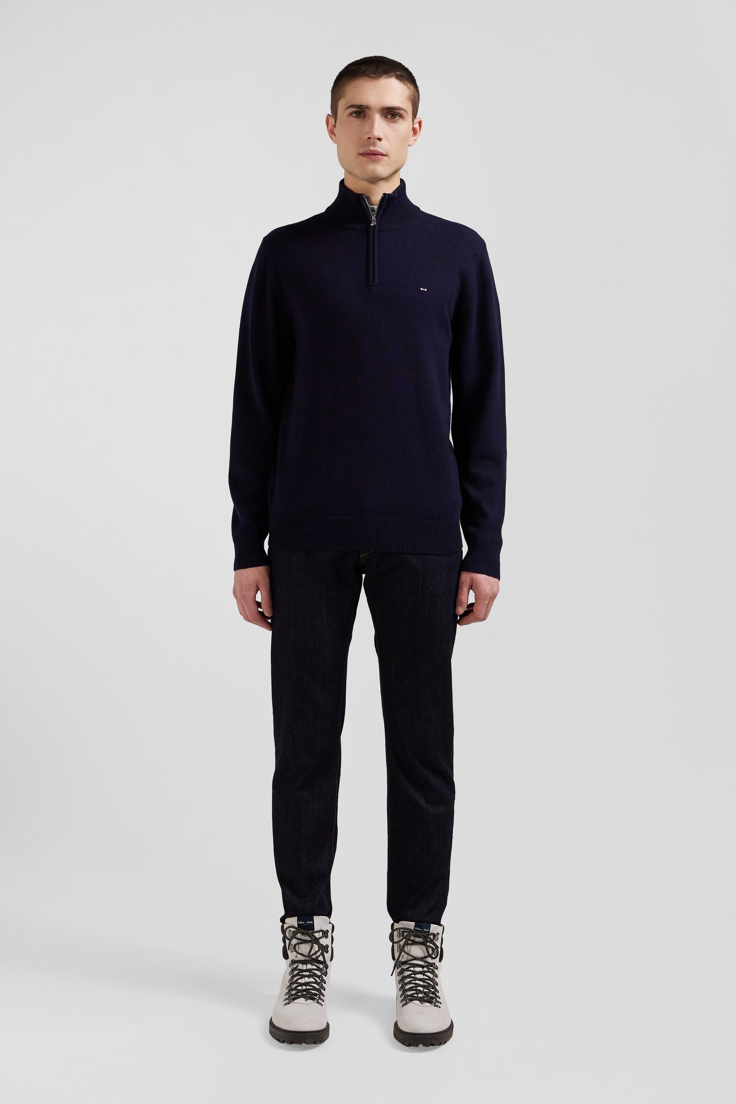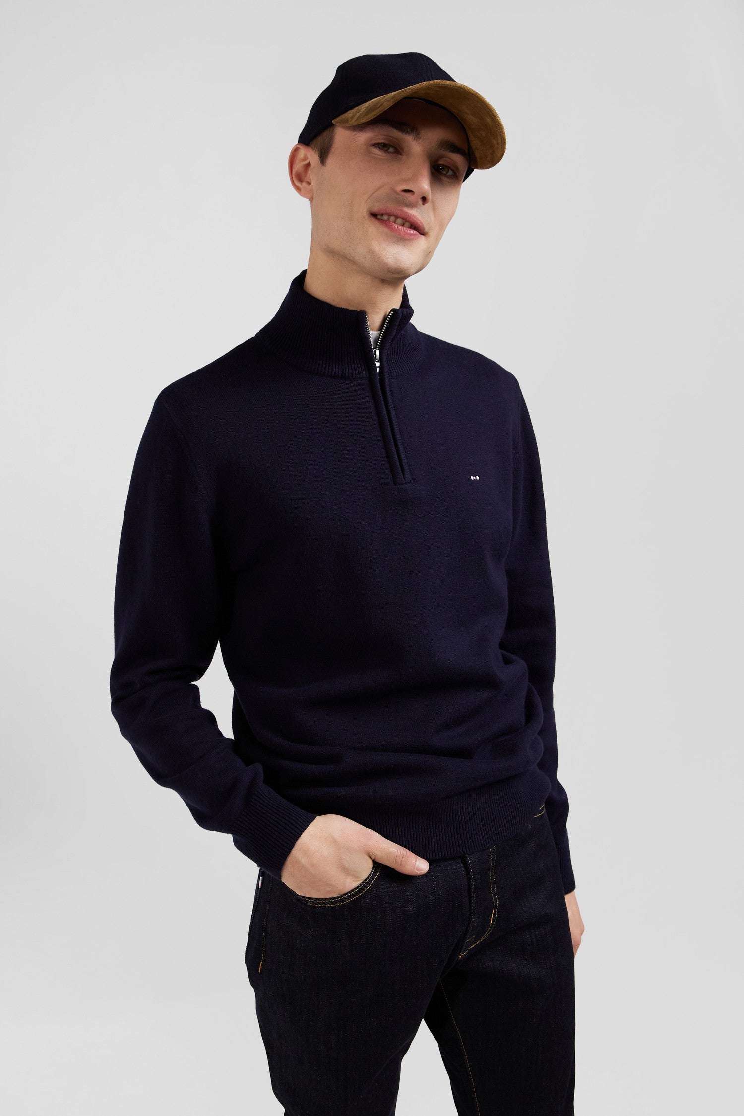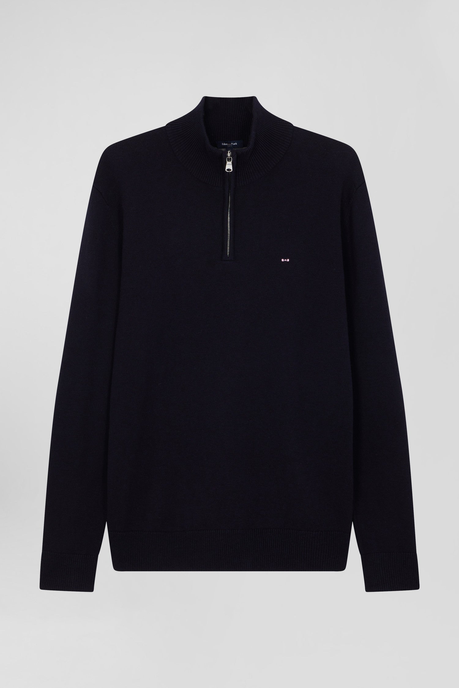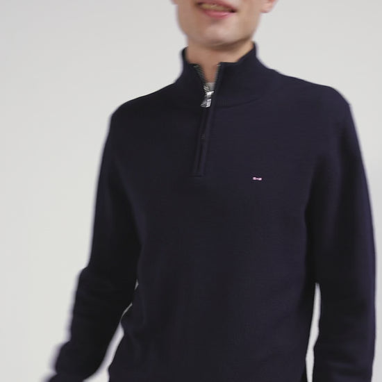 Regular navy blue semi-zipped wool and cotton jumper