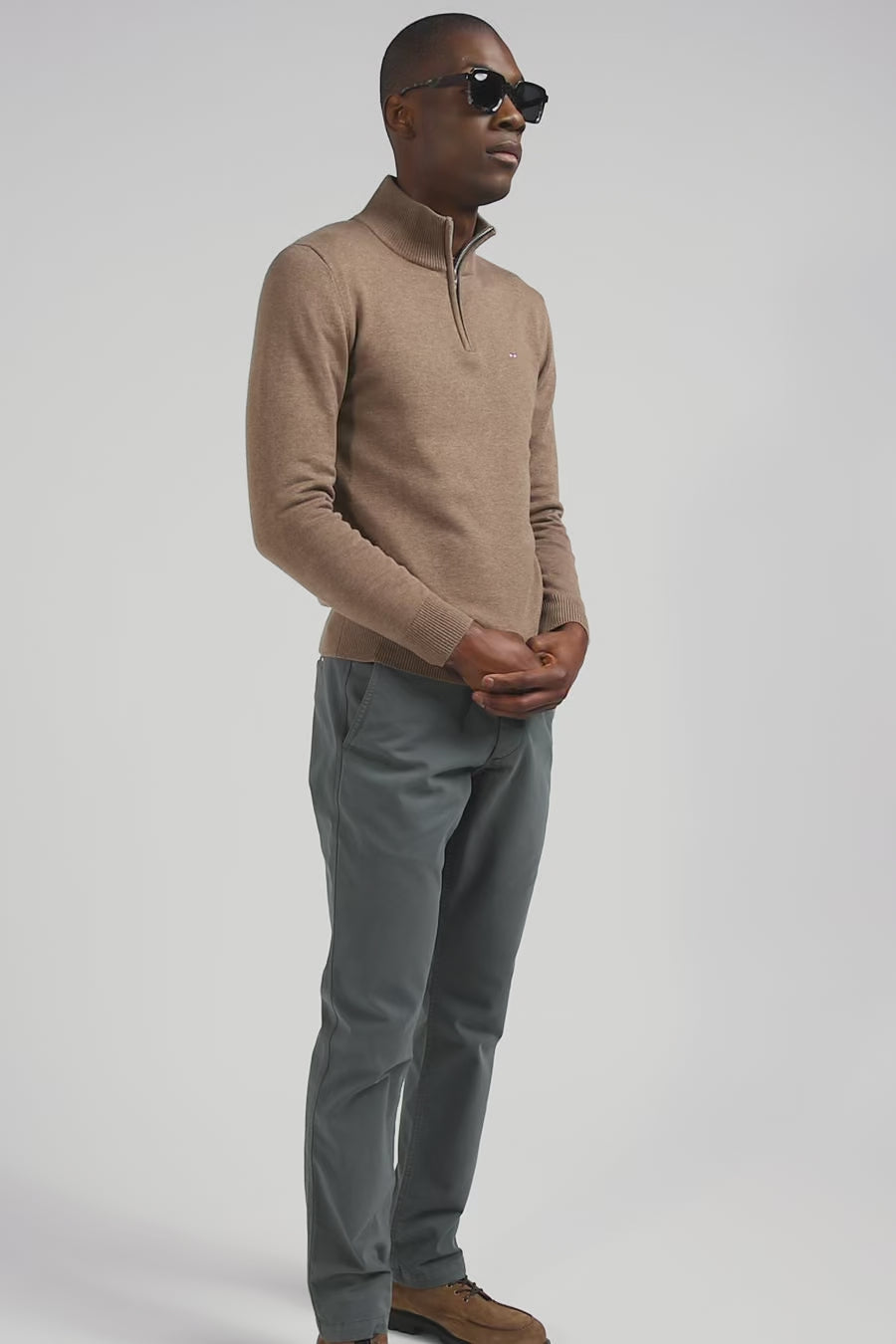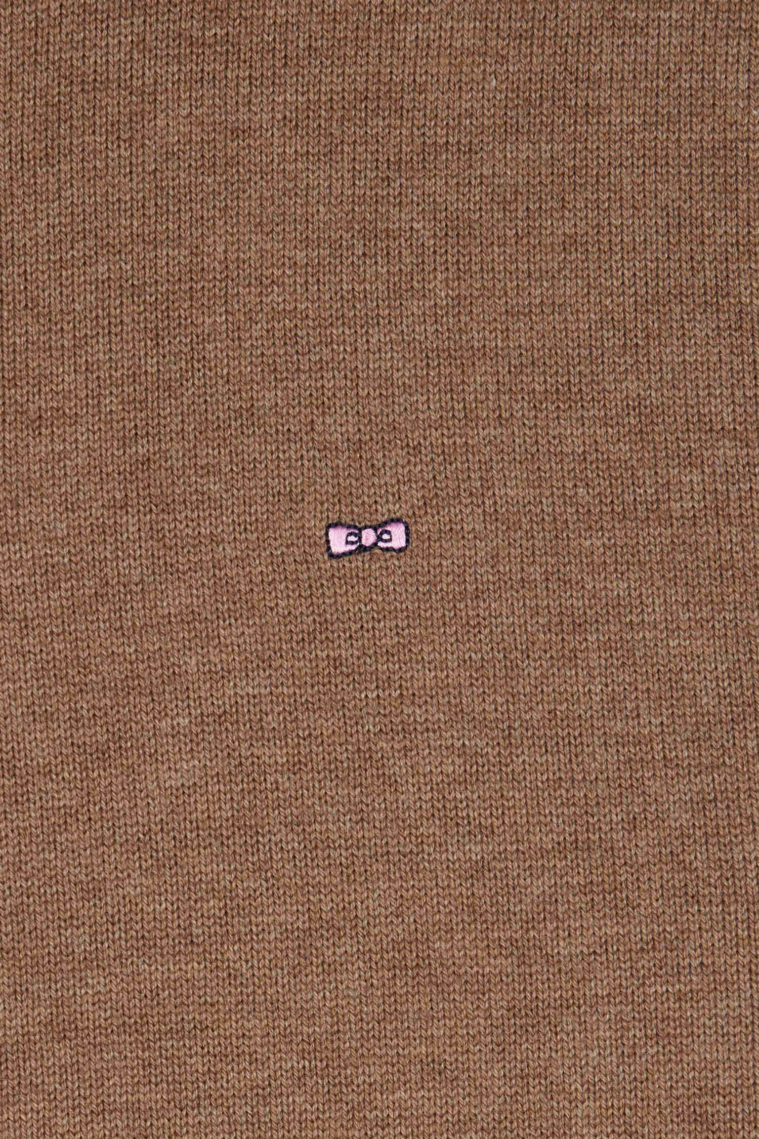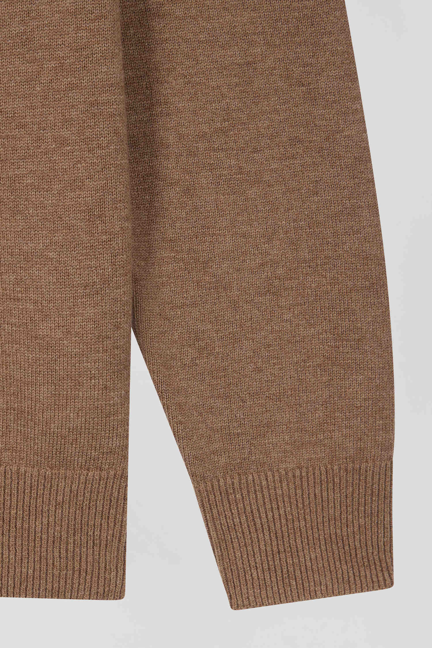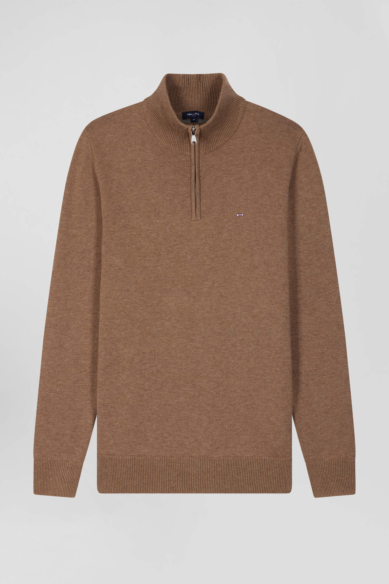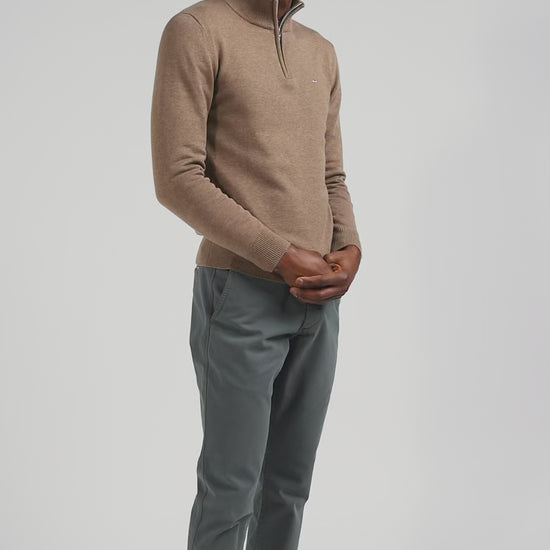 Regular brown semi-zipped wool and cotton jumper