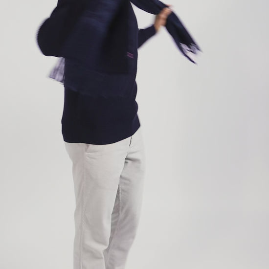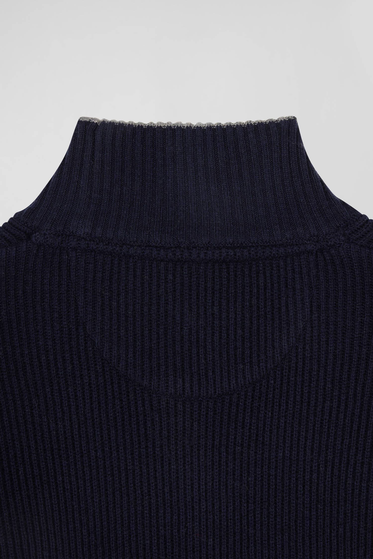 This mock-neck sweater, crafted in a soft wool/cotton blend, is the epitome of casual refinement. The ribbed edges, enhanced by fine contrasting piping, add subtle elegance while ensuring this men's sweater falls impeccably. Its English rib knit offers a rich, comfortable texture. A ribbon knit inside the collar adds an extra touch of sophistication to this straight-cut sweater, perfect for a neat, timeless look.
