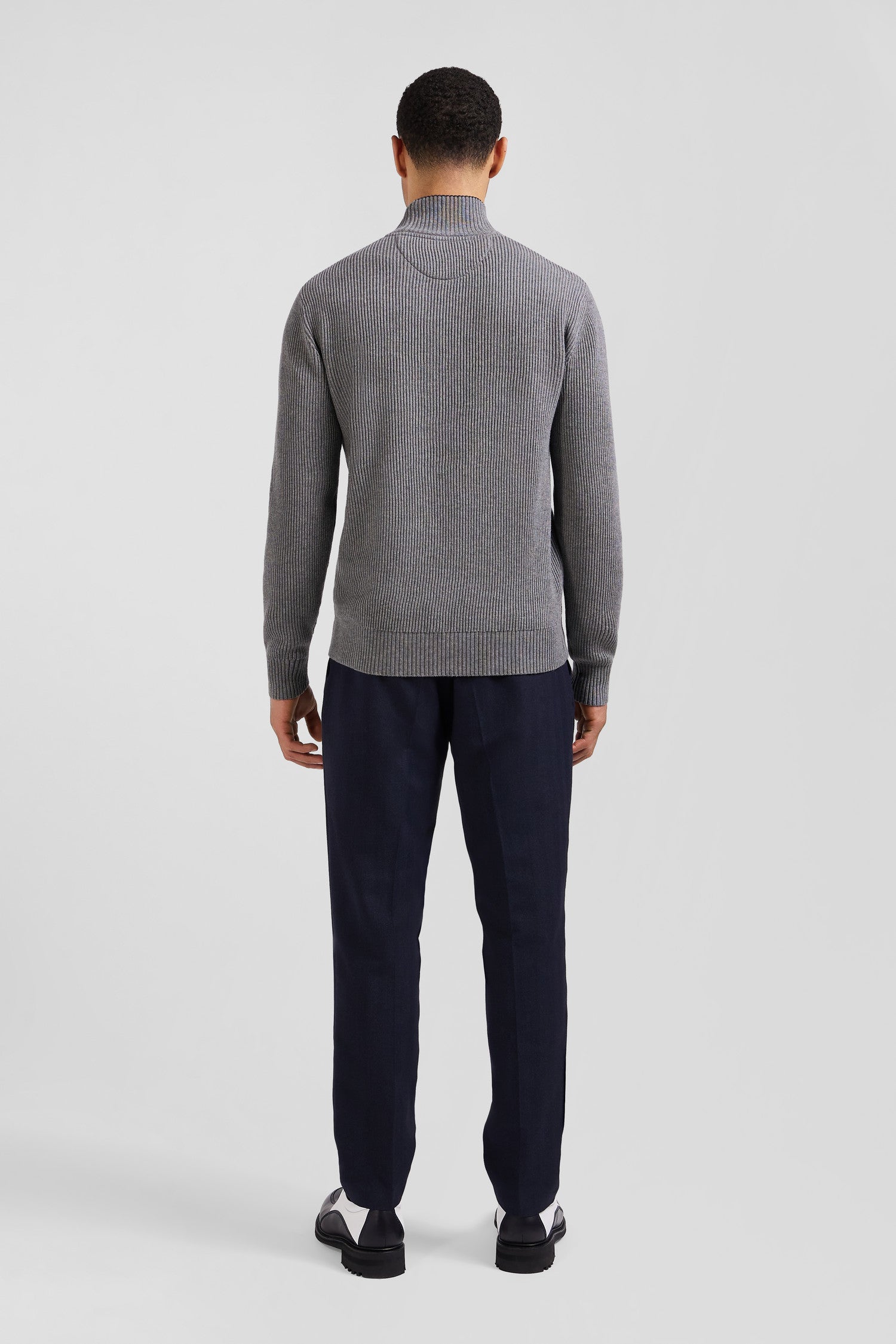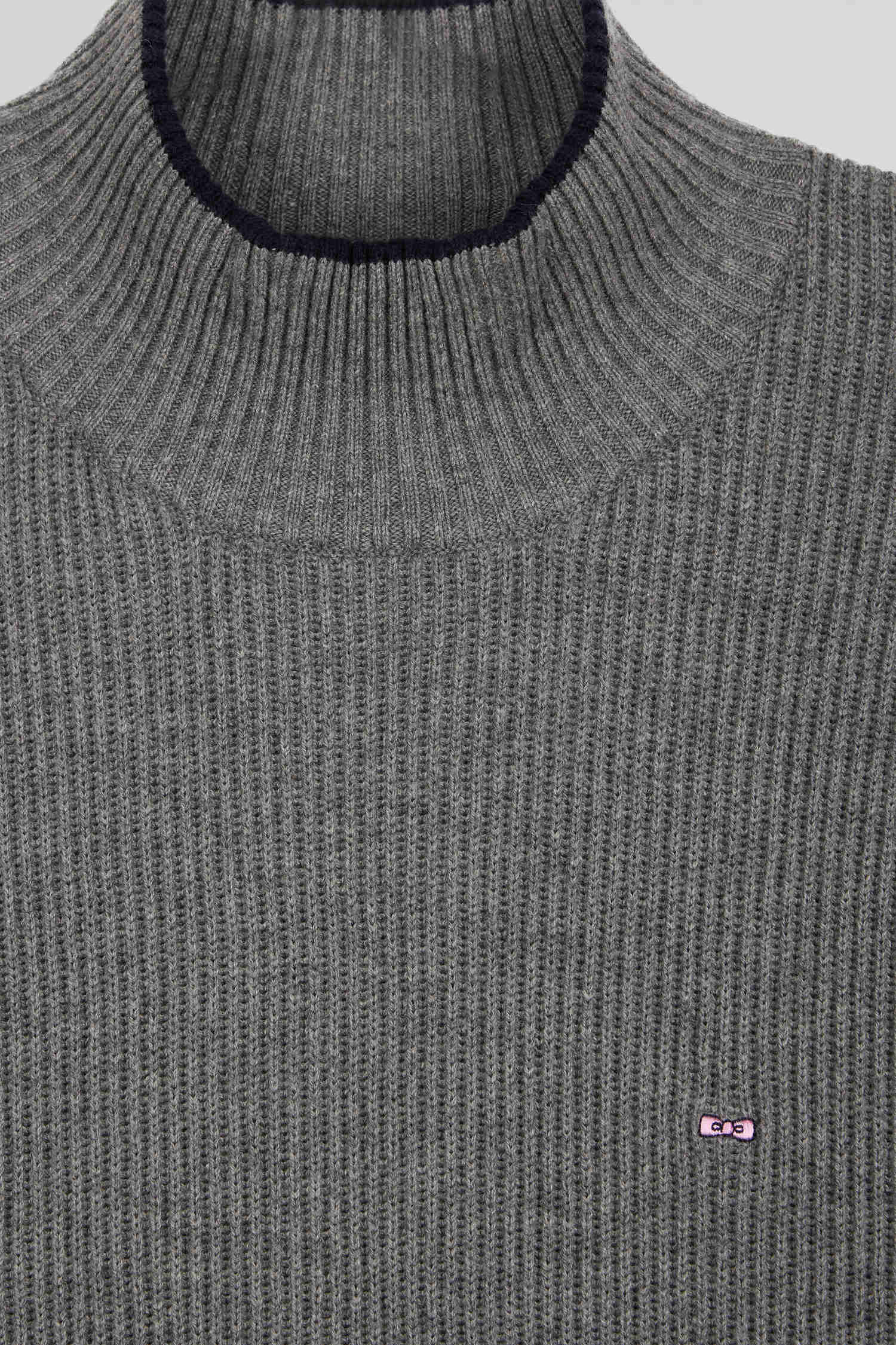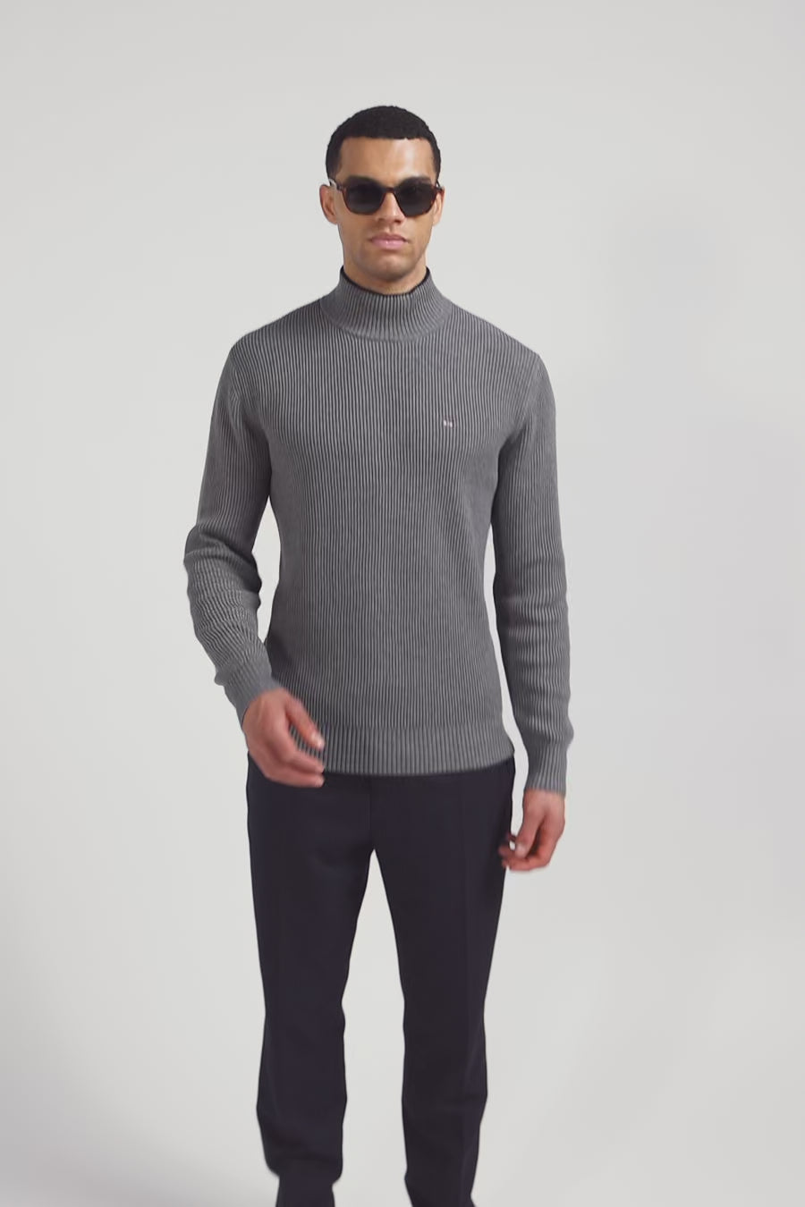 This mock-neck sweater, crafted from a soft blend of wool and cotton, is the epitome of casual refinement. The ribbed edges, enhanced by fine contrasting piping, add subtle elegance while ensuring this men's sweater falls impeccably. Its English rib knit offers a rich, comfortable texture. A ribbon knit inside the collar adds an extra touch of sophistication to this straight-cut sweater, perfect for a neat, timeless look.