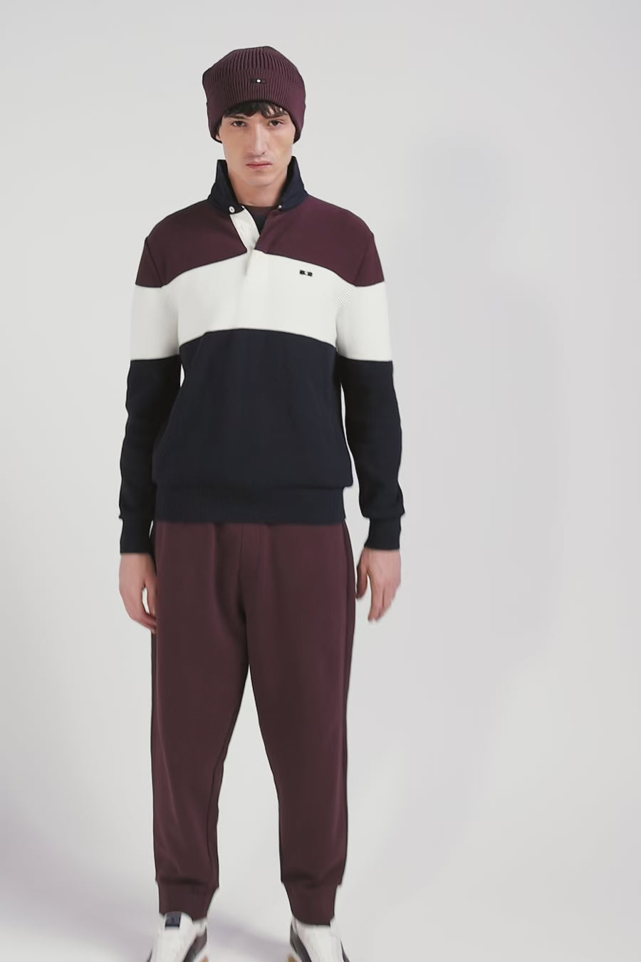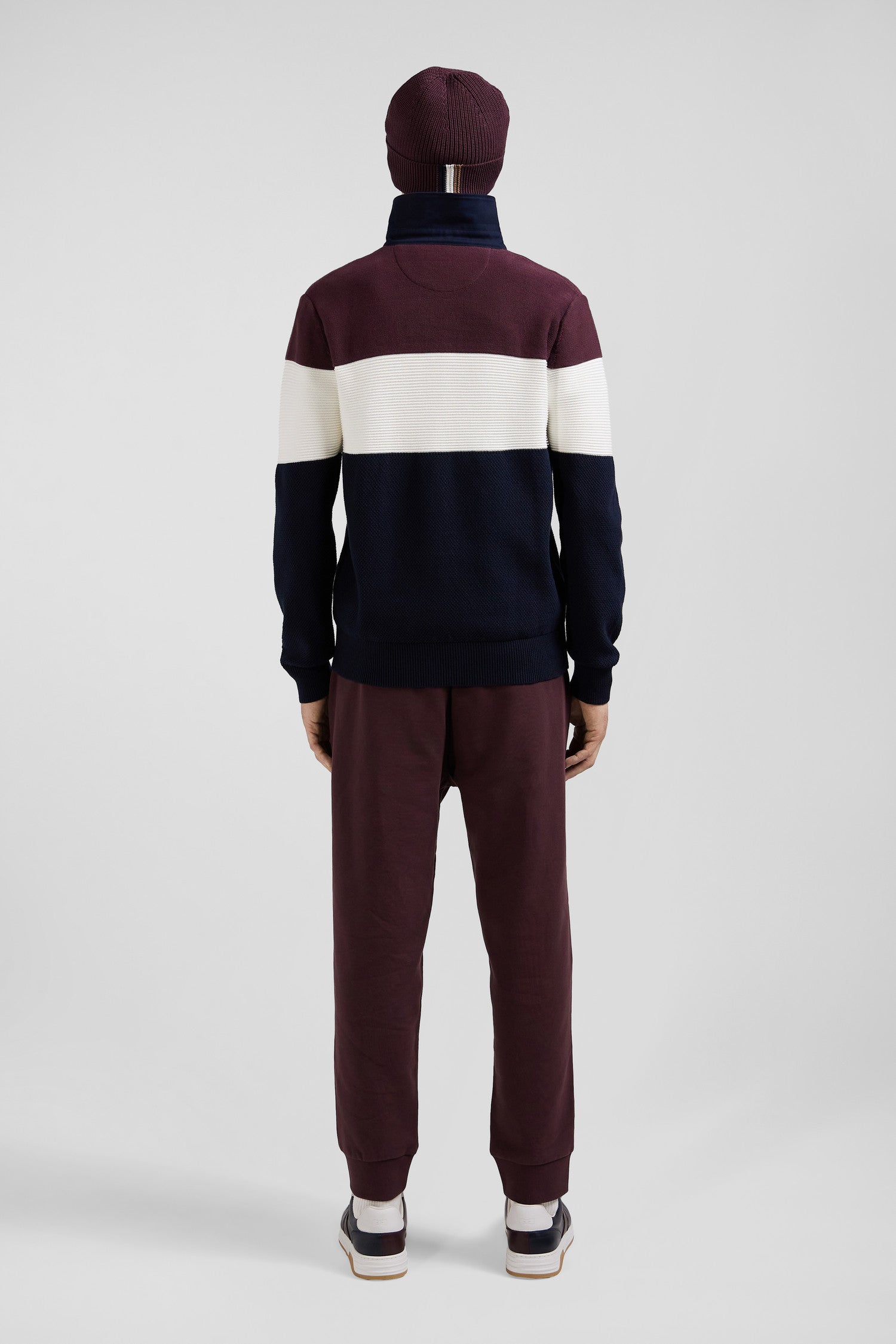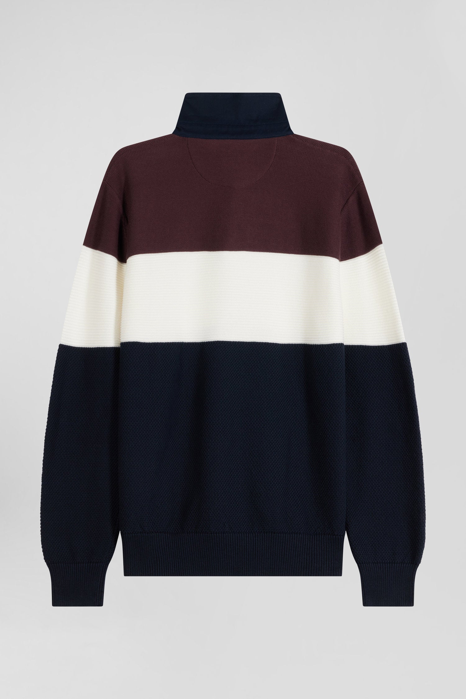 This sweater with twill jersey collar displays subtle sophistication with its contrasting interior stripes. Its jersey half-moon and tricolored ribbon knit enrich the interior, while the alternating textures created by the varied knitting (purl jersey stitches, Ottoman stitches and piqué) offer a captivating visual effect, combining style and comfort while drawing inspiration from our mythical rugby jerseys thanks to a cut and sewn assembly.