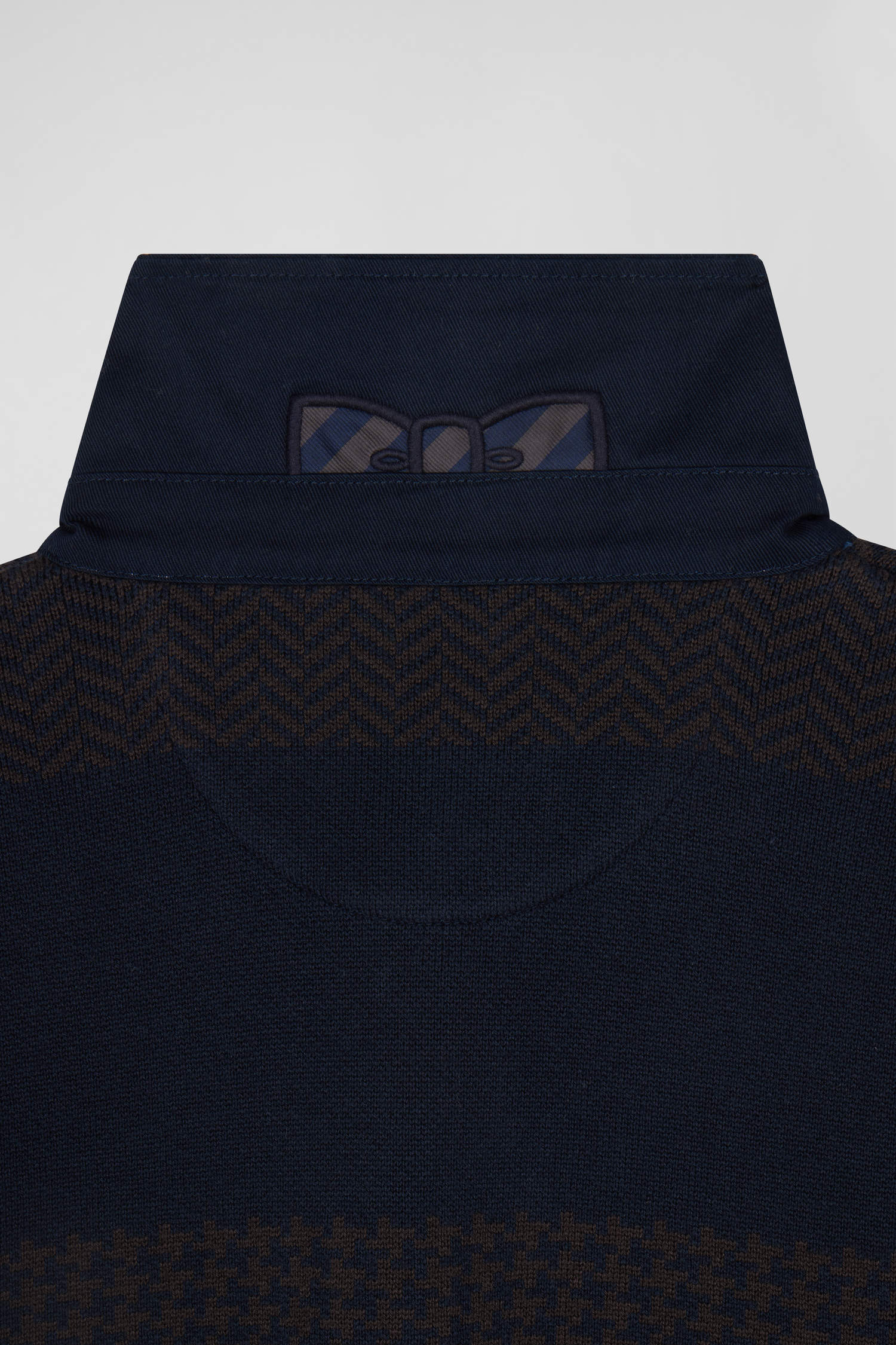 Regular brown striped cotton jumper with houndstooth jacquard and rugby shirt collar